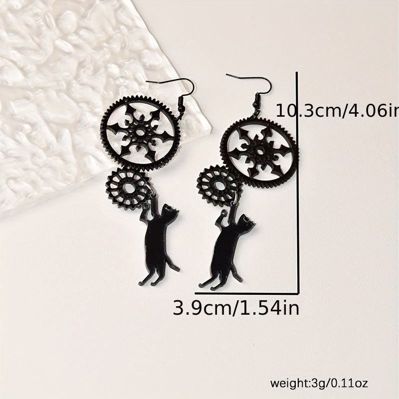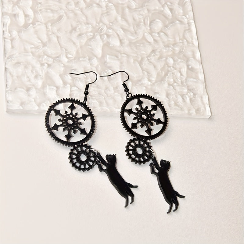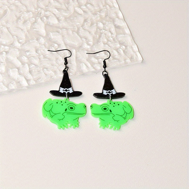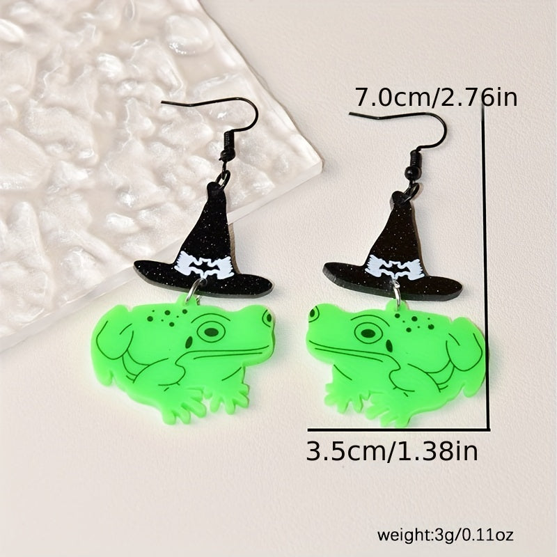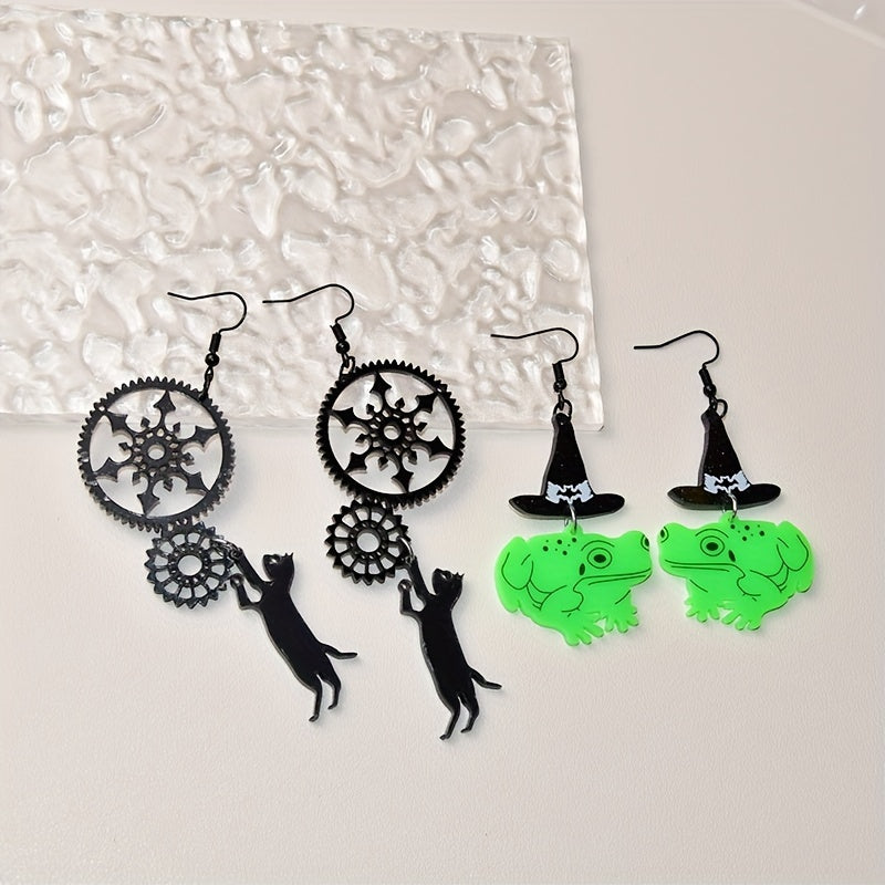 These creative dangle earrings feature a unique design inspired by Halloween, frogs, cats, and gears. Made of acrylic, they are perfect for making a statement with your style. Ideal as a gift for females.