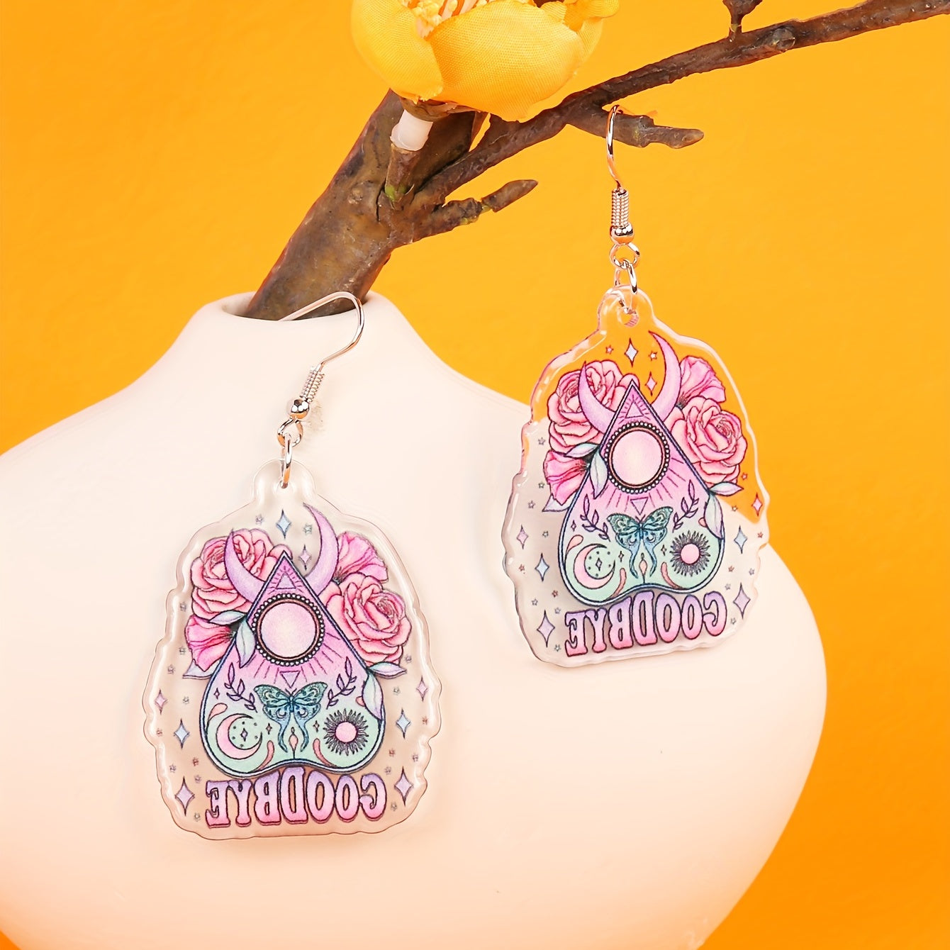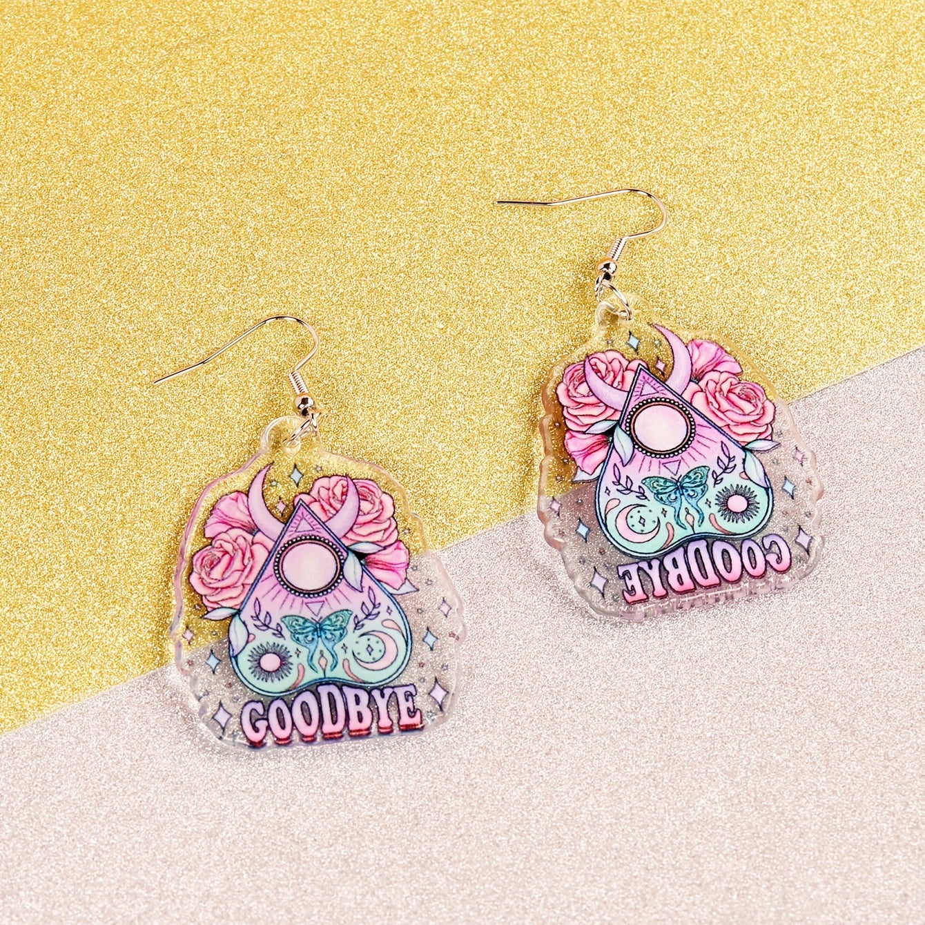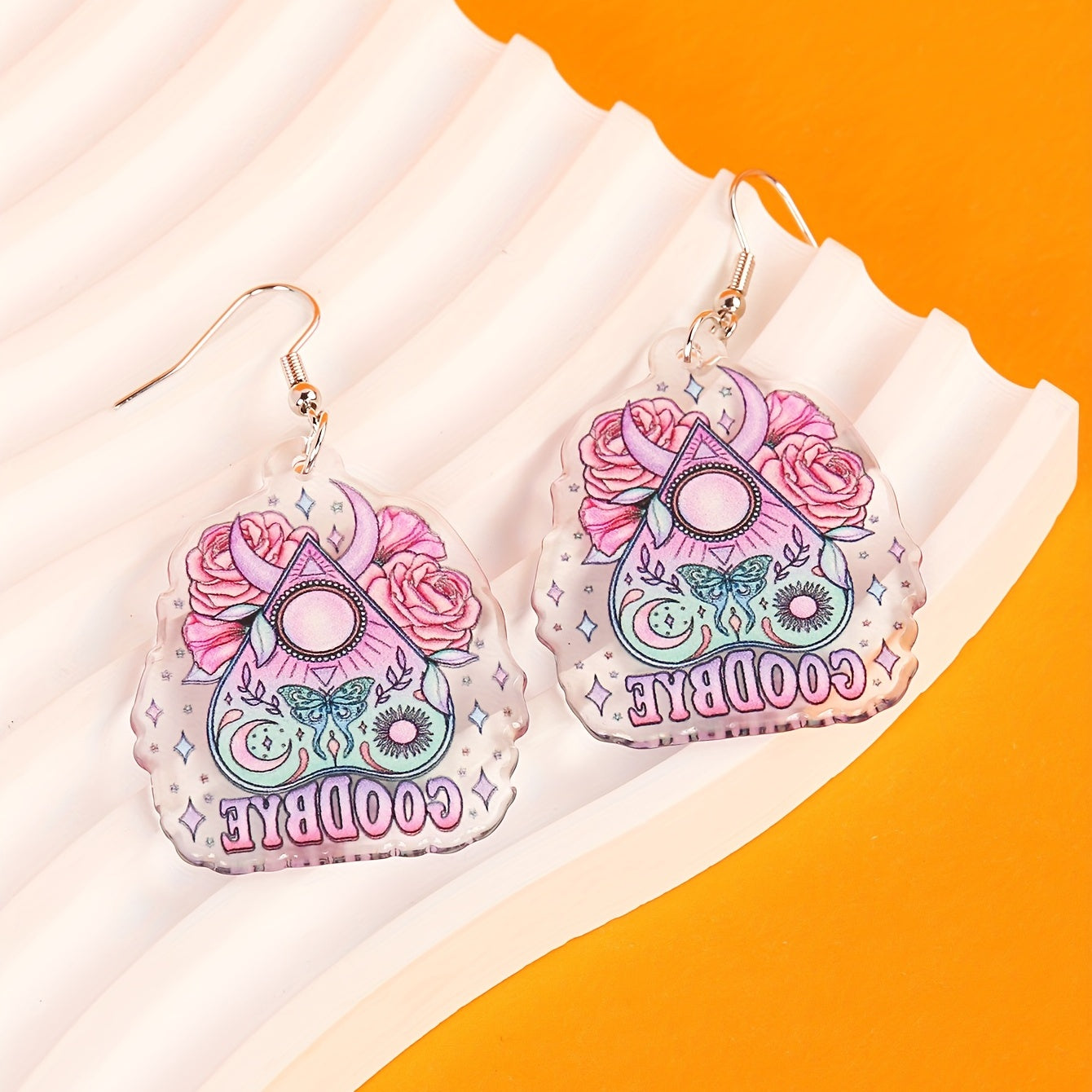 These dangle earrings feature a spooky Halloween horror design with butterfly and flower motifs in a retro goth style. Made of acrylic jewels for a unique look.