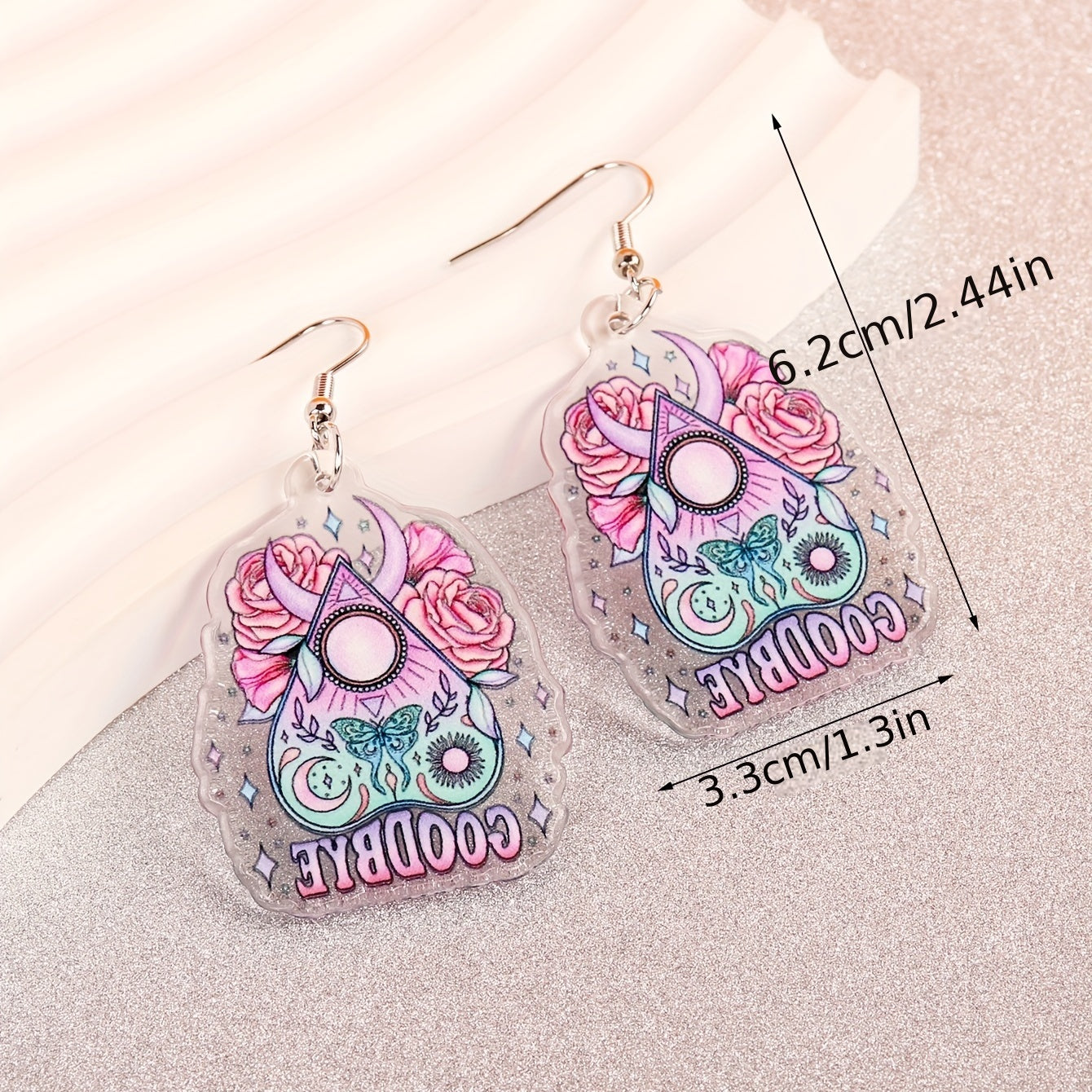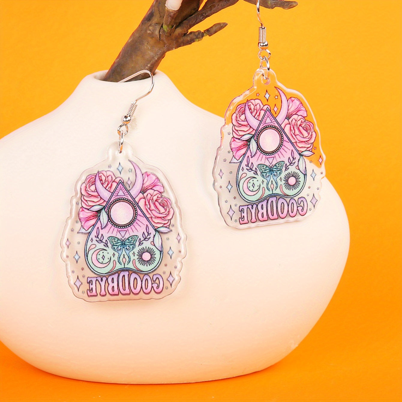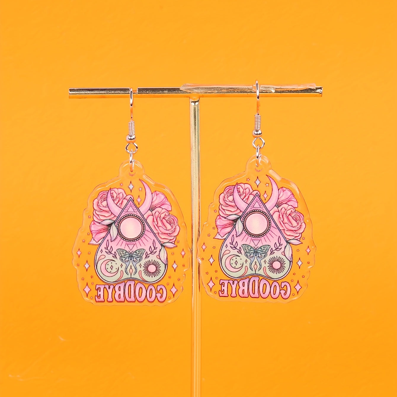 These dangle earrings feature a spooky Halloween horror design with butterfly and flower motifs in a retro goth style. Made of acrylic jewels for a unique look.