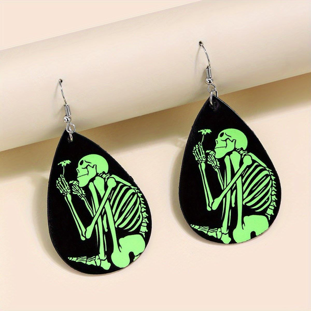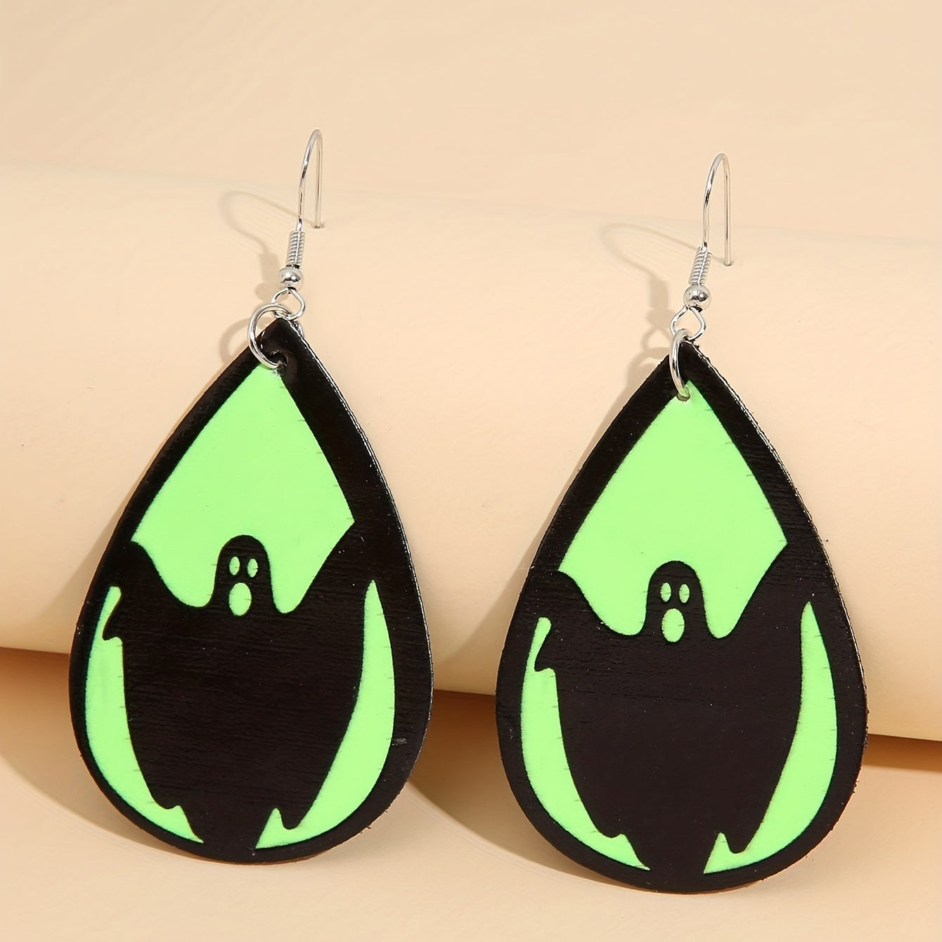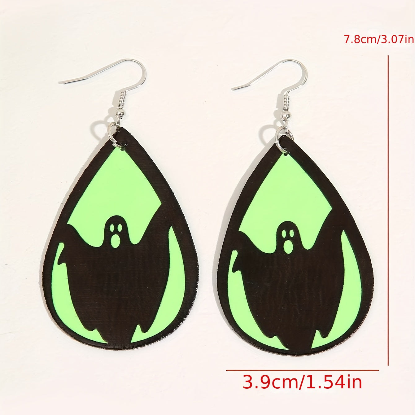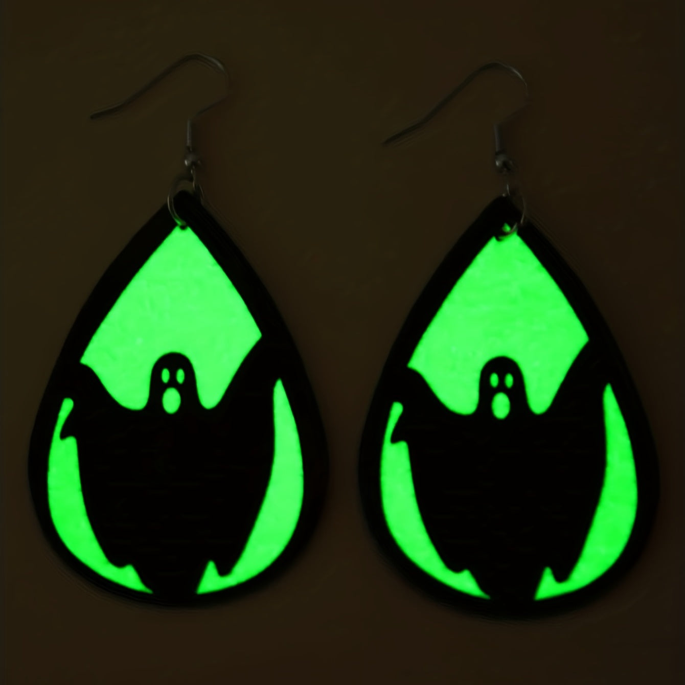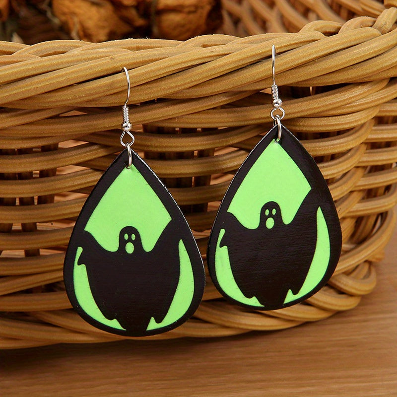 Add a spooky touch to your outfit with these Halloween-themed teardrop earrings featuring ghost, bat, and skull prints. Made of PU leather, these earrings glow in the dark, making them a creative gift idea.