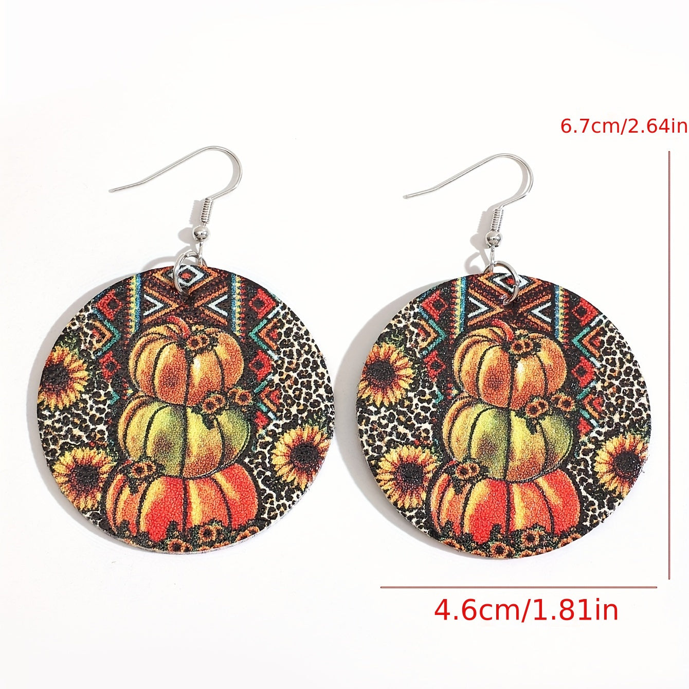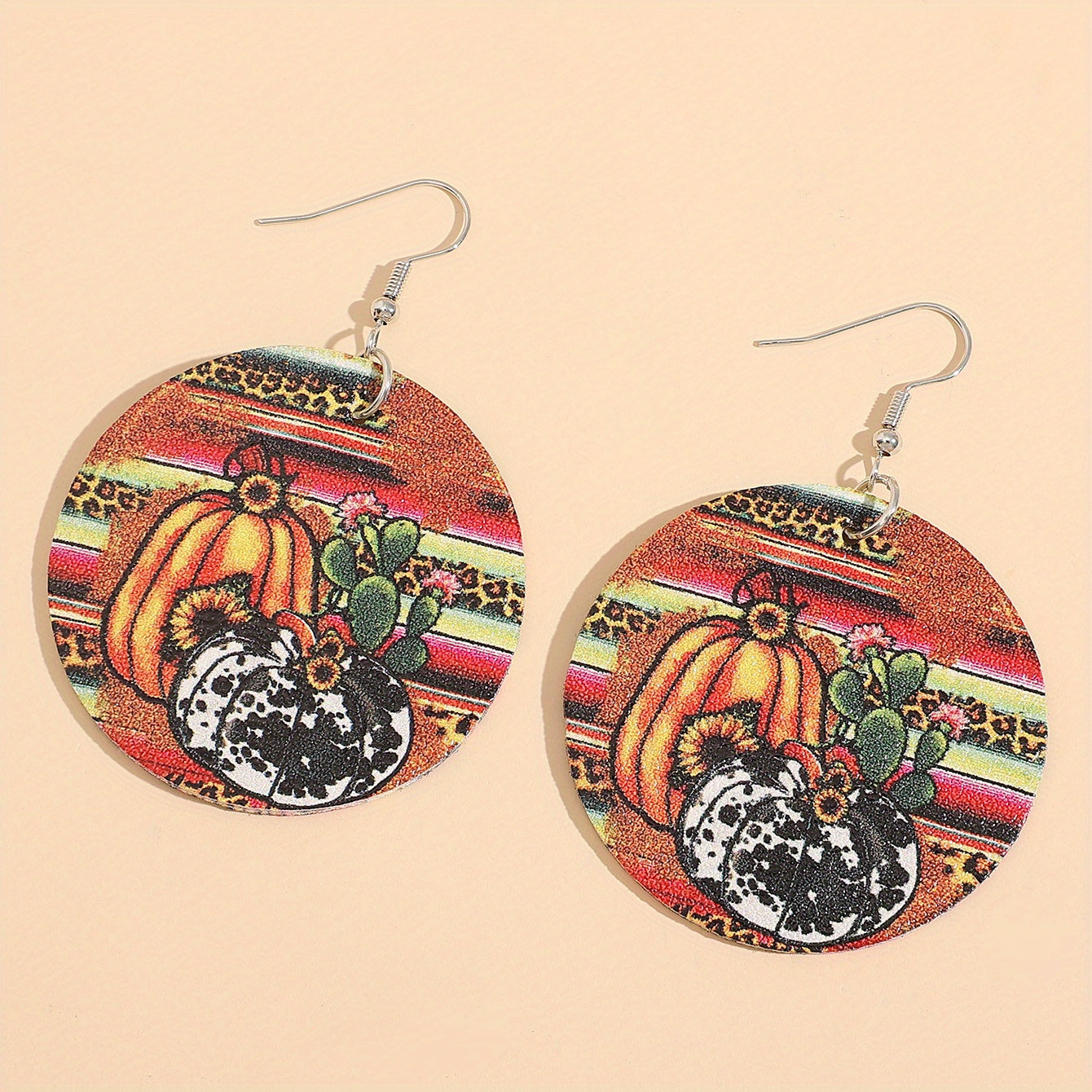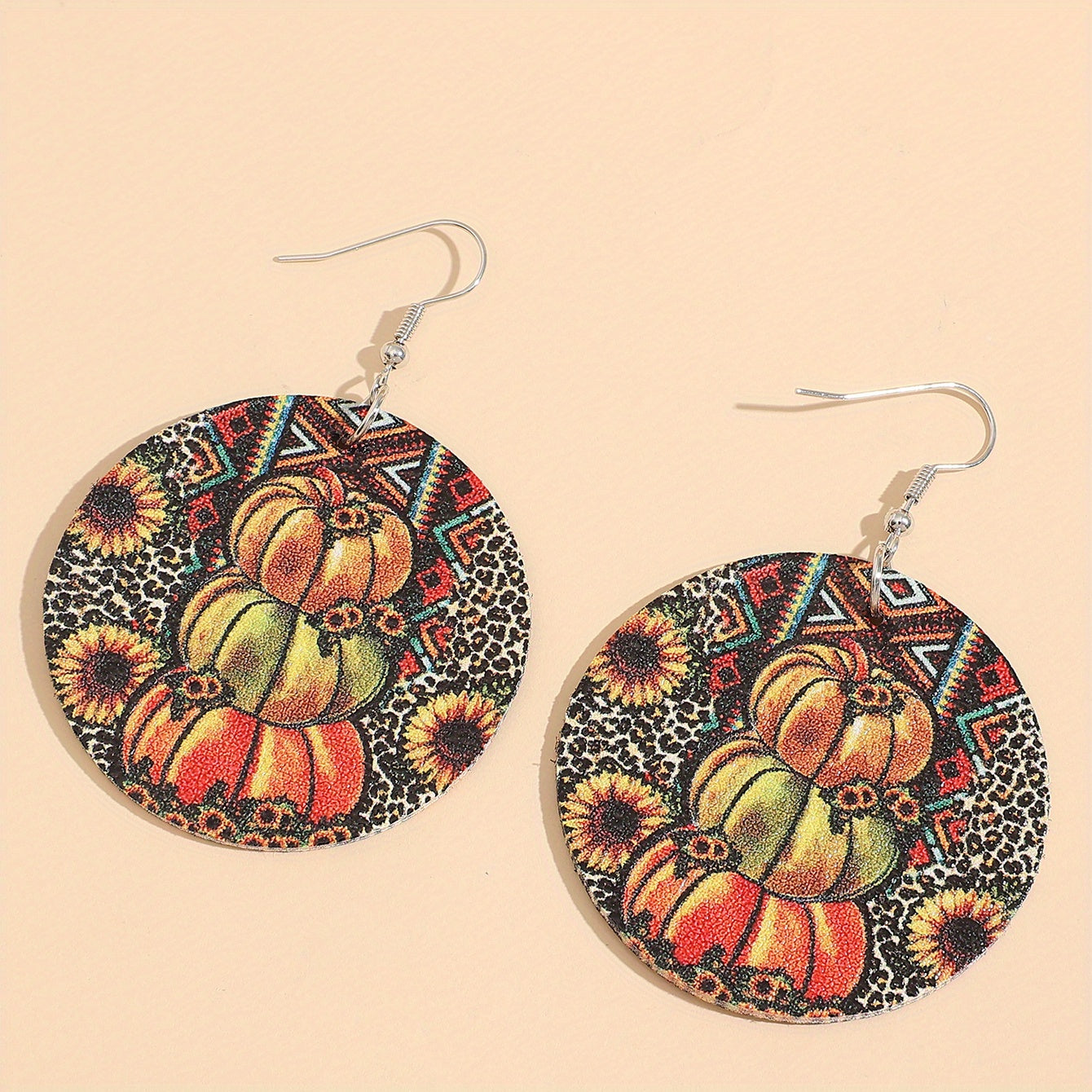 These round dangle earrings feature a fun Halloween-themed design with pumpkins, sunflowers, and leopard patterns. Made from PU leather, these earrings are a stylish addition to any outfit.