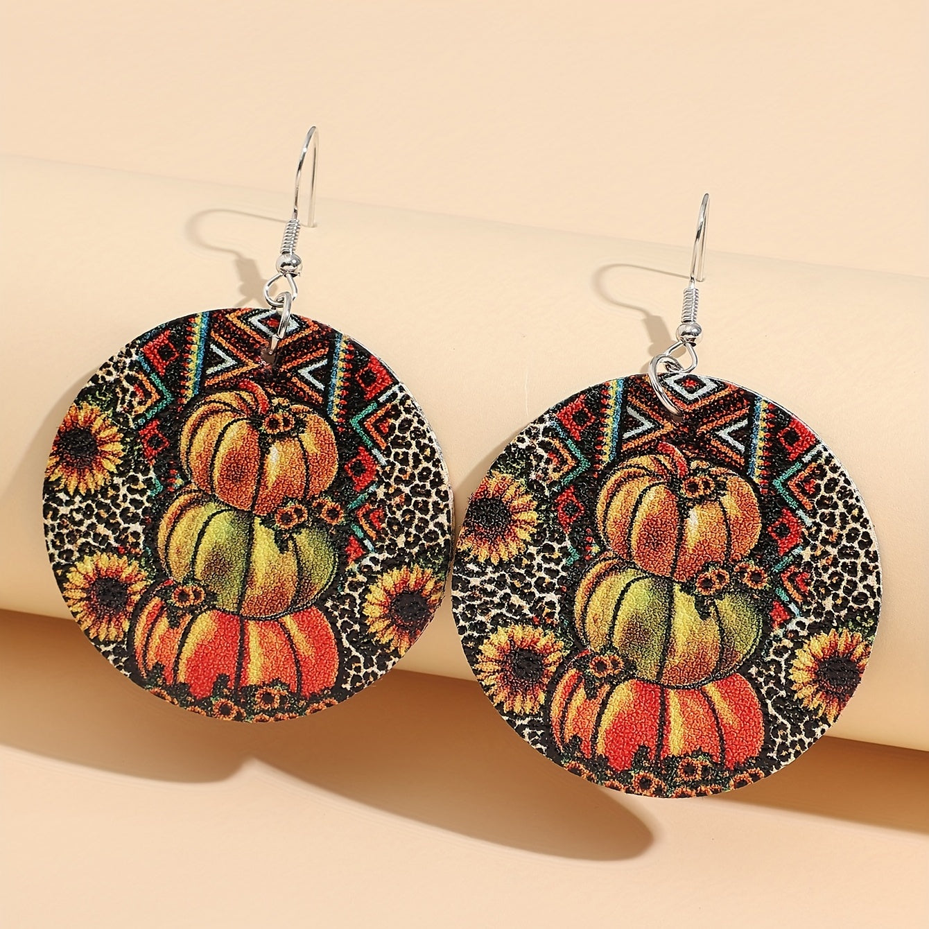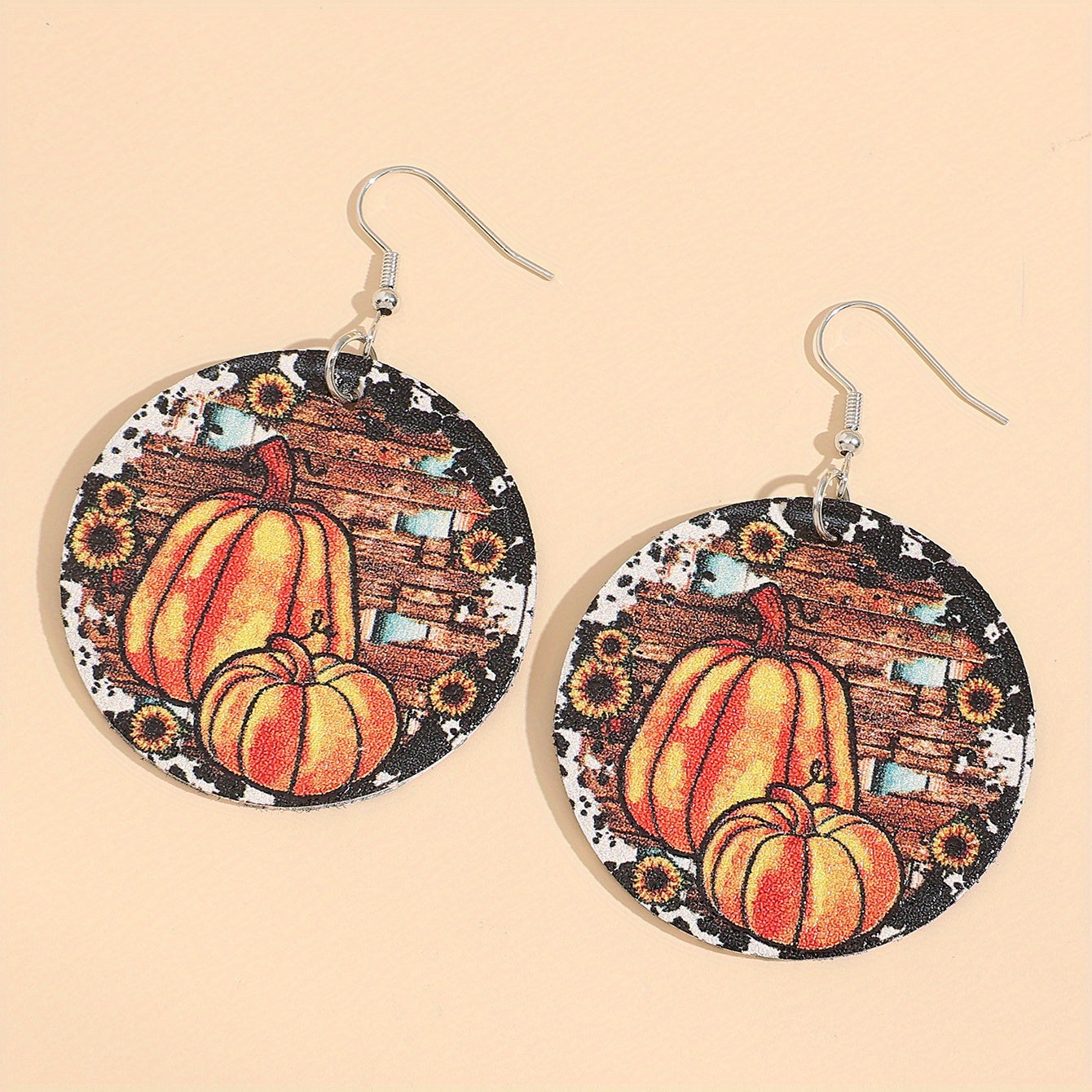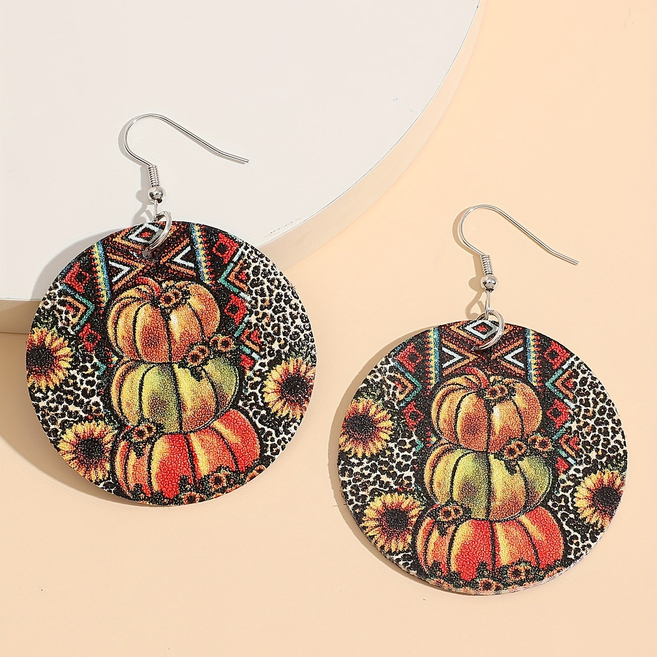 These round dangle earrings feature a fun Halloween-themed design with pumpkins, sunflowers, and leopard patterns. Made from PU leather, these earrings are a stylish addition to any outfit.