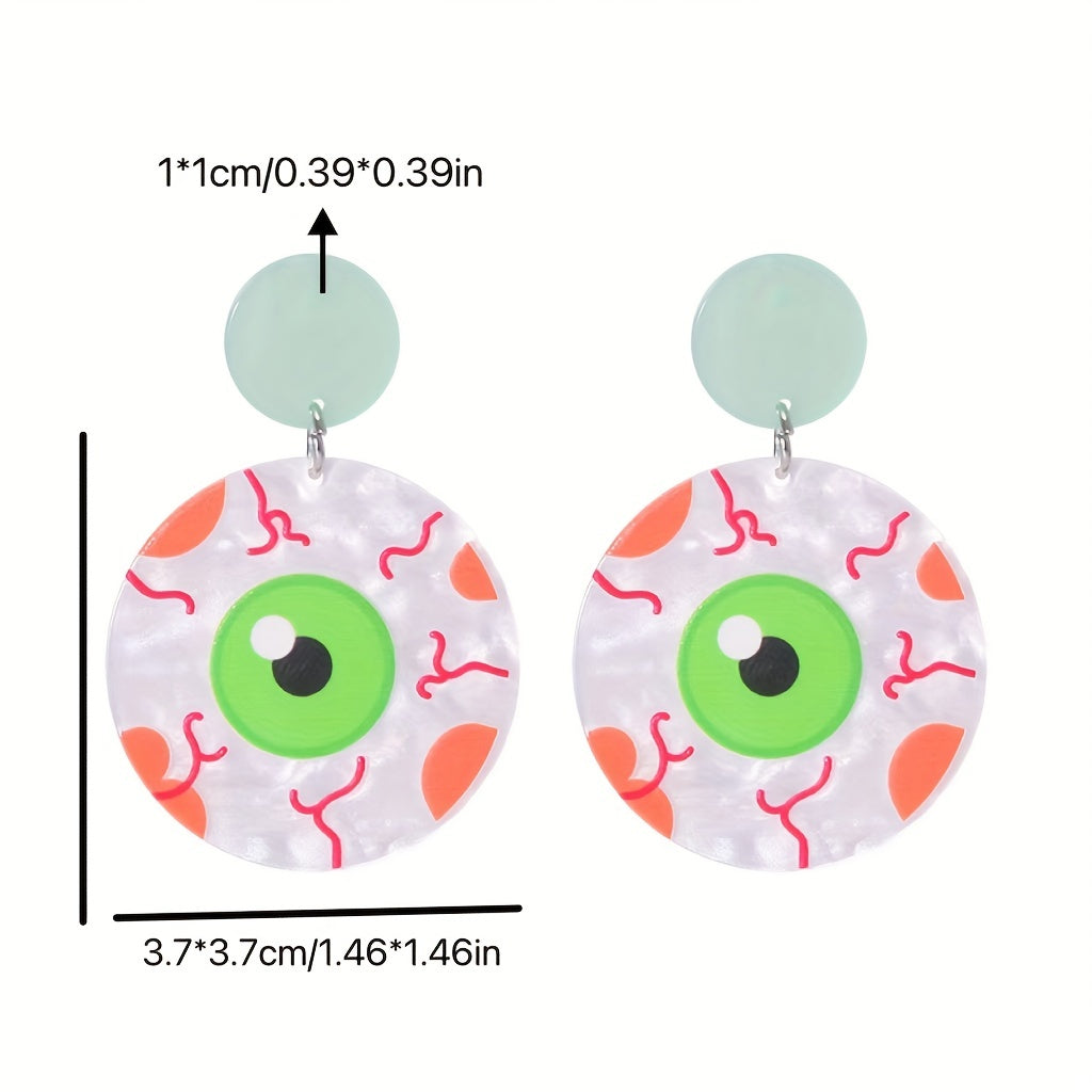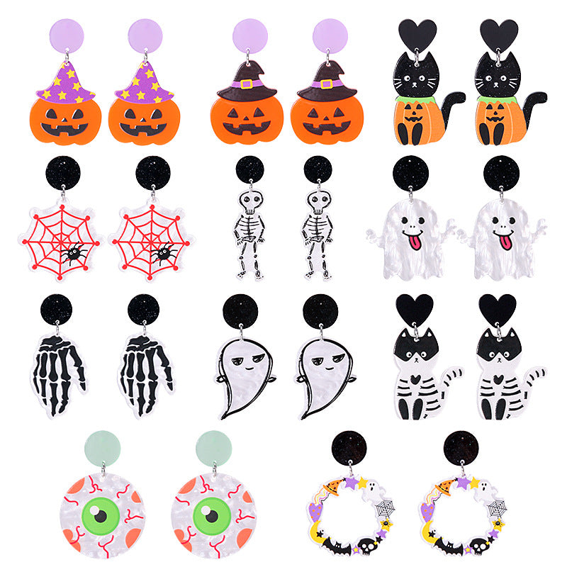 These funny Halloween-themed dangle earrings feature eye cat, pumpkin, spider web, and skull designs. They are made of acrylic material, perfect for adding a spooky touch to your outfit. Ideal gift for females.