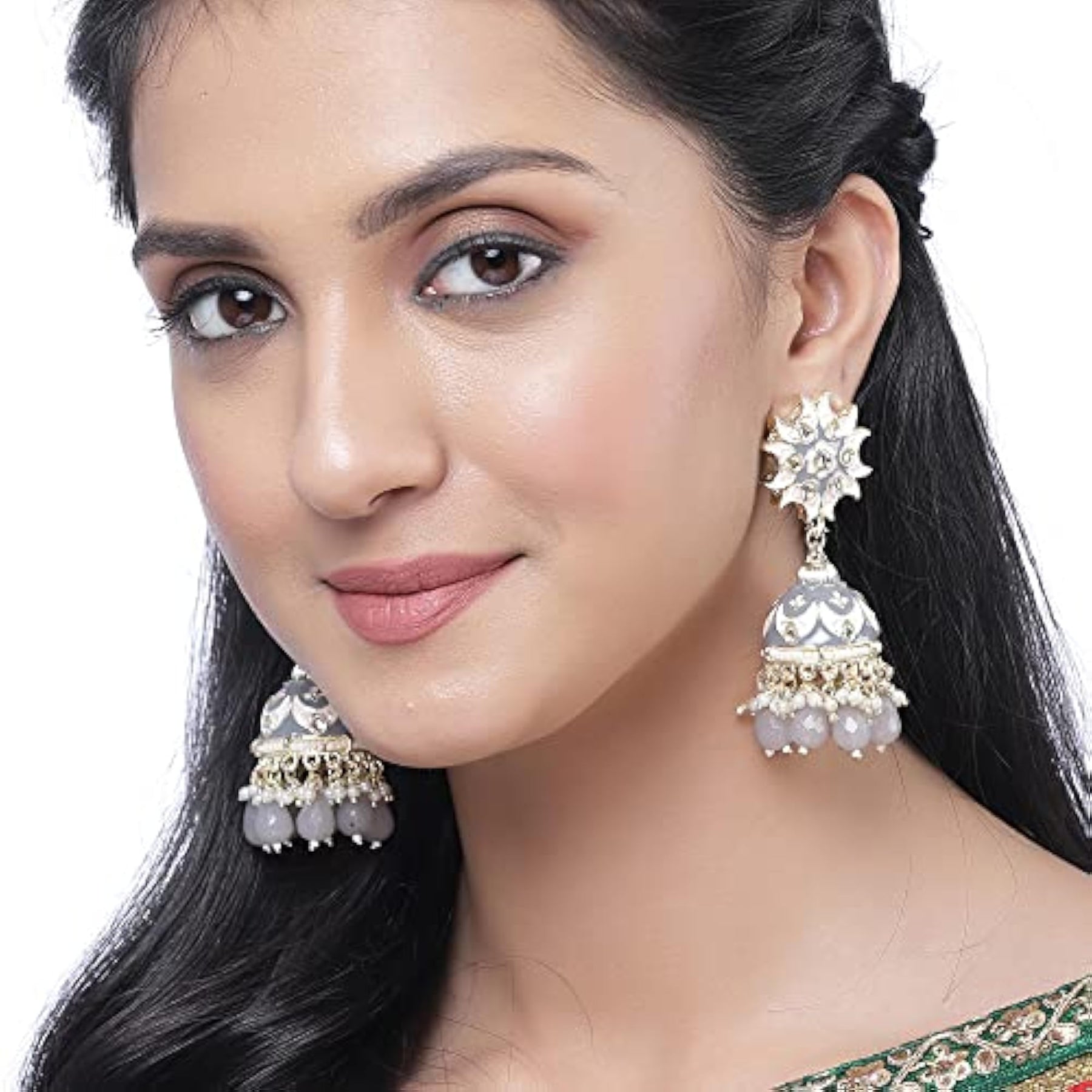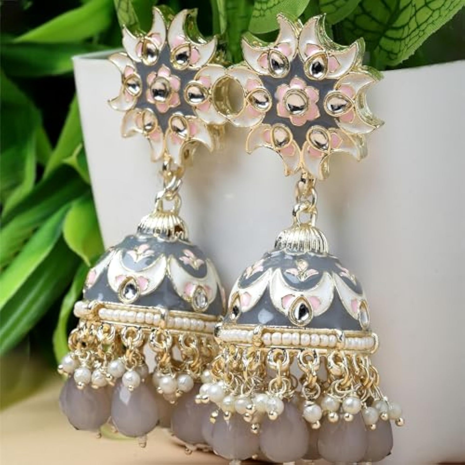 Elegant gold-plated jhumka earrings adorned with kundan and pearls. Hand-painted crescent shape adds a touch of sophistication.
