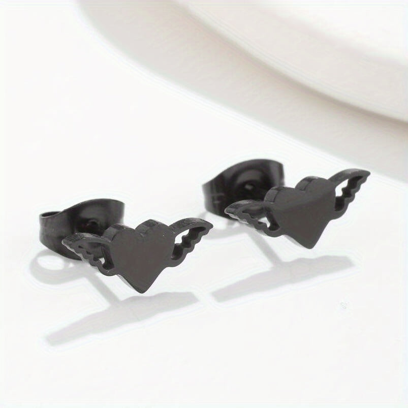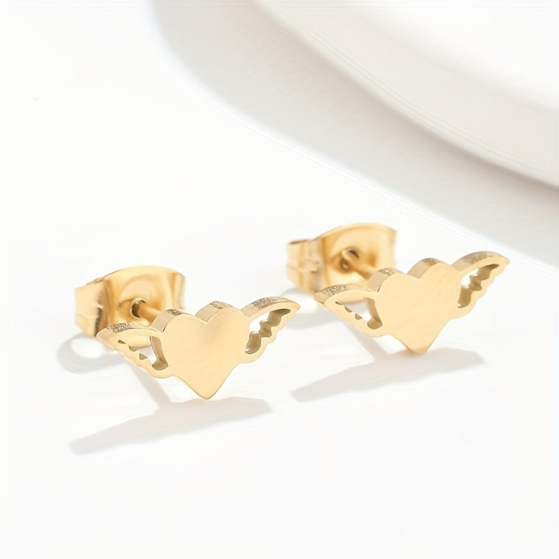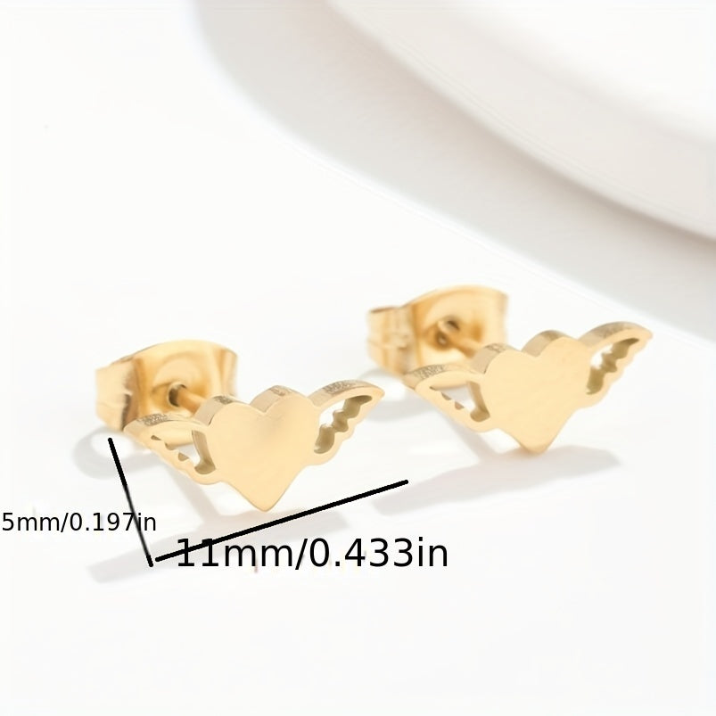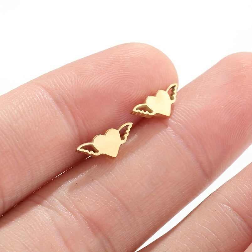 These small stainless steel earrings feature a heart and angel wing design, perfect for men. The wing shape studs are stylish and durable.