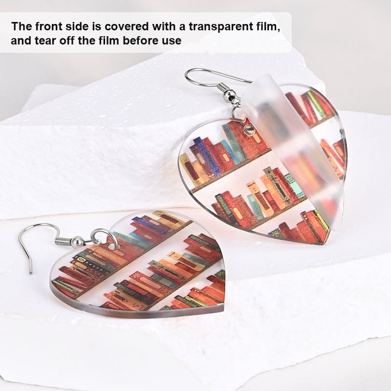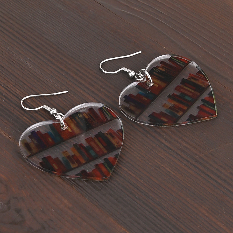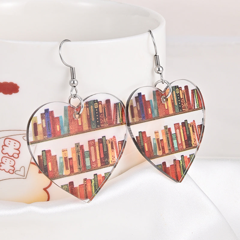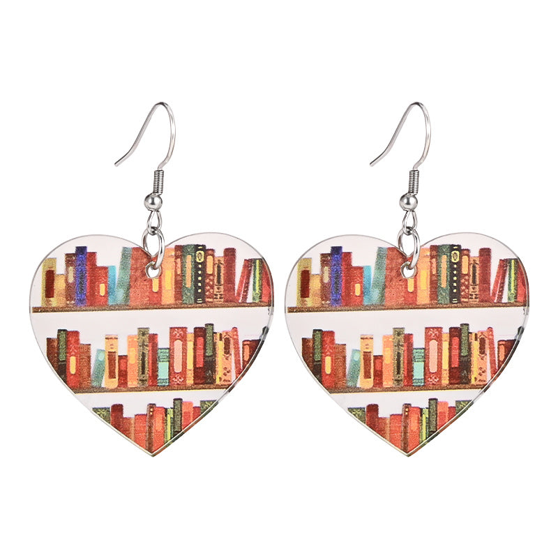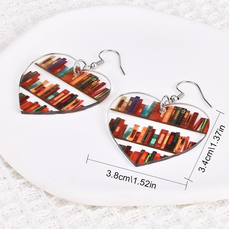 These heart shape earrings with bookshelf print are perfect gifts for teachers and students. Suitable for daily casual wear.