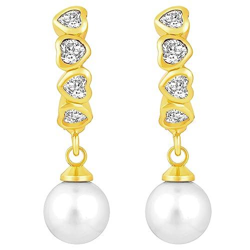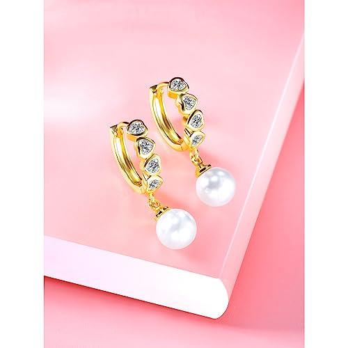 Elegant hoop earrings featuring heart-shaped pearl drops with sparkling cubic zirconia accents.