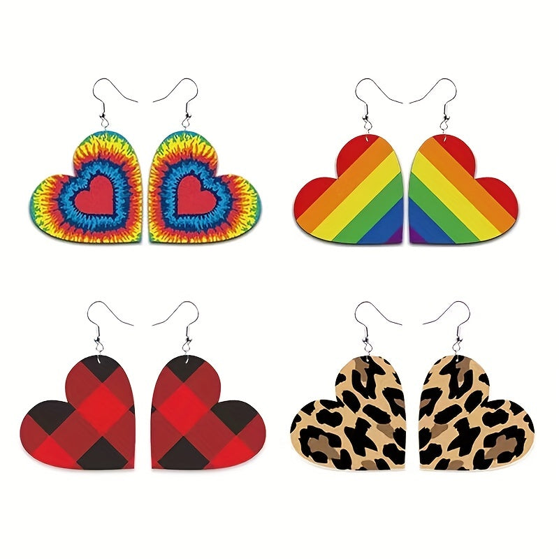 • Heart shape dangle earrings with rainbow leopard plaid pattern