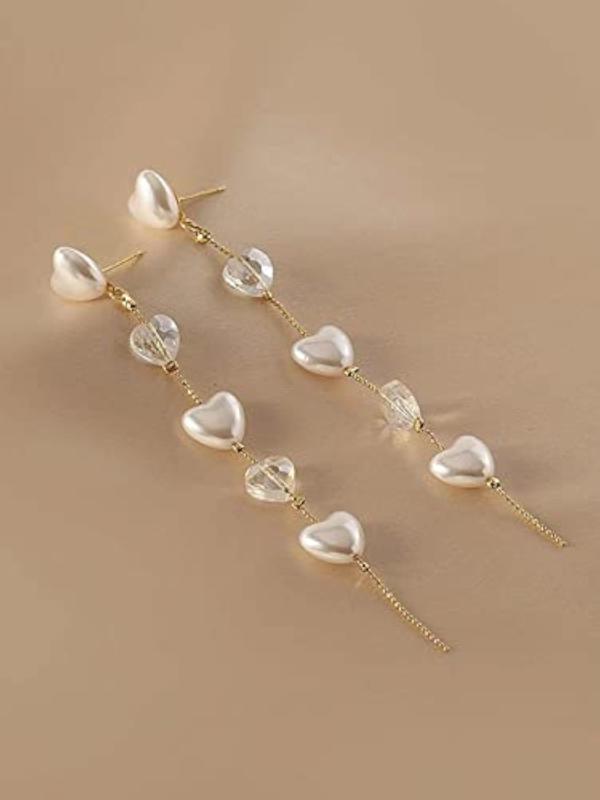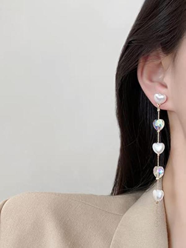 These stunning earrings feature a combination of pearls and stones, with hearts hanging from a long chain. Perfect for adding a touch of elegance to any outfit.