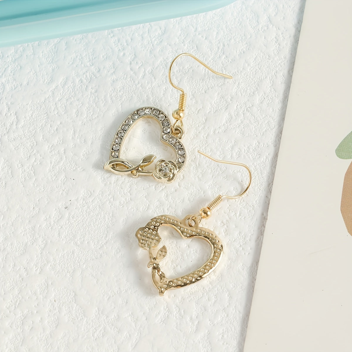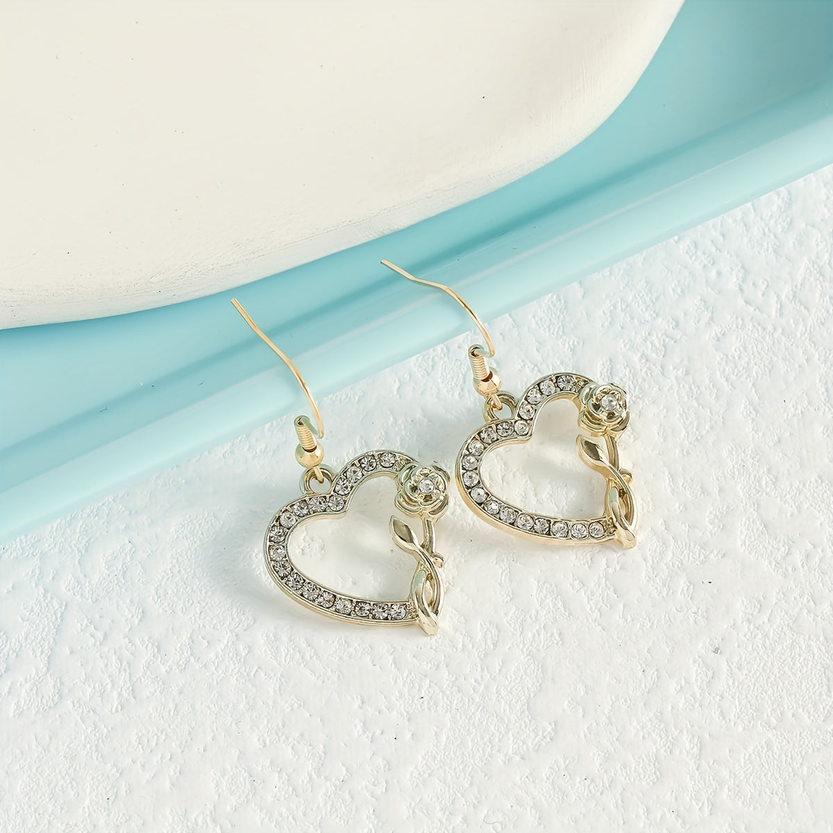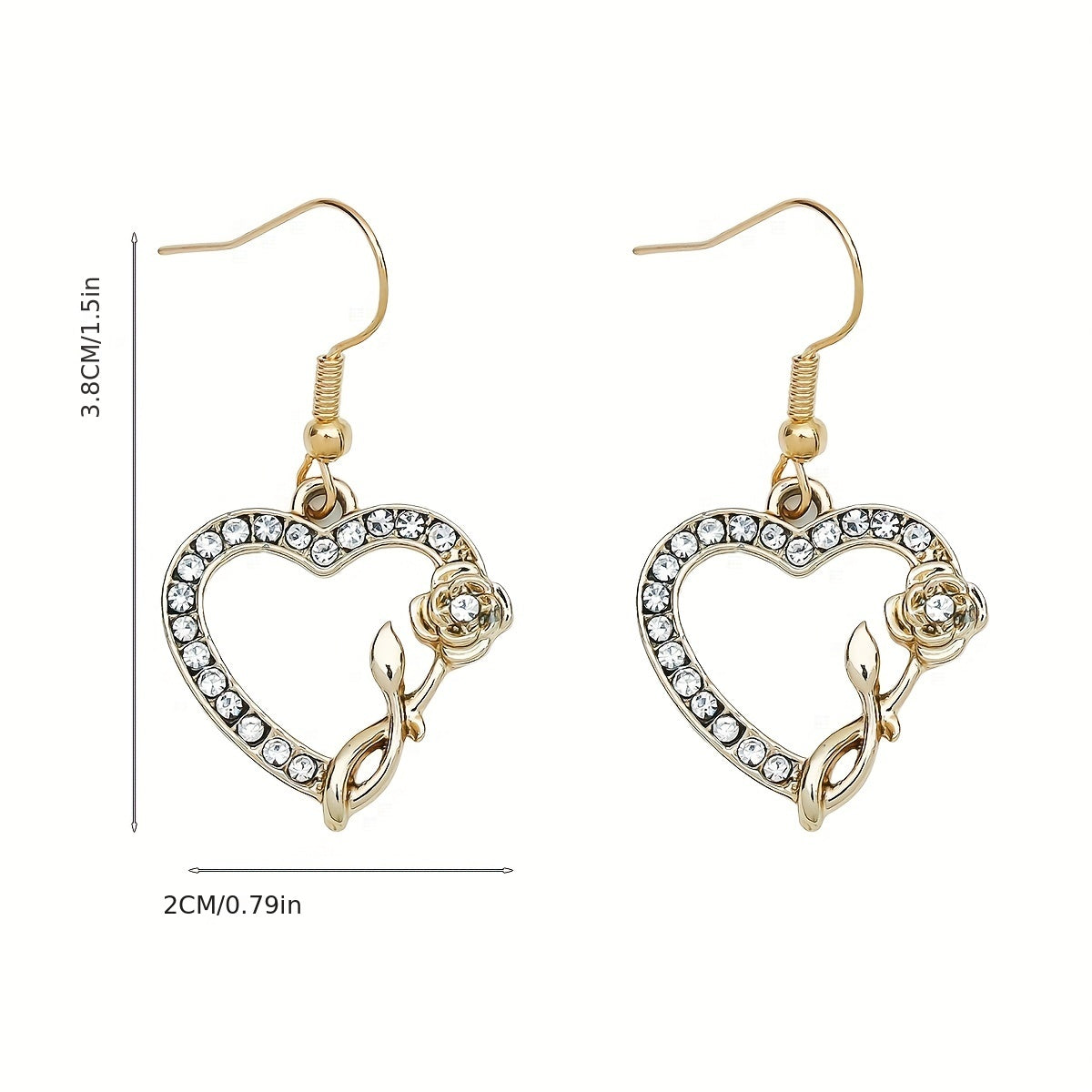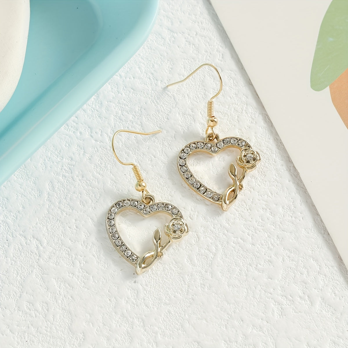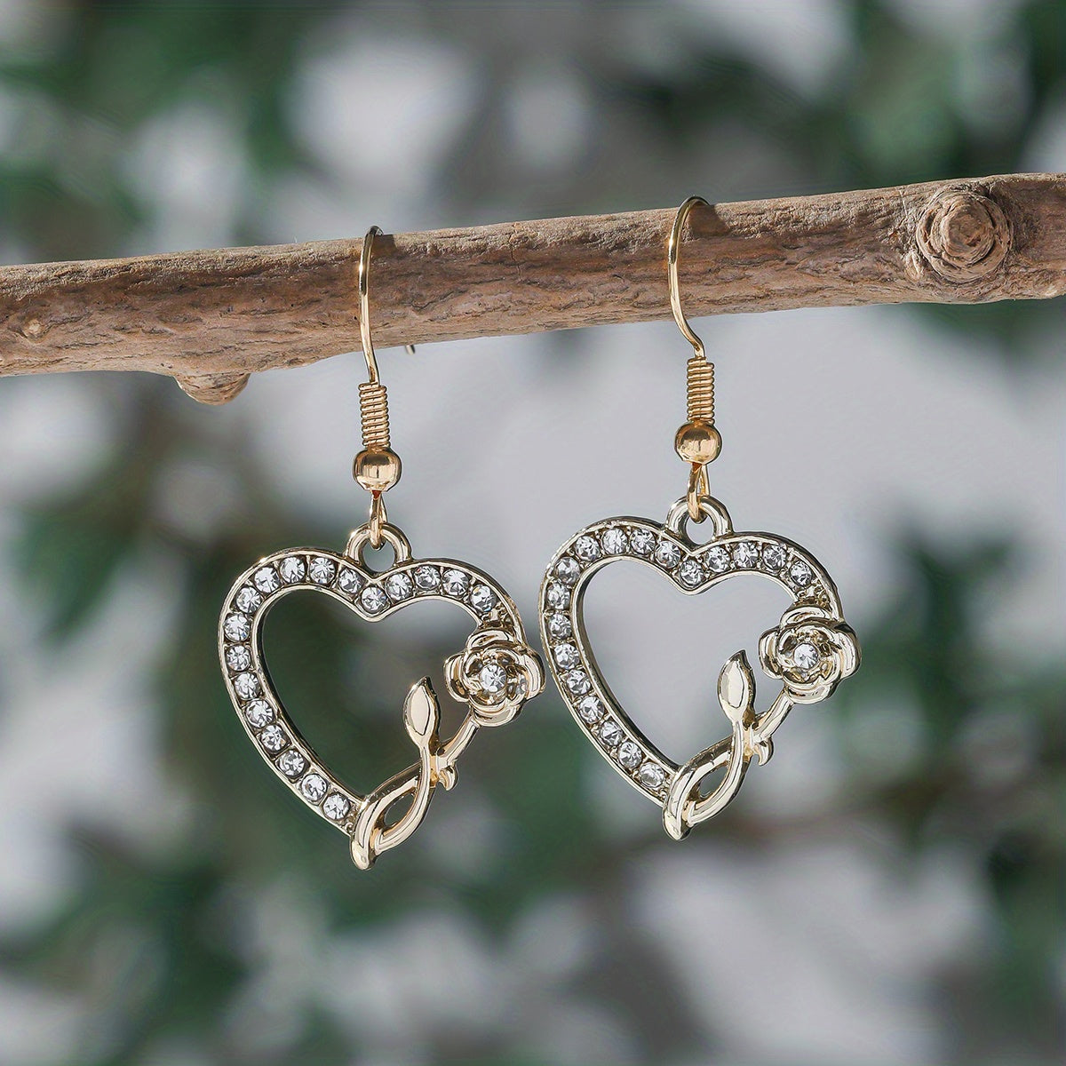 Elegant and sexy dangle earrings featuring a hollow heart rose design with rhinestone decoration. Made from high-quality zinc alloy, this jewelry makes a perfect gift for women.