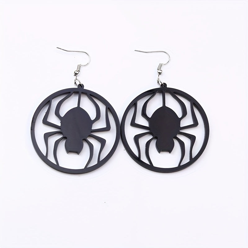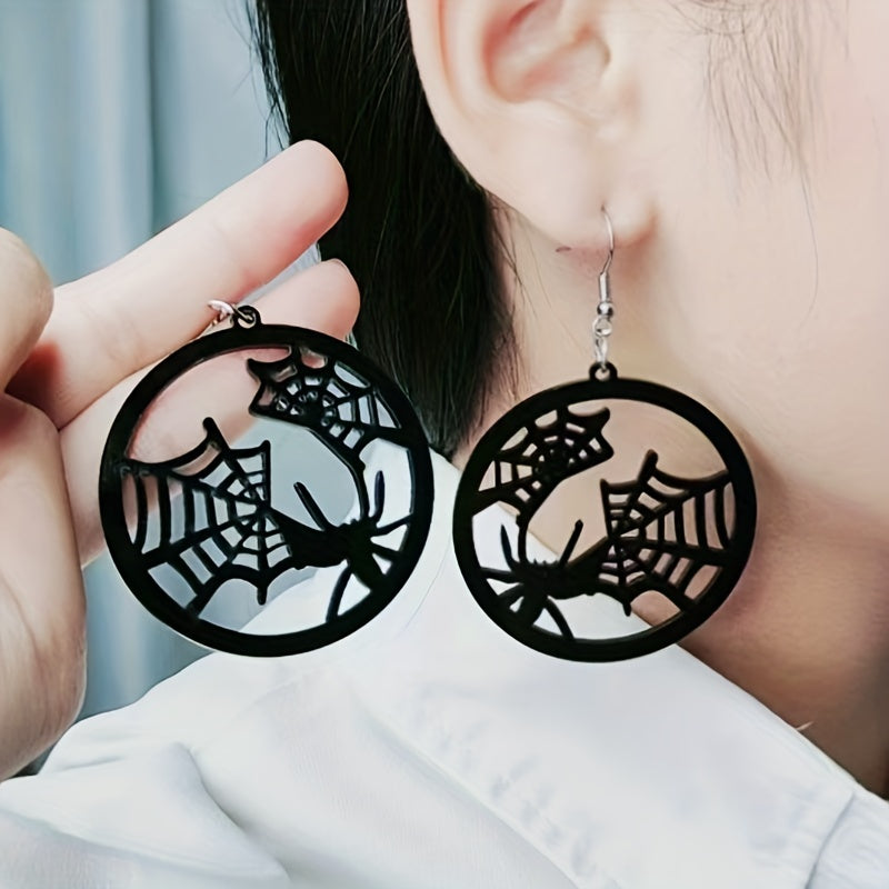 Add a spooky touch to your outfit with these Halloween-themed earrings. Featuring a spider web design with dangling spiders, these earrings are perfect for a retro boho look.