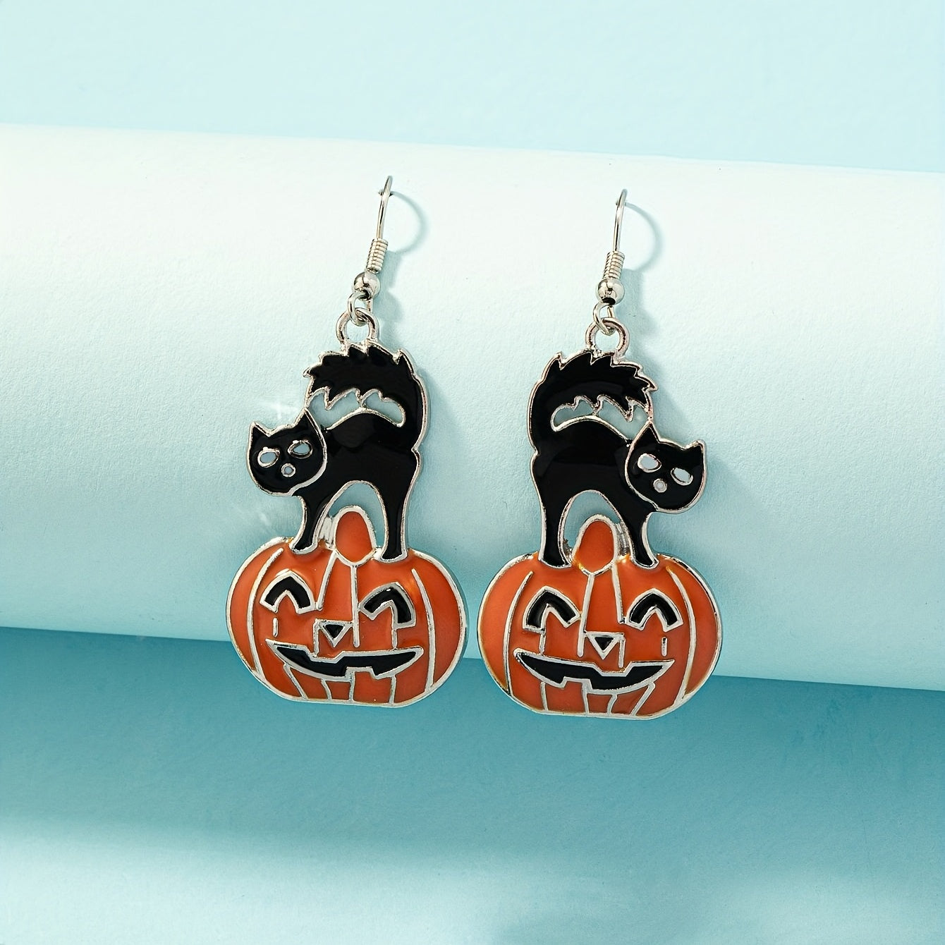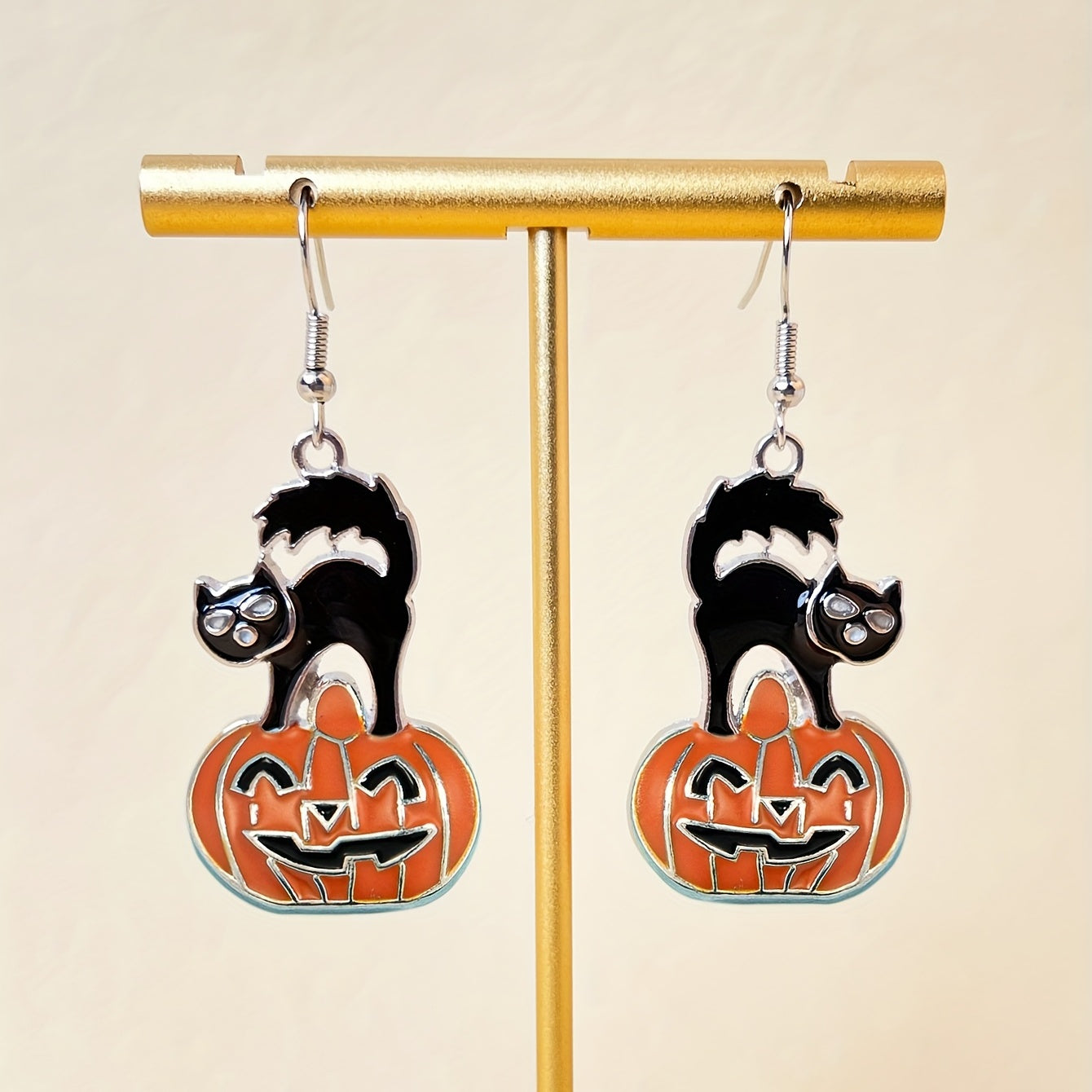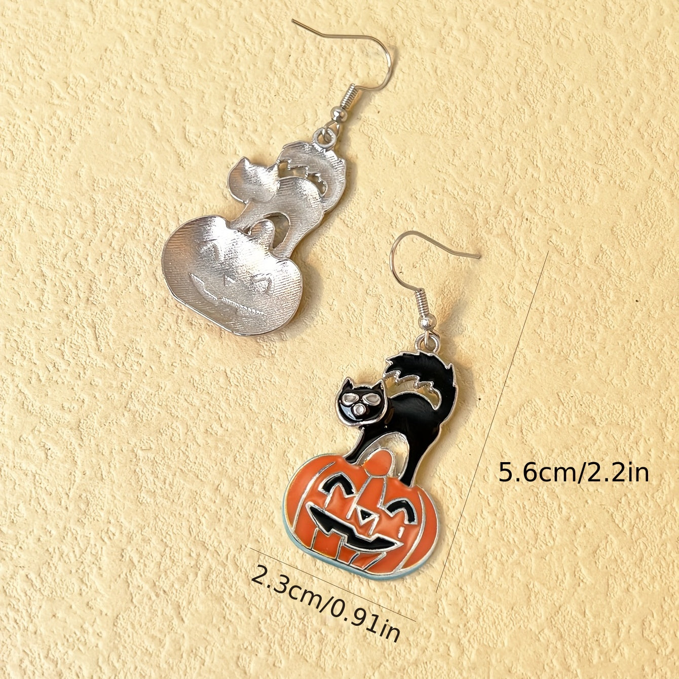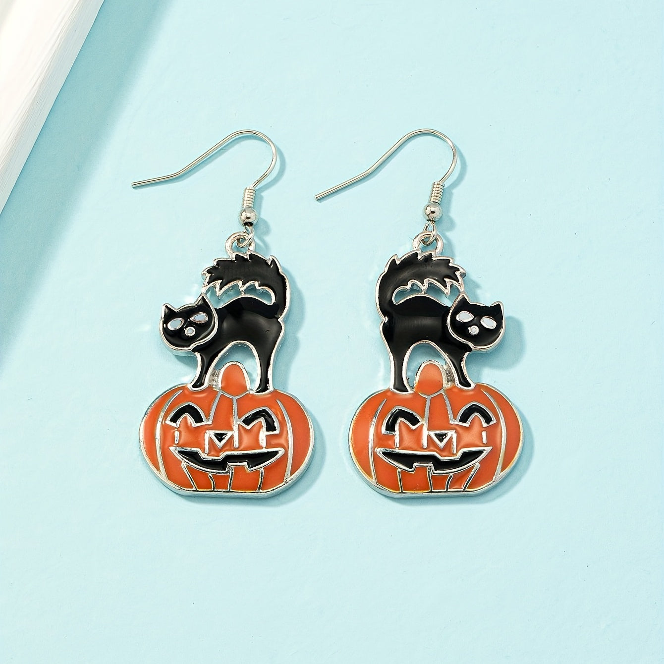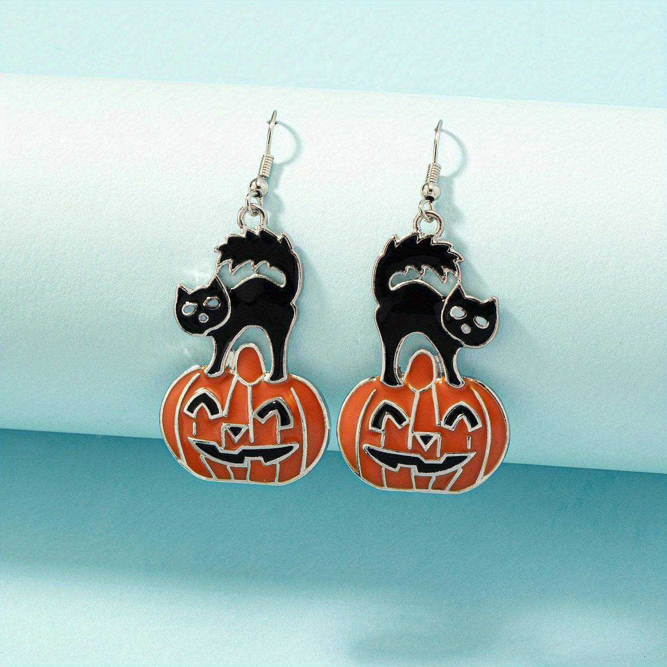 These cute enamel dangle earrings feature a horror cat and pumpkin design, perfect for Halloween. Made of zinc alloy, these cartoon-style earrings are a fun and festive accessory.