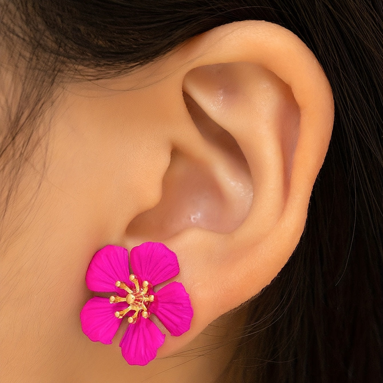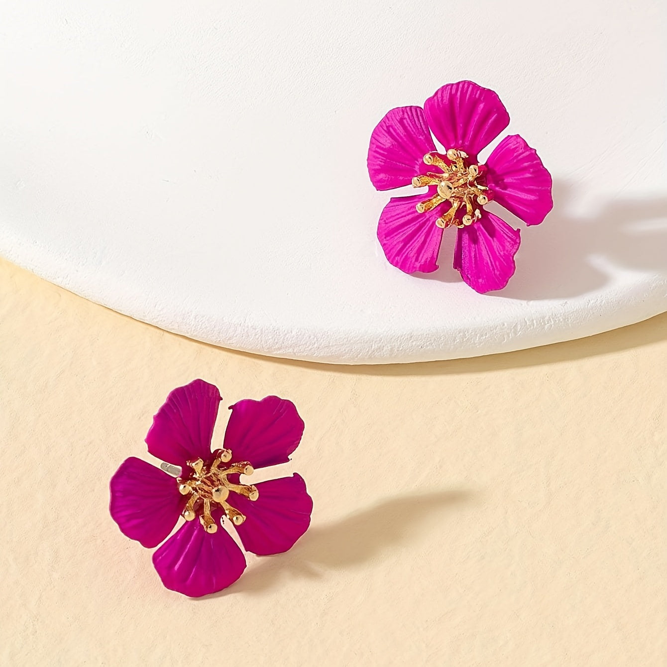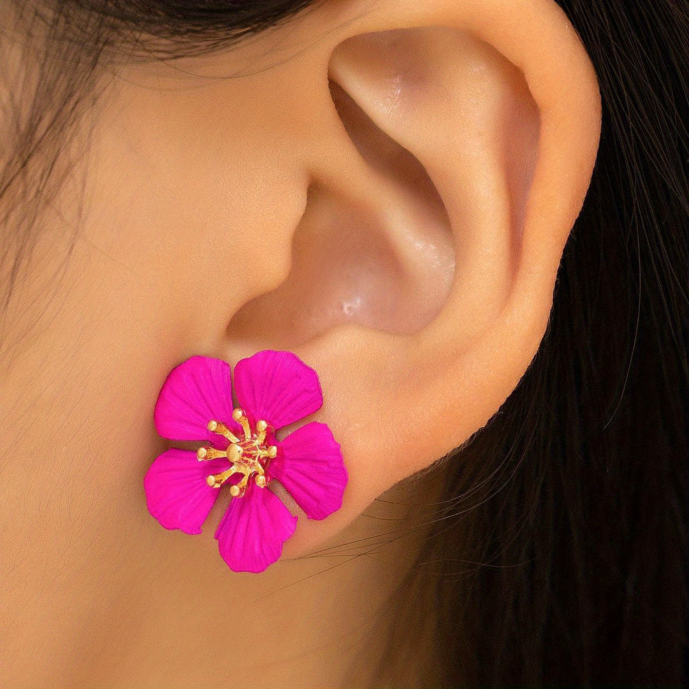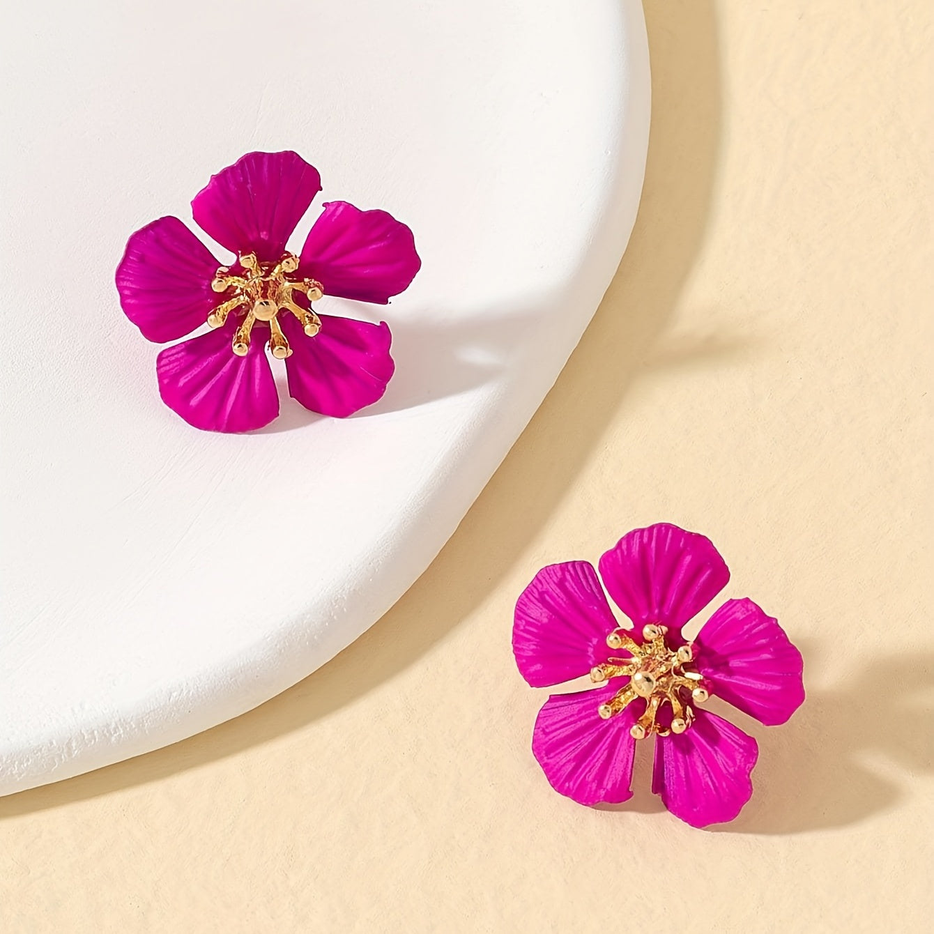 Elevate your style with these vocation-inspired hot pink flower stud earrings. Made of alloy with 18K gold plating, these delicate earrings make a perfect gift for any fashion-forward female.