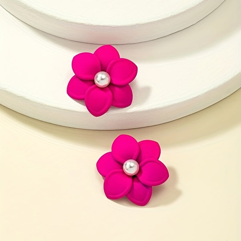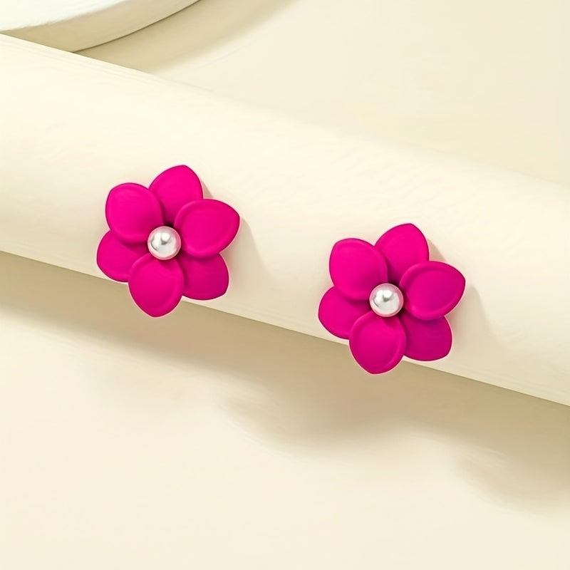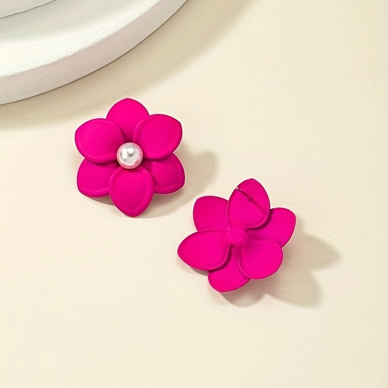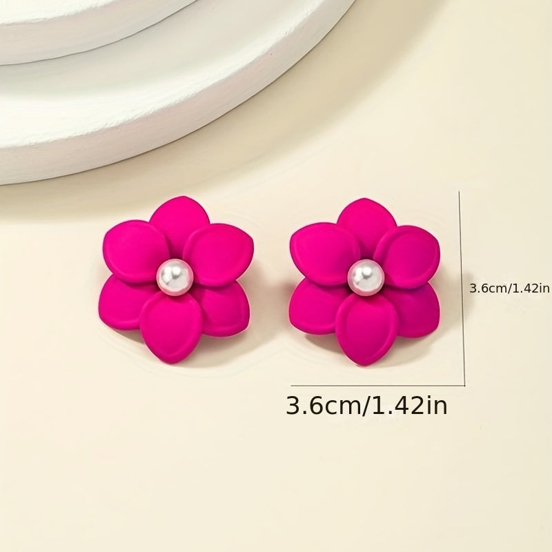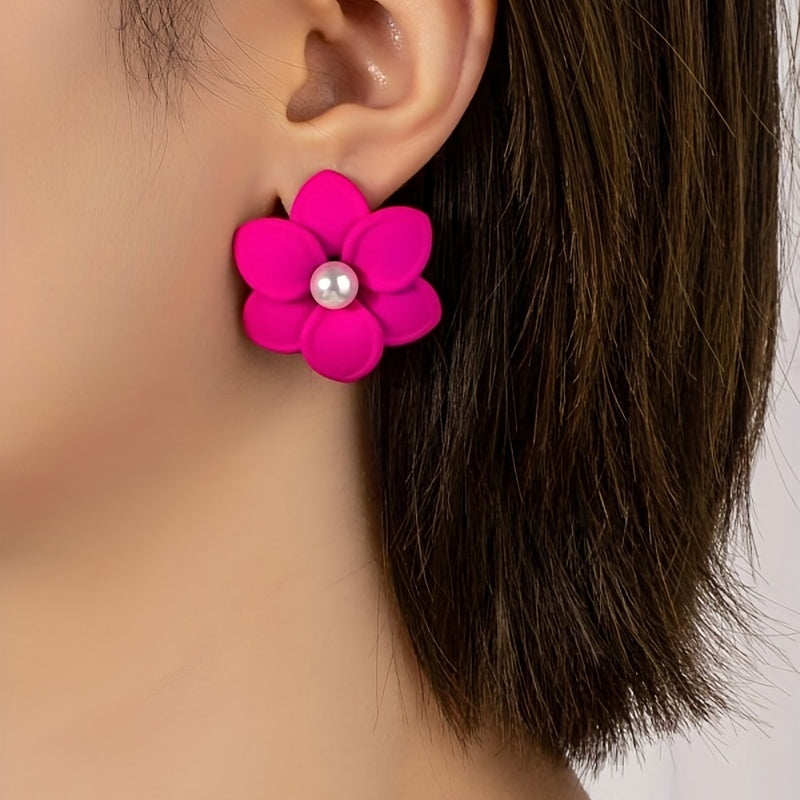 Add a touch of sexy style with these delicate hot pink flower stud earrings featuring faux pearl decoration. Perfect as a gift for females.