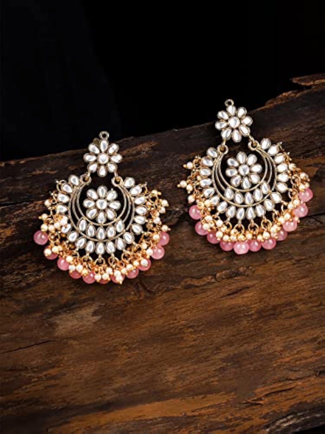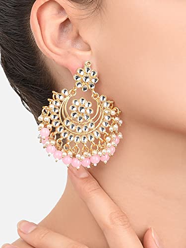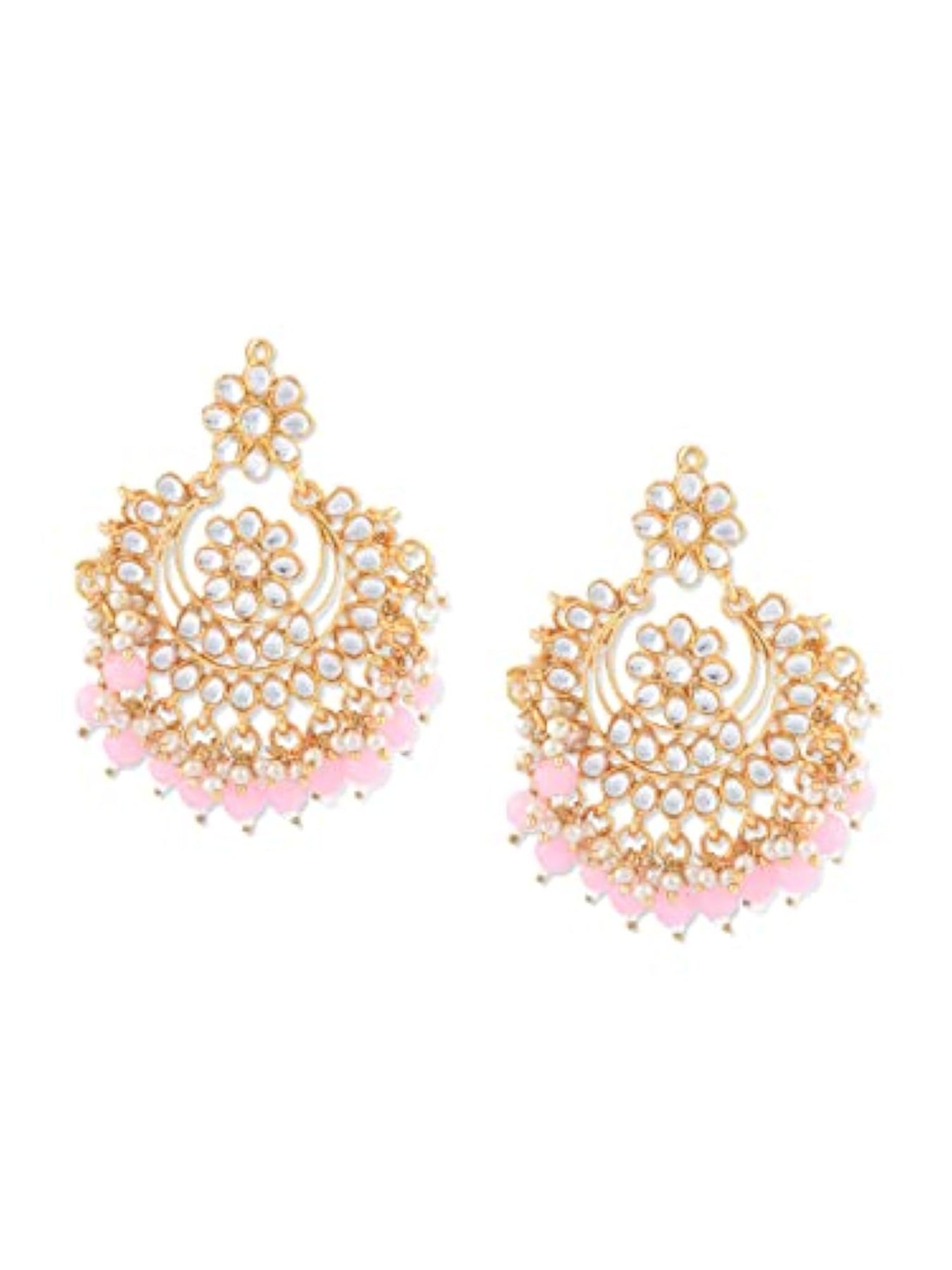 Elegant traditional chandbali earrings featuring kundan and pink beads. Perfect for adding a touch of ethnic charm to your outfit.