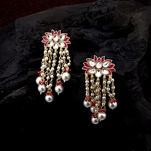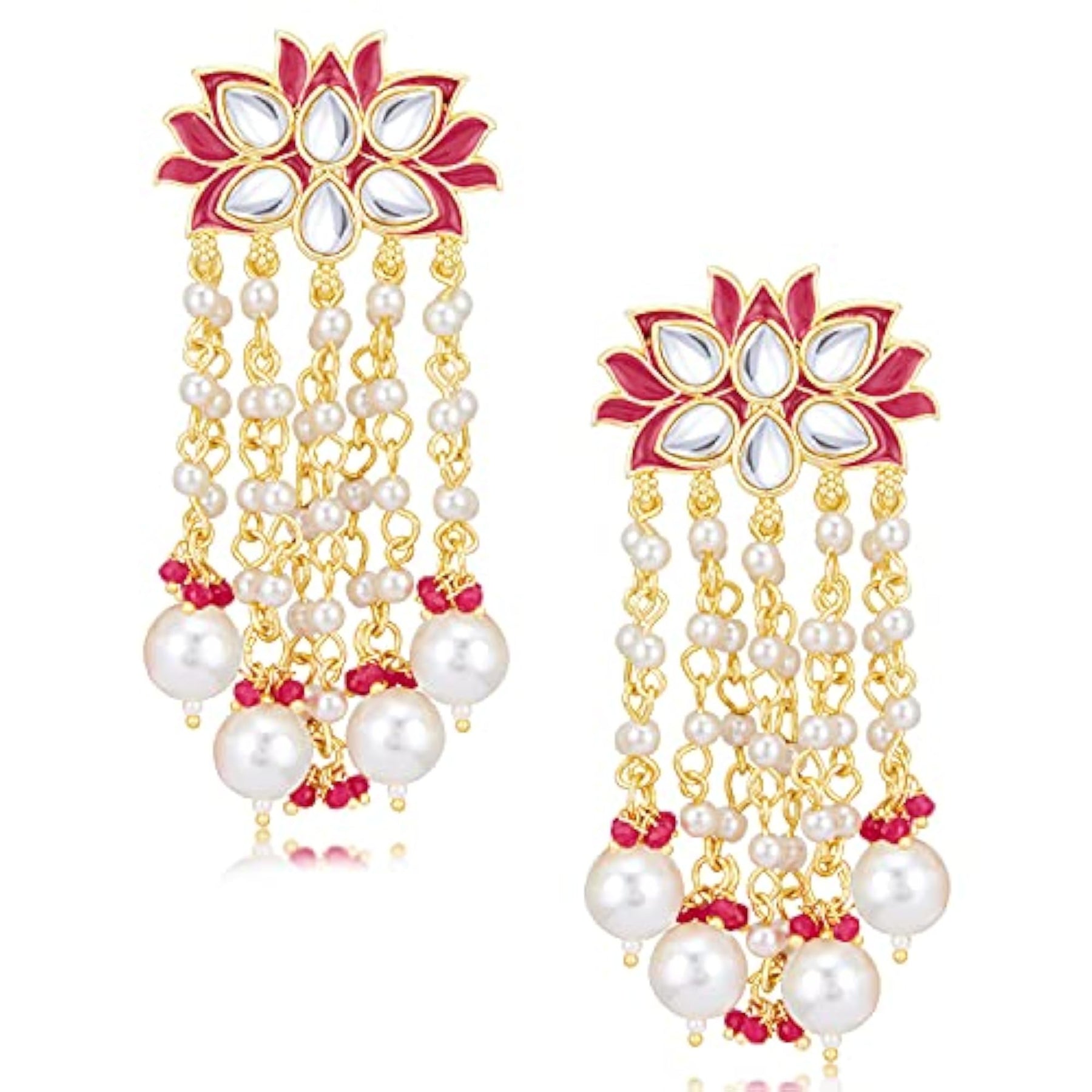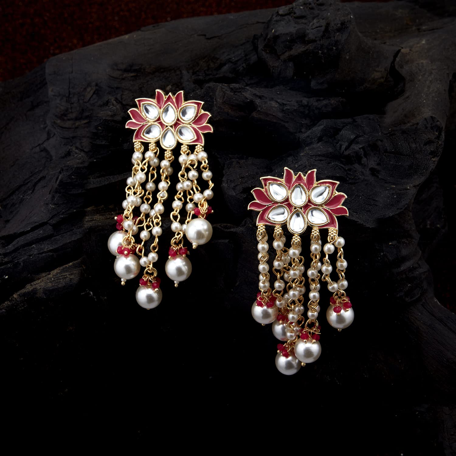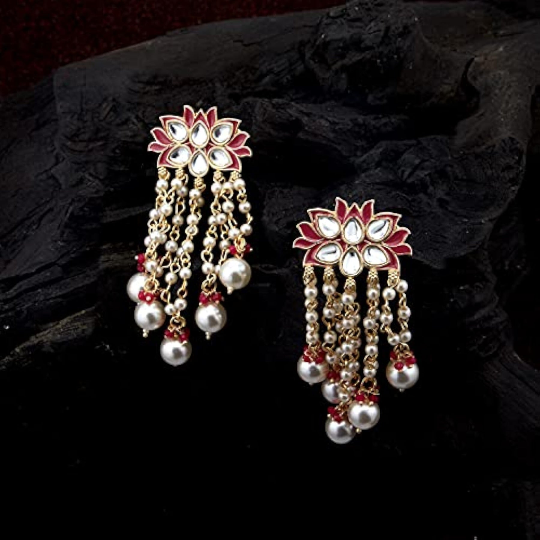 Elegant Kundan plated pearl chandelier earring set with intricate design.
