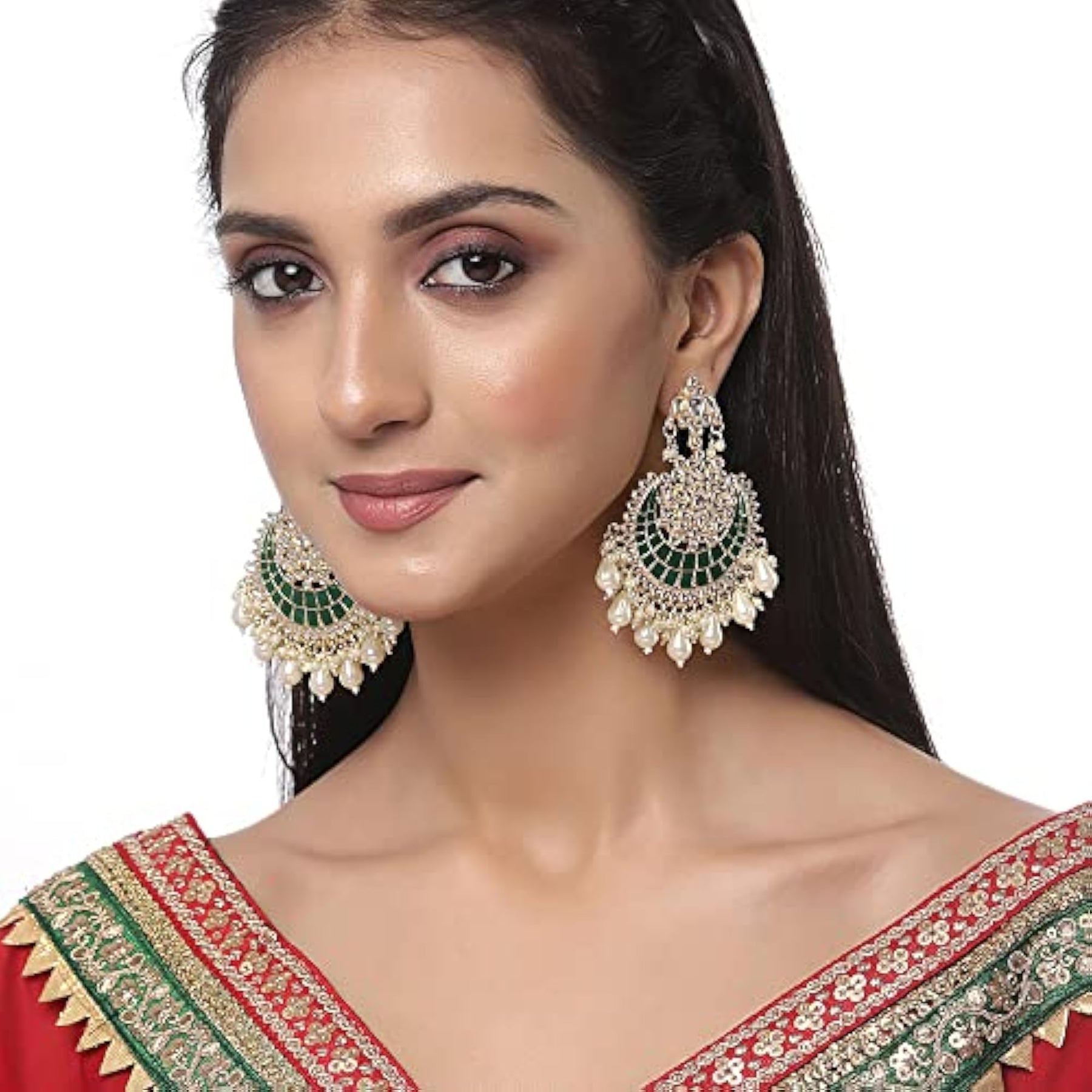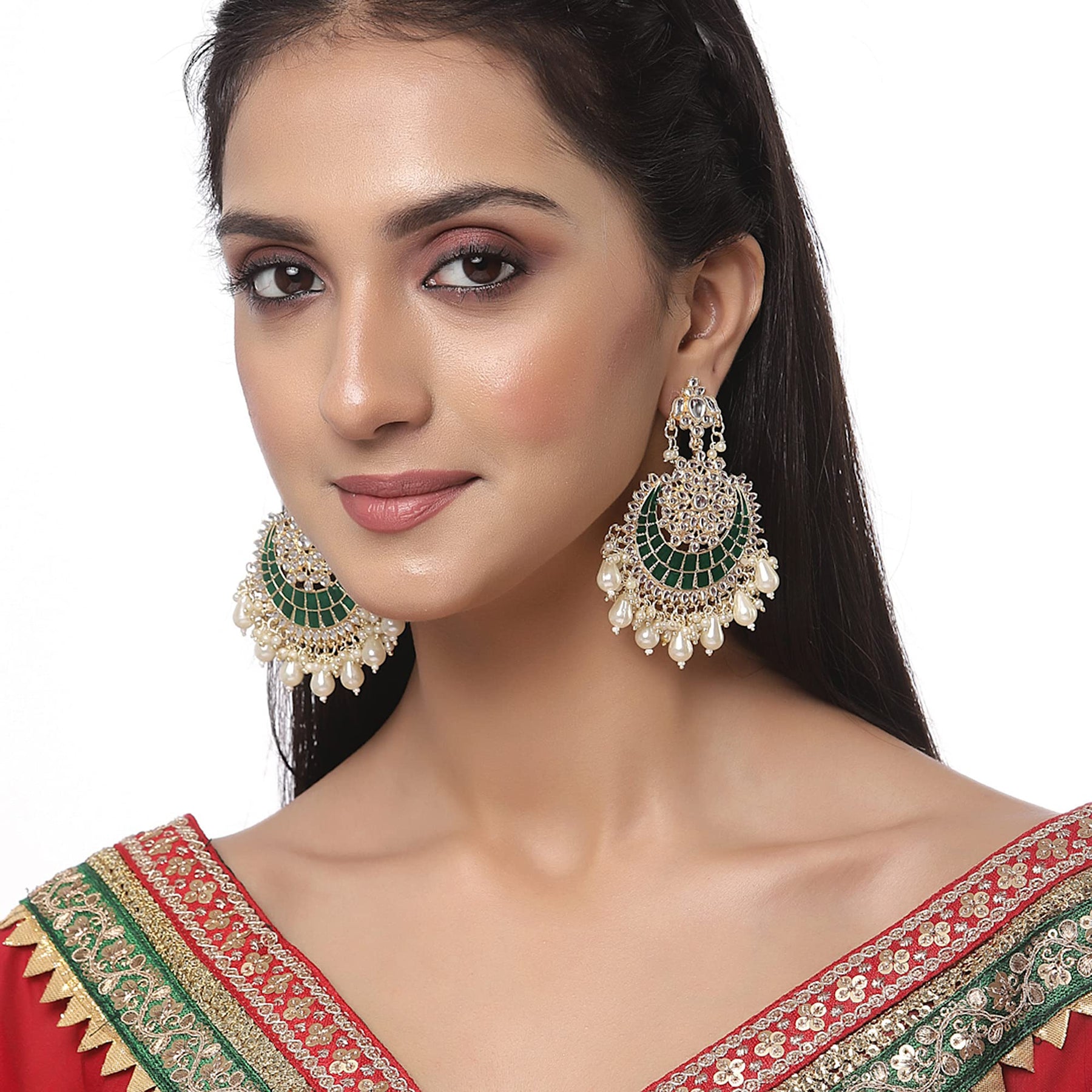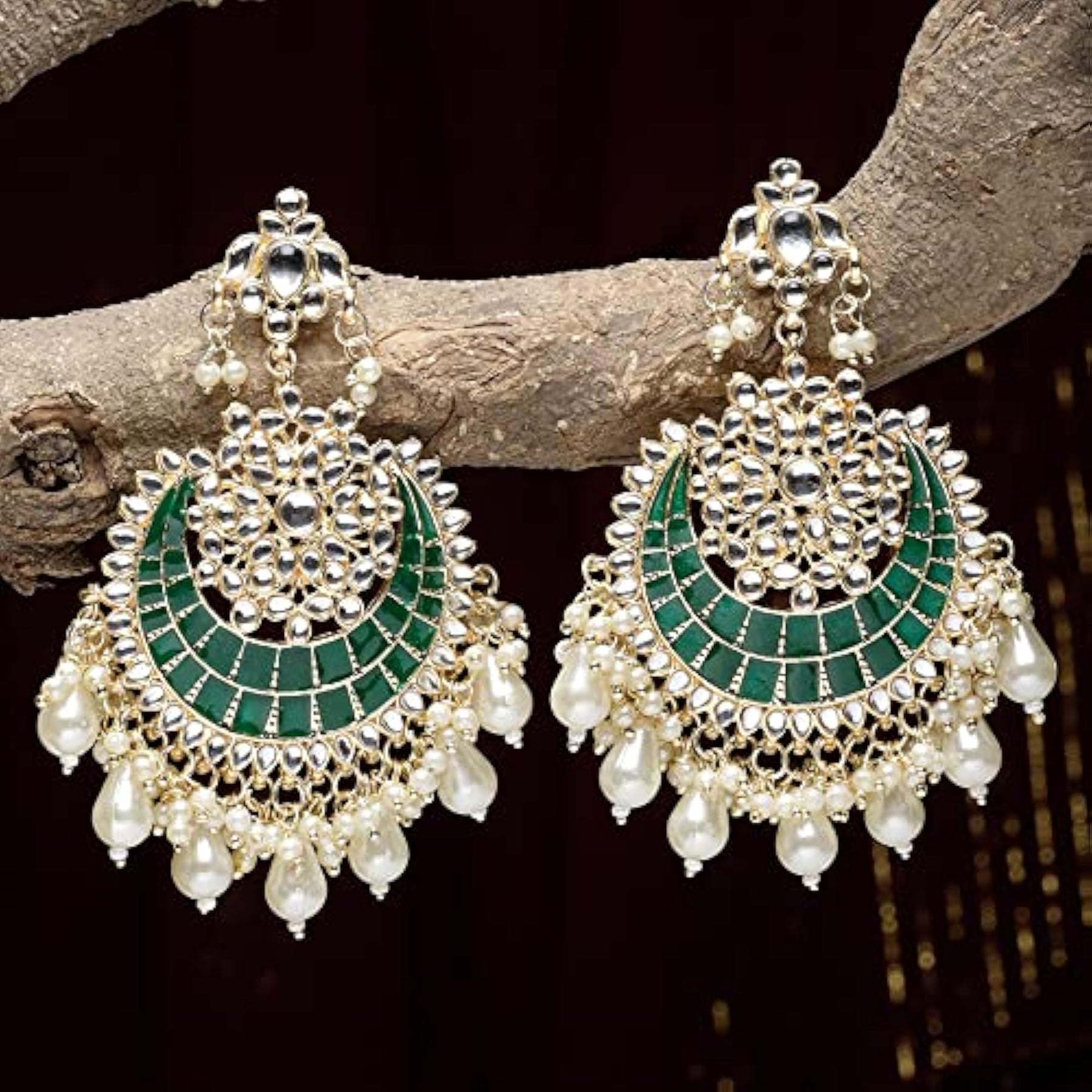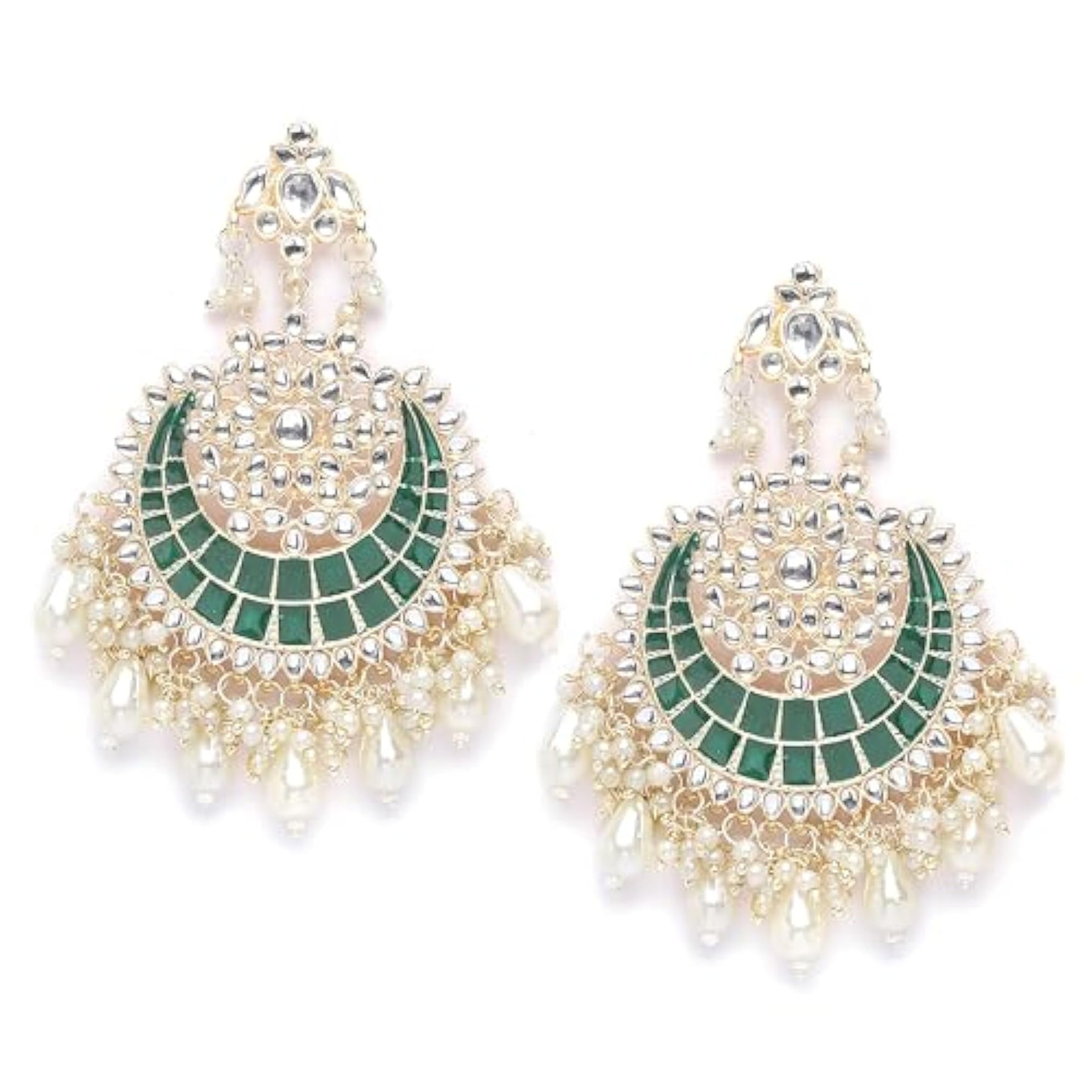 Elegant gold-plated earrings featuring Kundan studded crescent shape design.