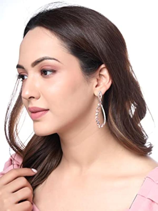Elegant silver-toned leaf shaped dangler earrings with crystal embellishments. Perfect for birthdays and anniversaries, a thoughtful gift for your wife.