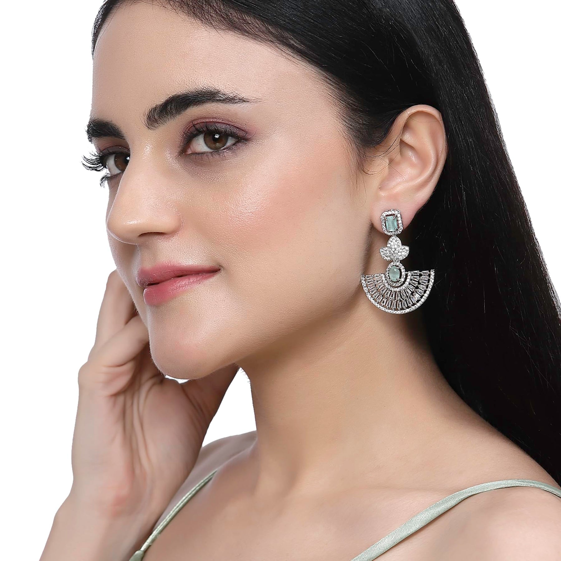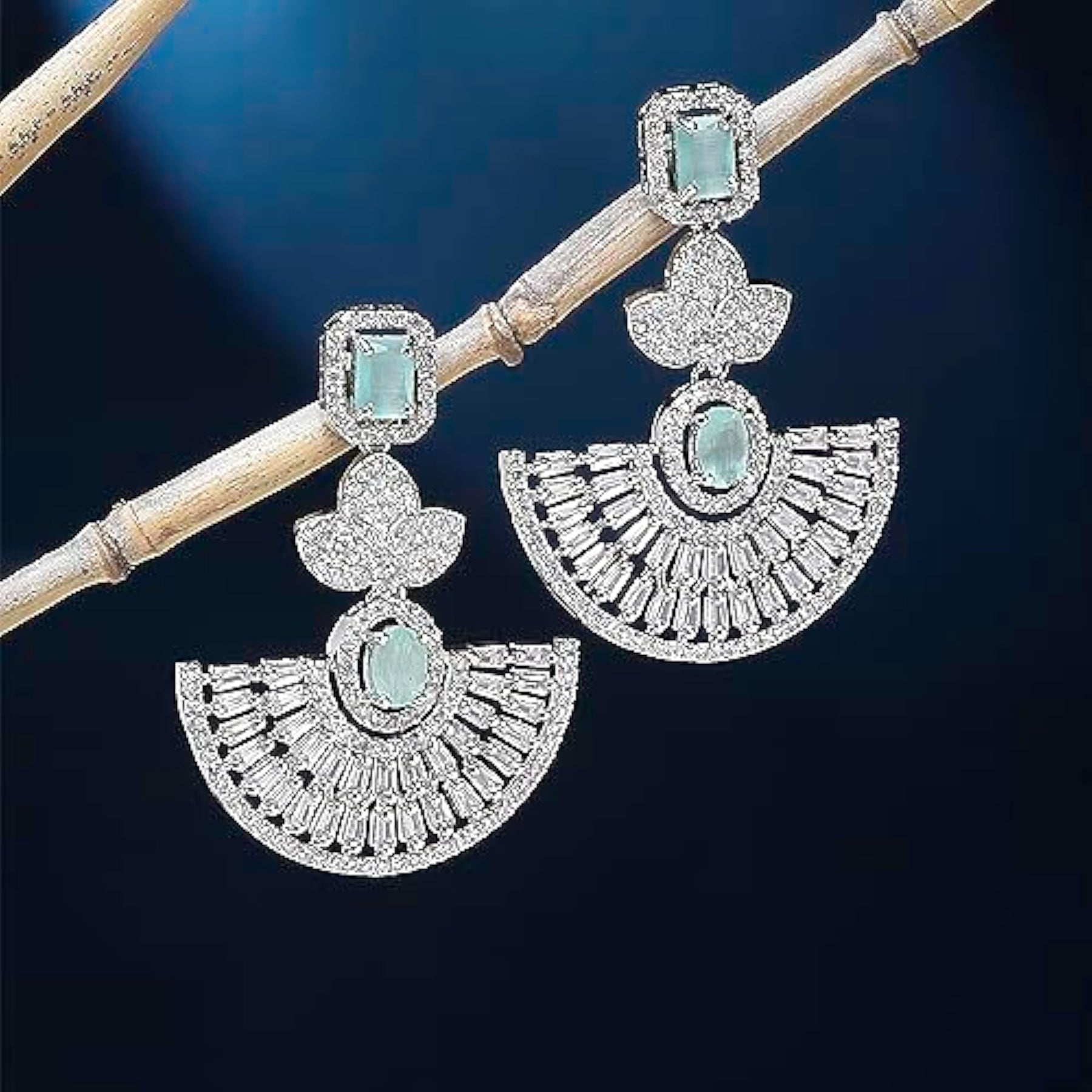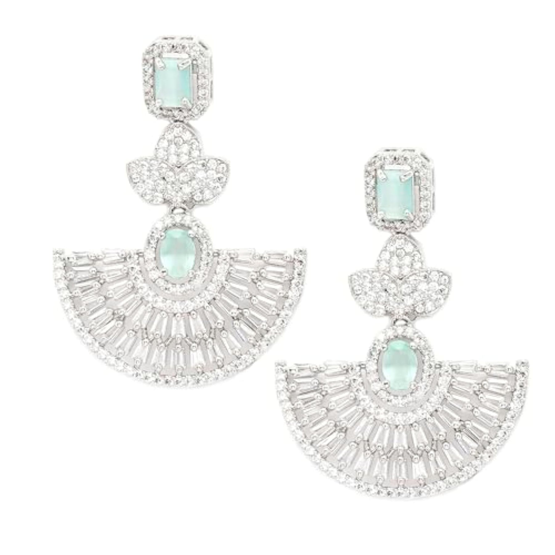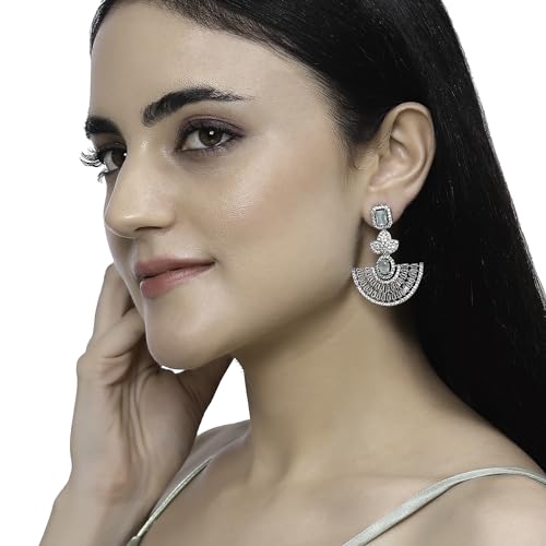 Elegant handcrafted leaf-shaped drop earrings adorned with sparkling American diamonds. Rhodium plated for added shine.