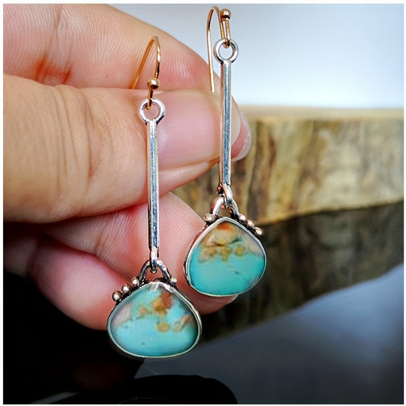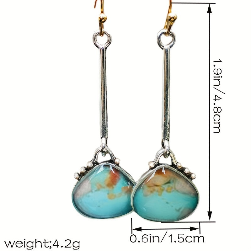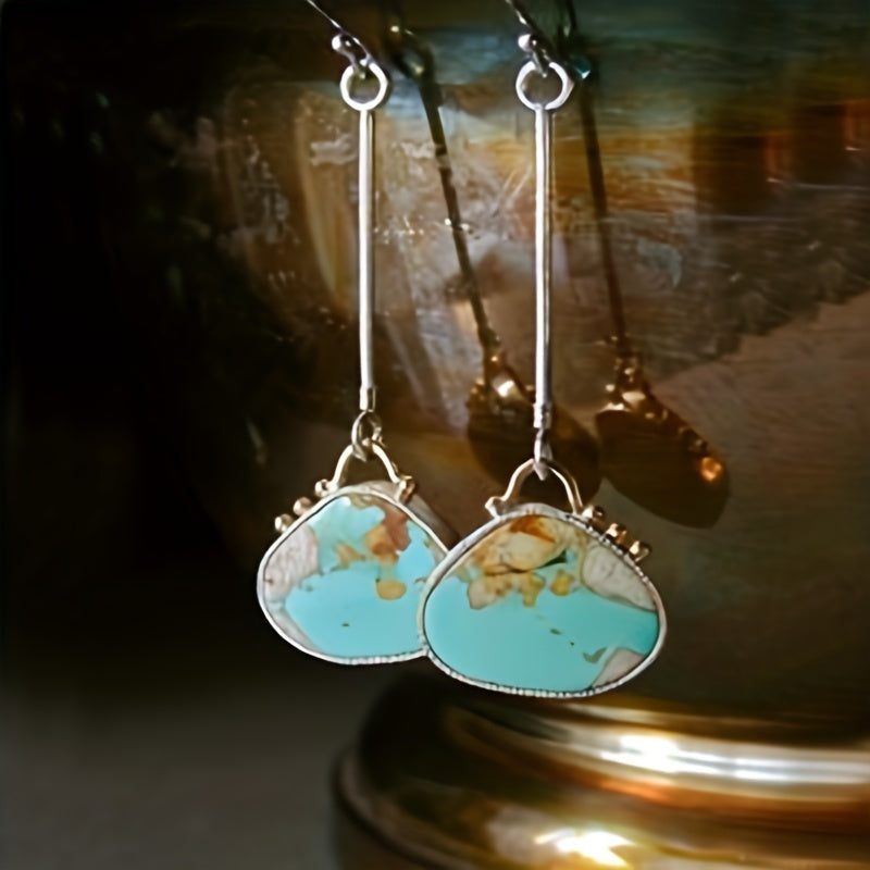 Stand out with these creative and colorful lock bag shaped earrings featuring a long turquoise pendant. Perfect for adding a unique touch to any outfit.