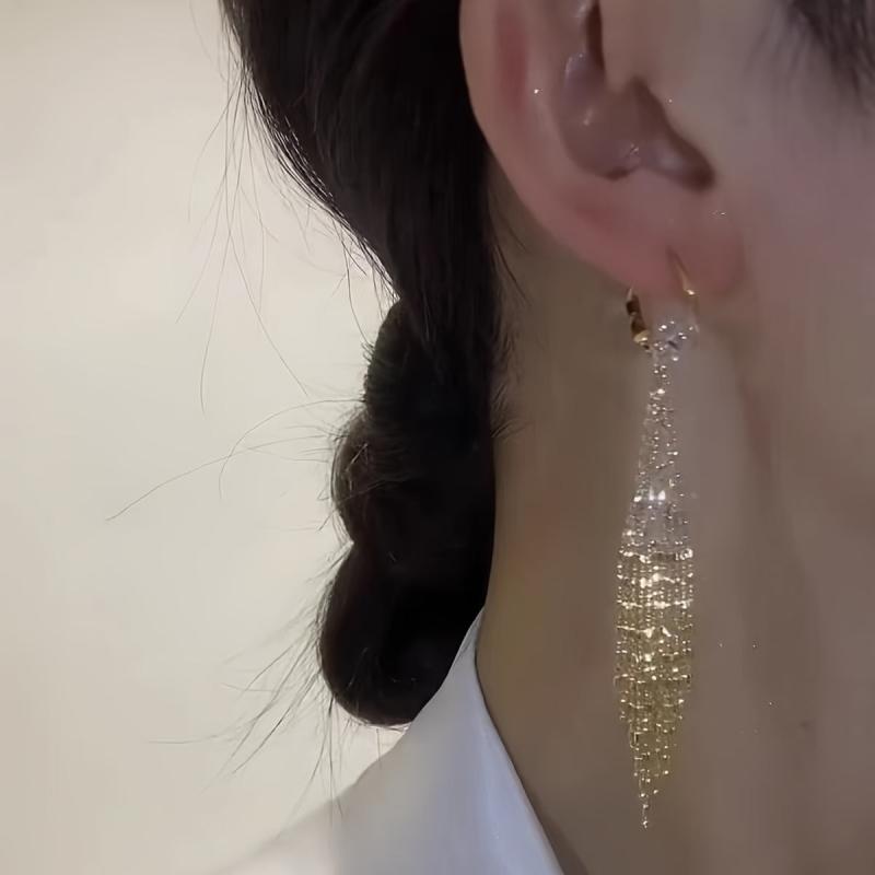 Elegant long earrings adorned with sparkling cubic zirconia stones and a stylish tassel design.