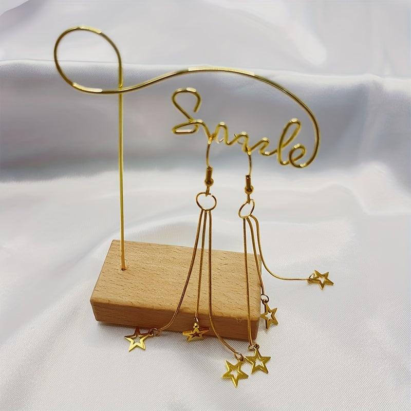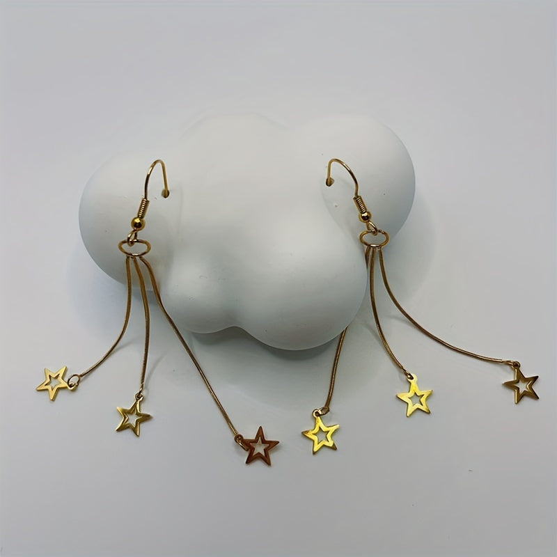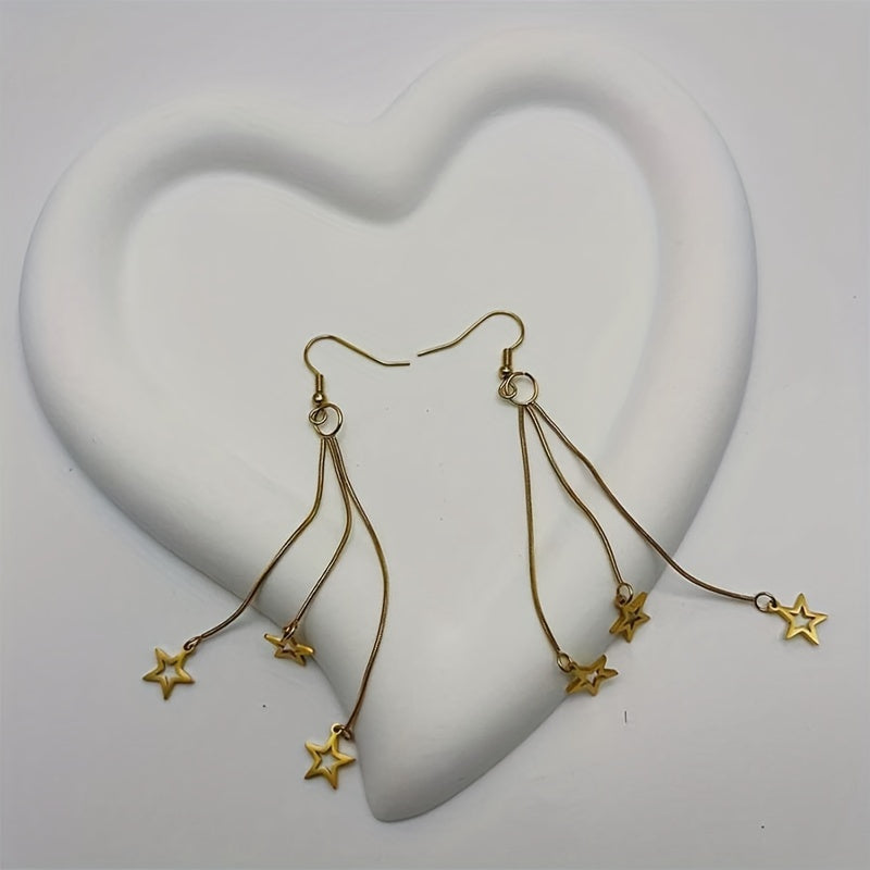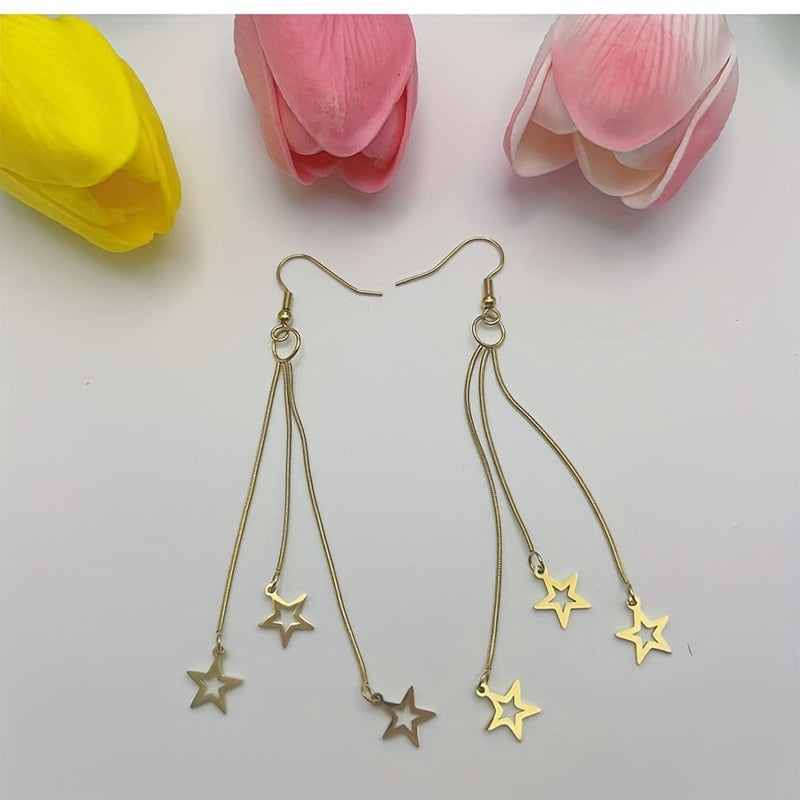 Add a touch of celestial charm to your look with these long drop dangle earrings featuring stars. Perfect for adding a stylish accent to any outfit.