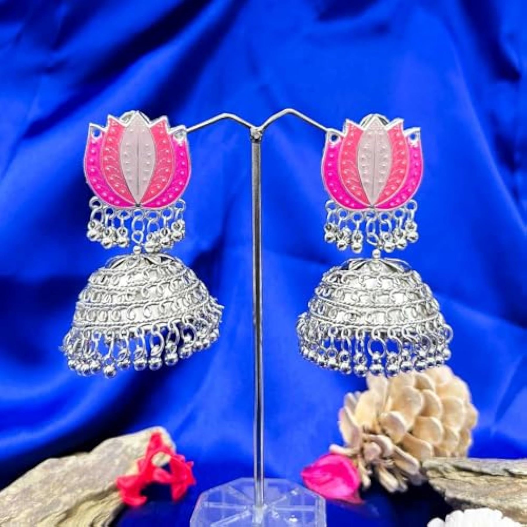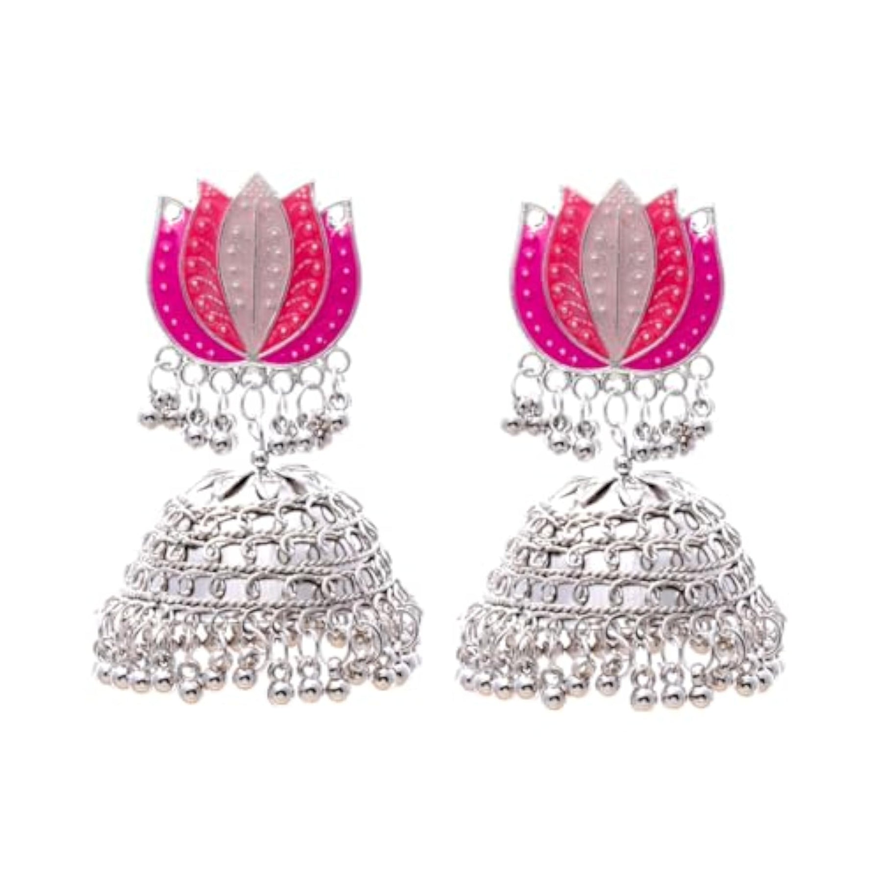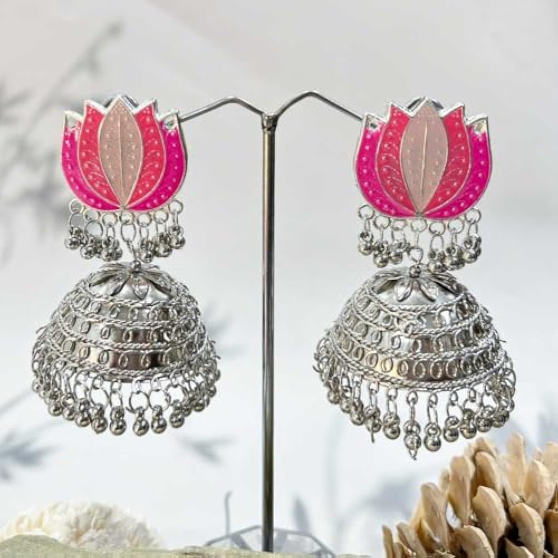 Elegant silver plated oxidized jhumka earrings featuring a lotus motif design. These long earrings are perfect for adding a touch of sophistication to your outfit.
