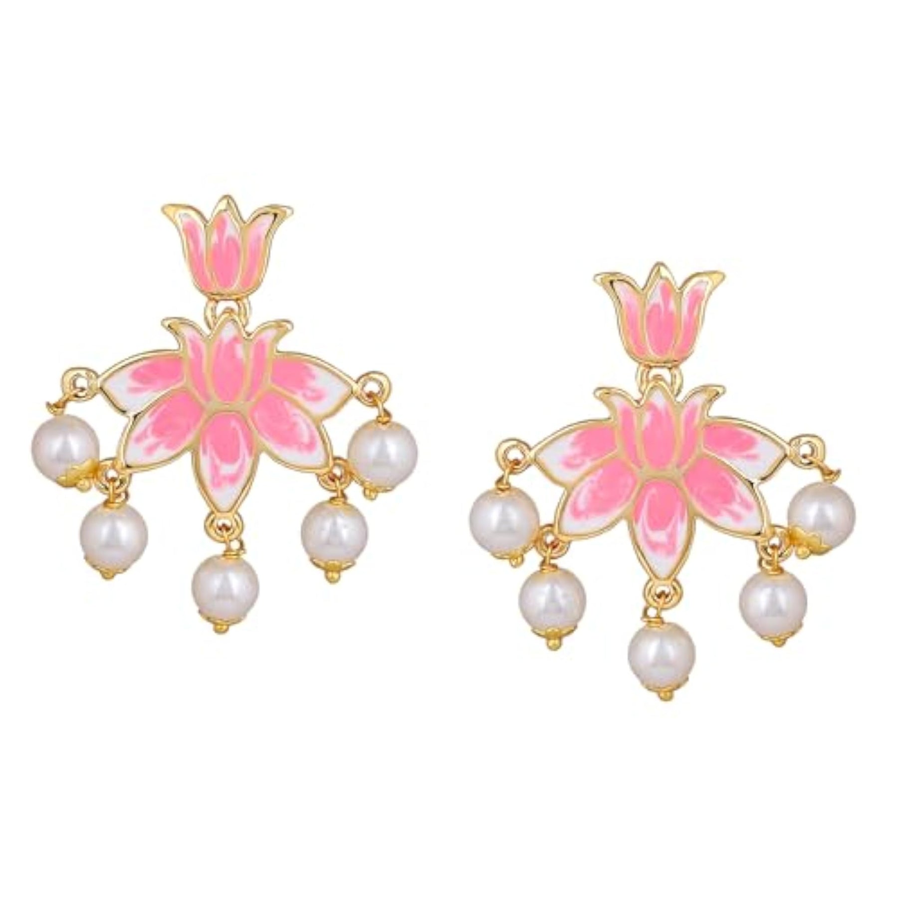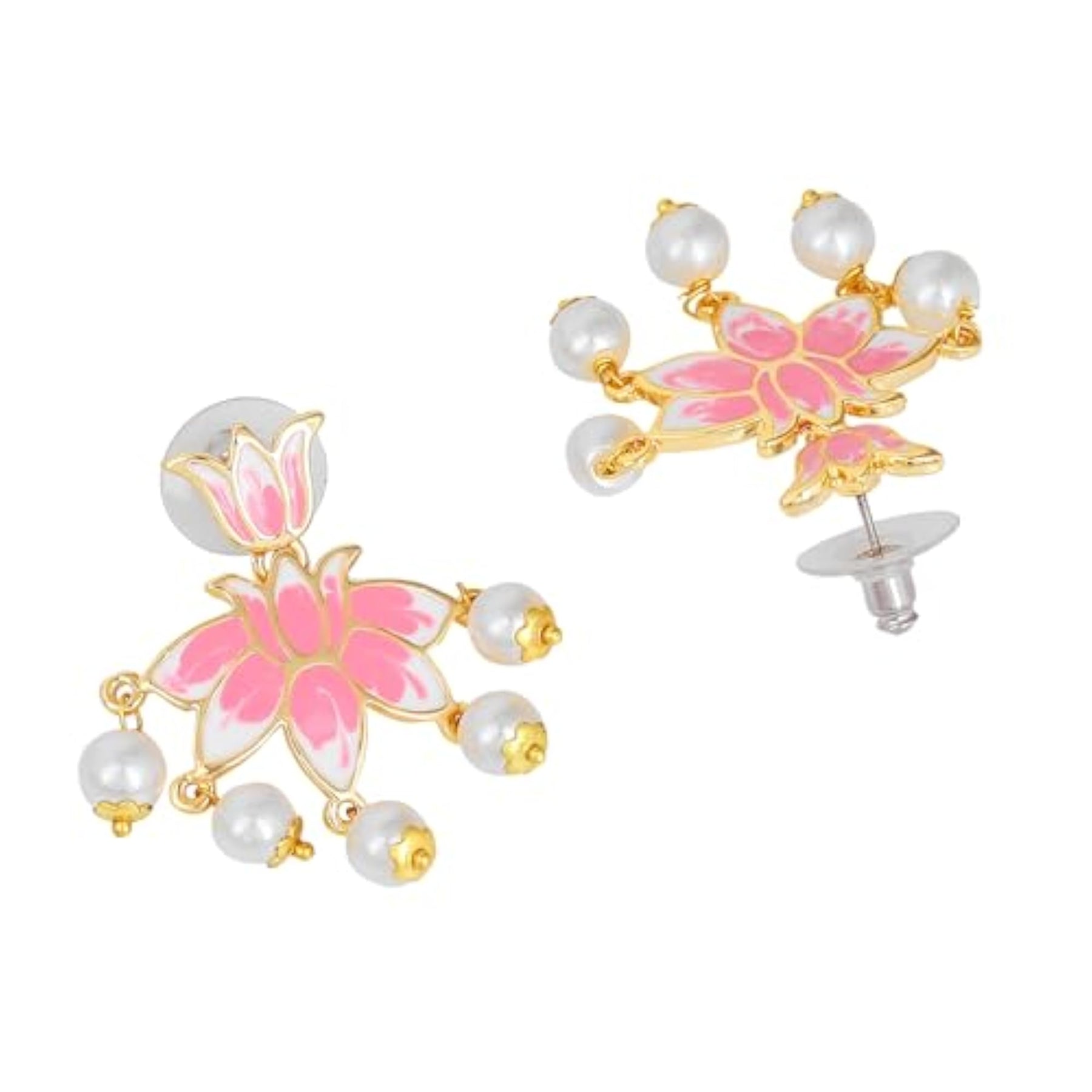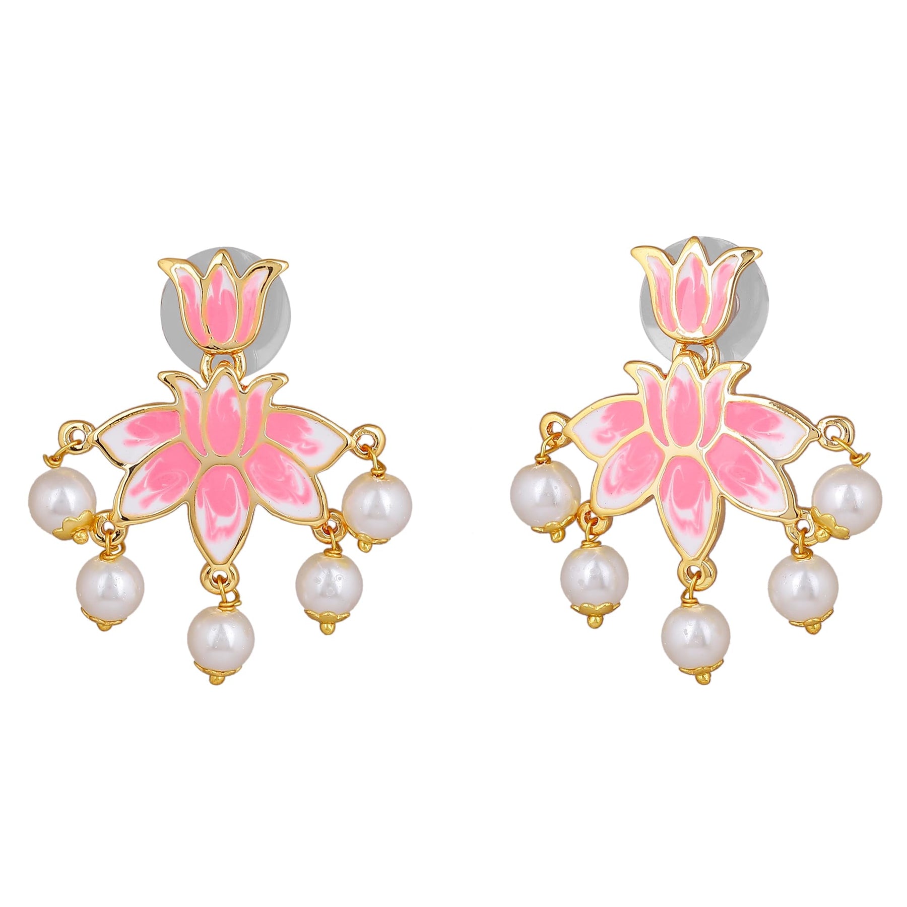 Elegant earrings featuring a pink plated lotus design with enamel pearl drop. Versatile for day or night wear.