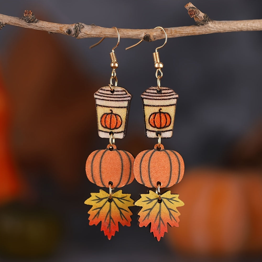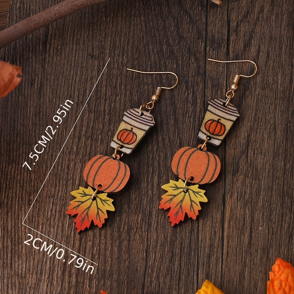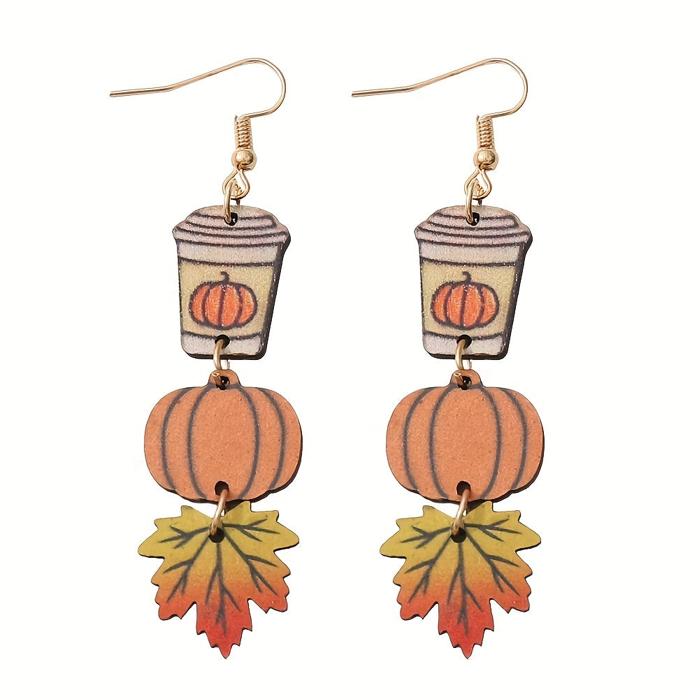 These unique women's earrings feature a wooden maple leaf design with a coffee cup and pumpkin tassel. Perfect for adding a touch of fall to your outfit!