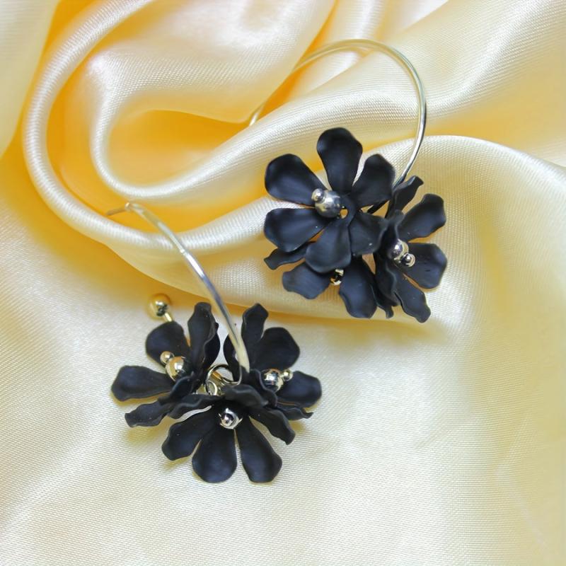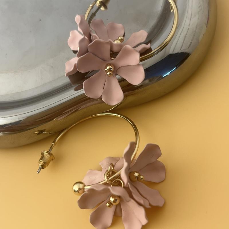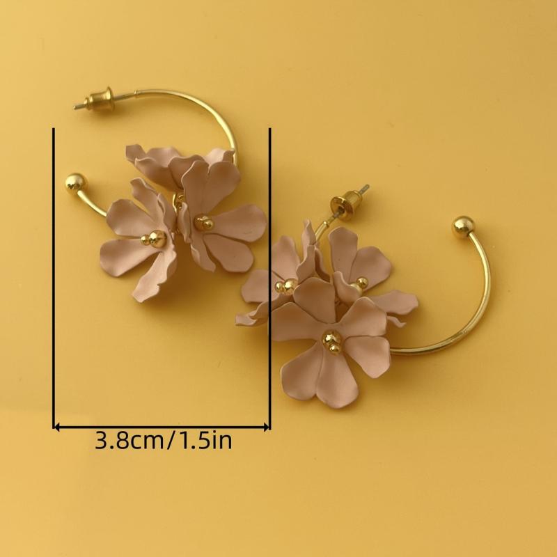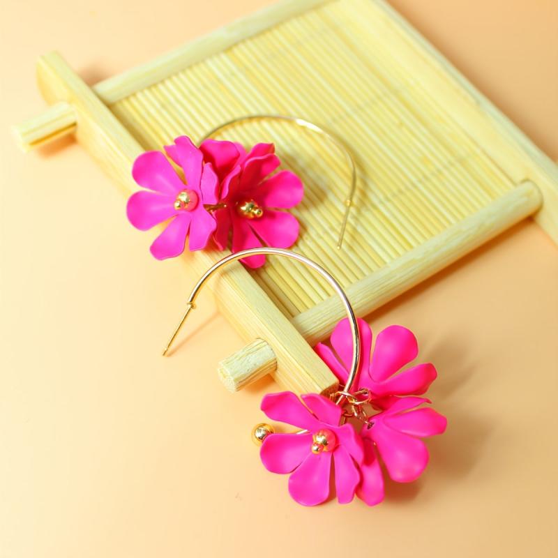 These 3D flower iron crafted hoop earrings feature a matte pink finish with intricate golden tone detailing. Suitable for both daily wear and special occasions, these quirky earrings add a touch of elegance to any outfit.