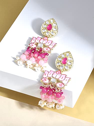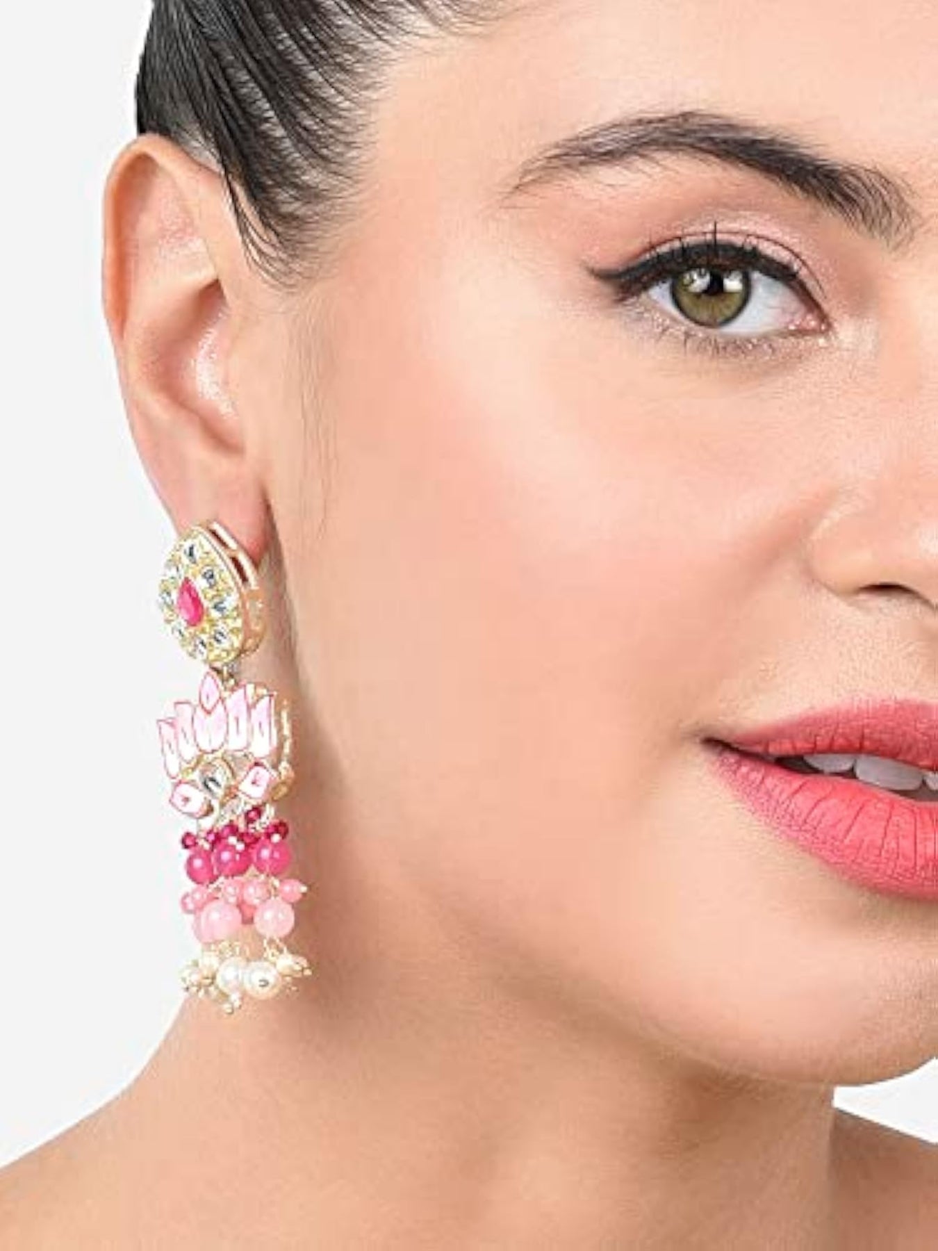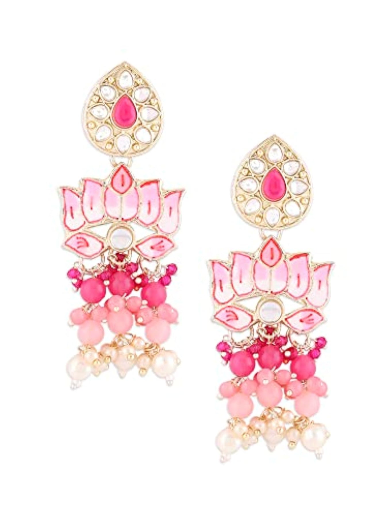These traditional earrings feature a cluster of colorful beads and a lotus design. Perfect for women who love traditional jewelry.