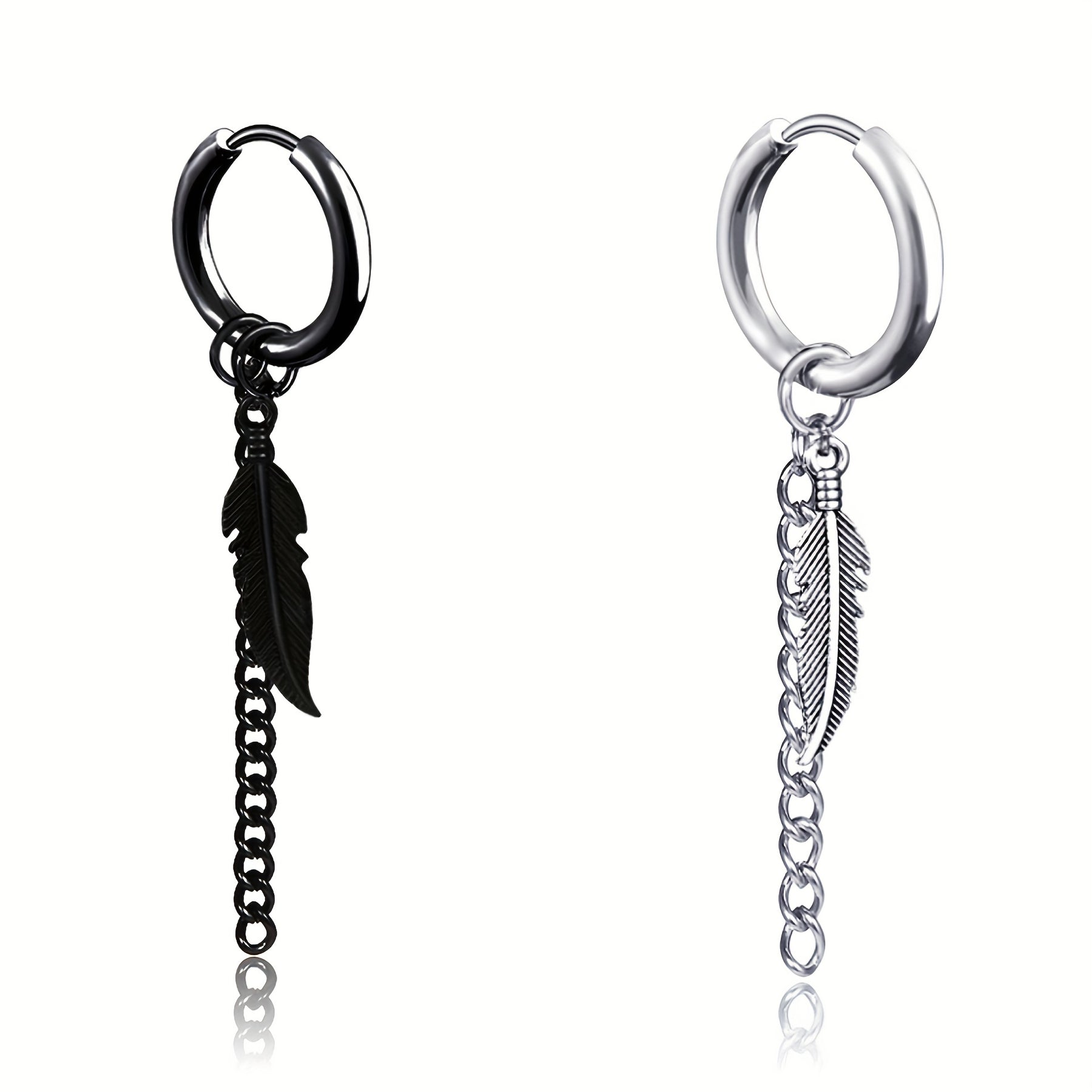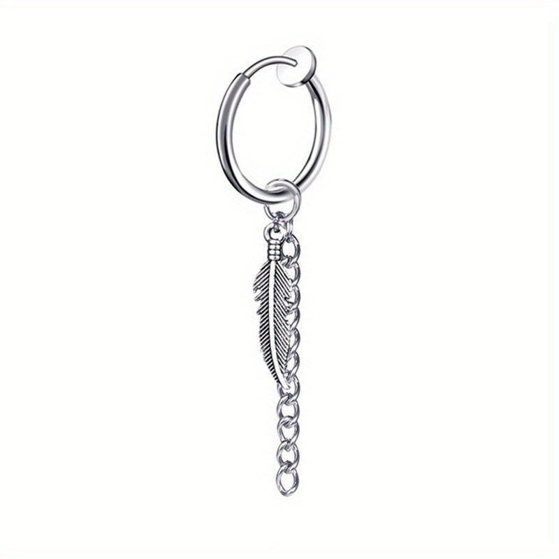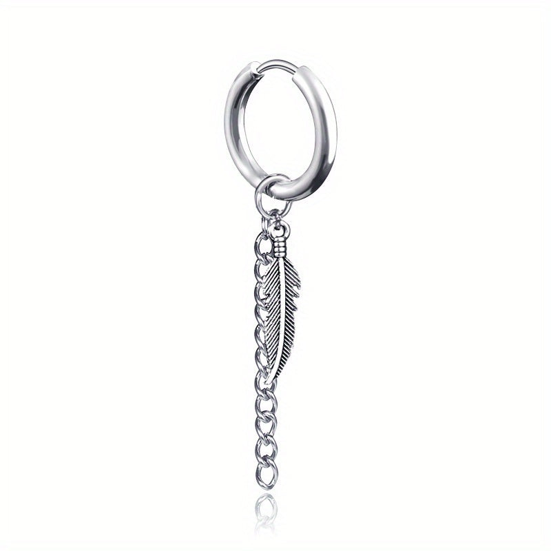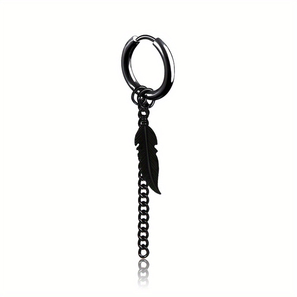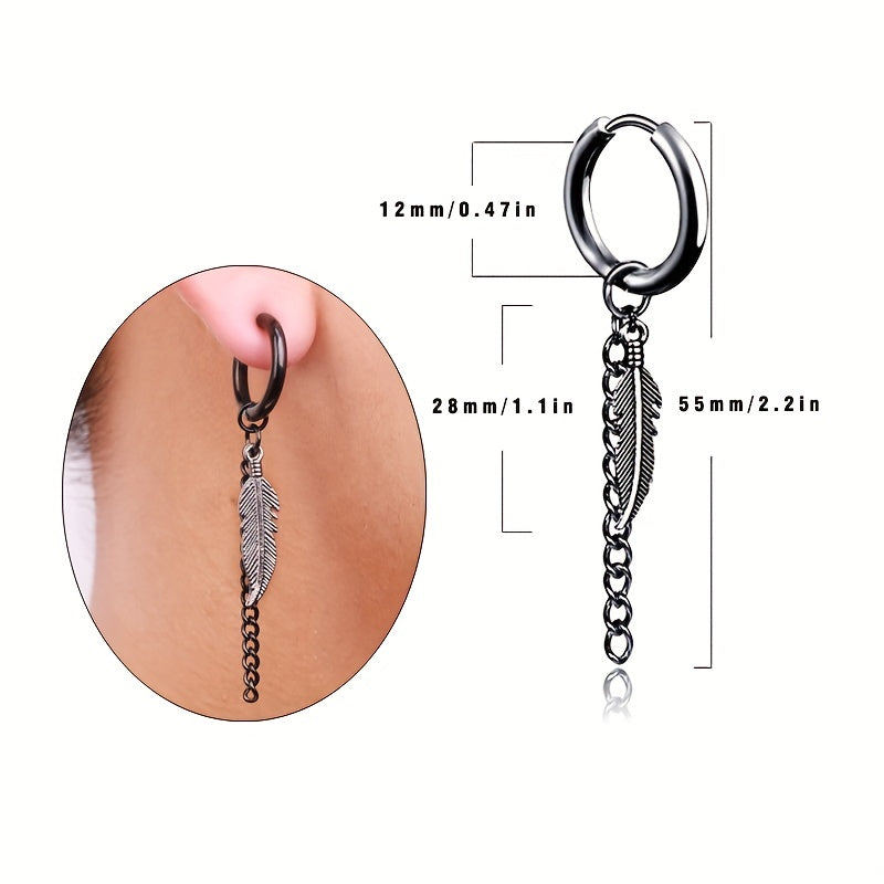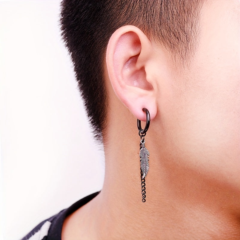Add a stylish touch to your look with these leaf & feather tassel chain earrings, made of durable titanium steel. Perfect for men.