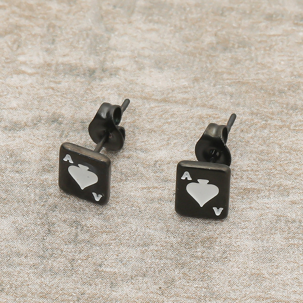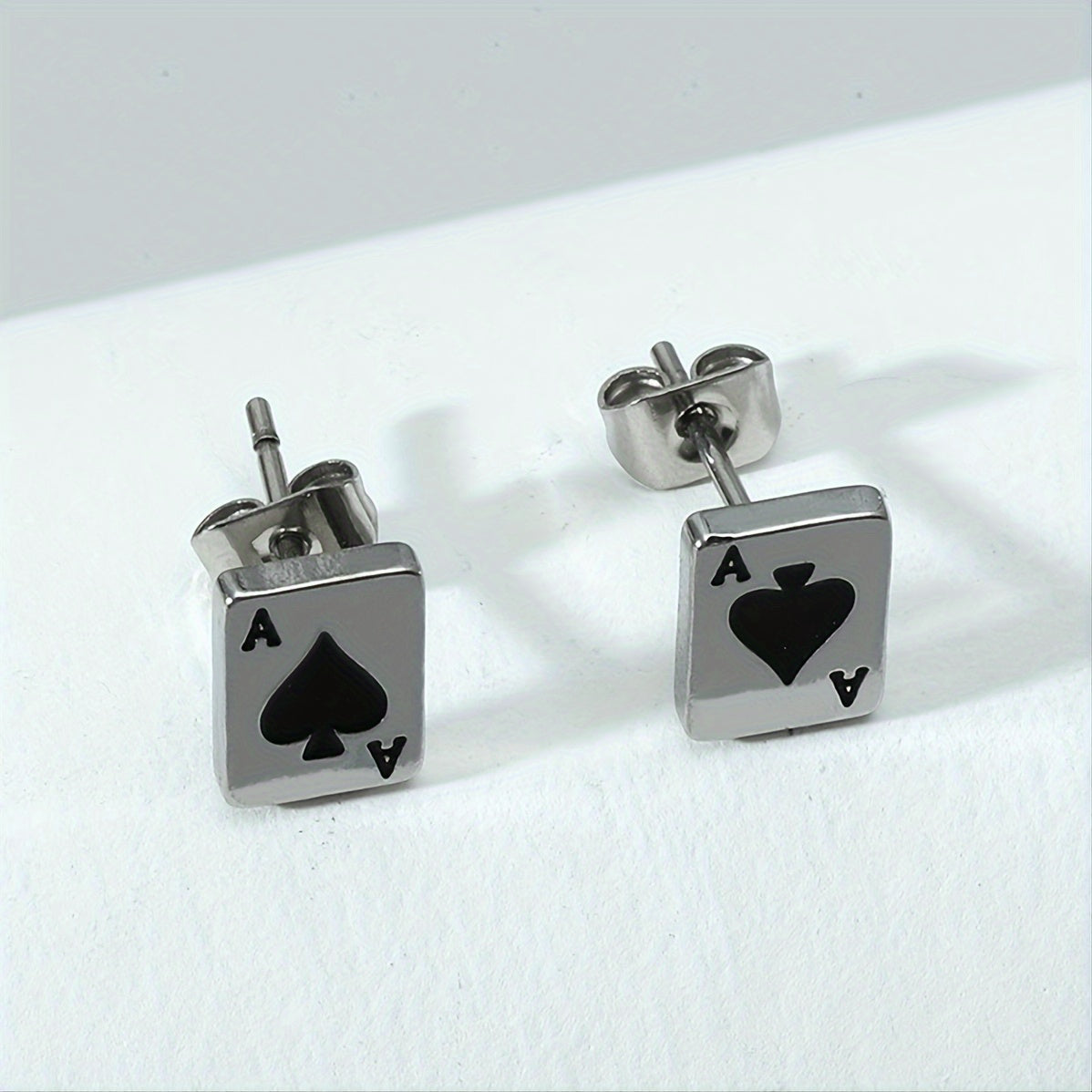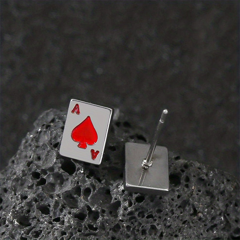 These stylish stud earrings feature playing card designs, perfect for poker enthusiasts. Made for men who love to play card games with style.