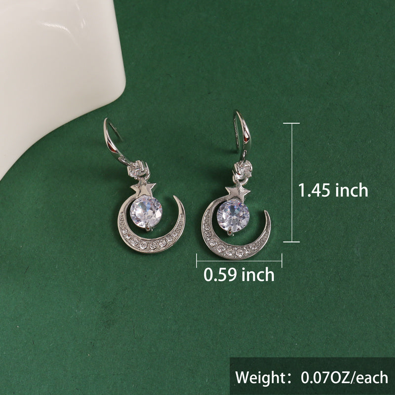 Beautiful moon and star theme drop earrings with inlaid round cut zircon pendant. Perfect as a gift for someone special.