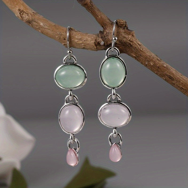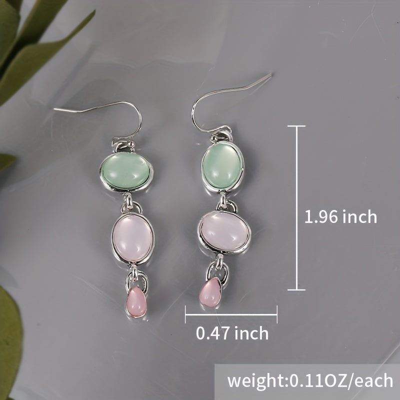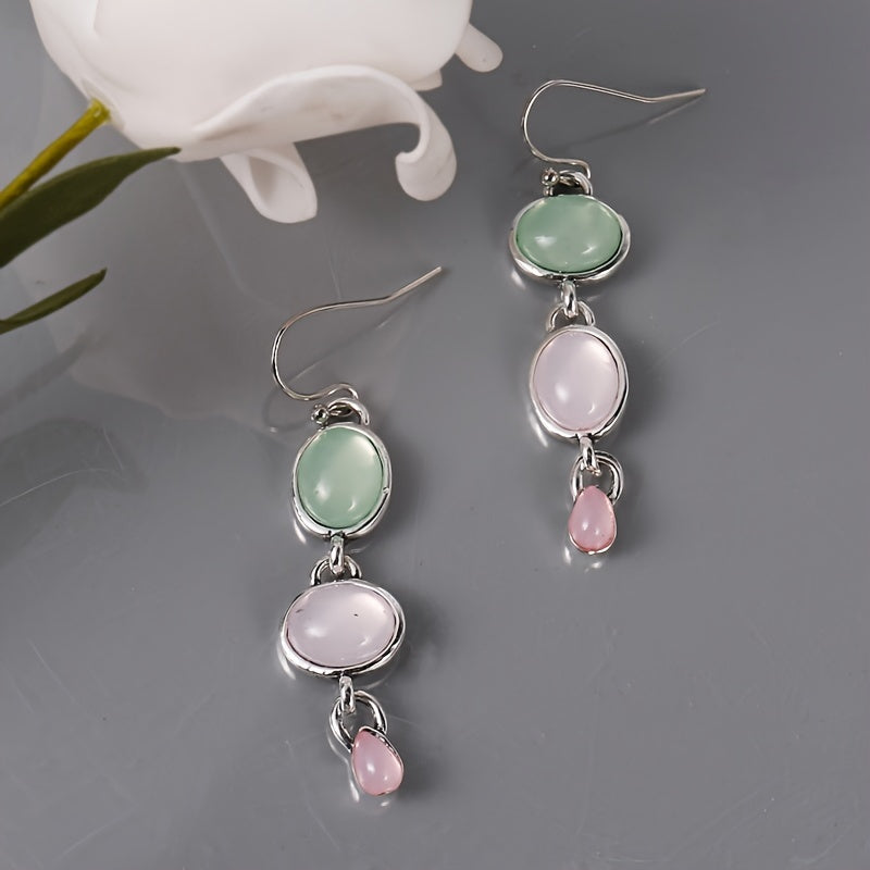 Elegant moonstone dangle earrings with oval pink stone, perfect for weddings and engagements.