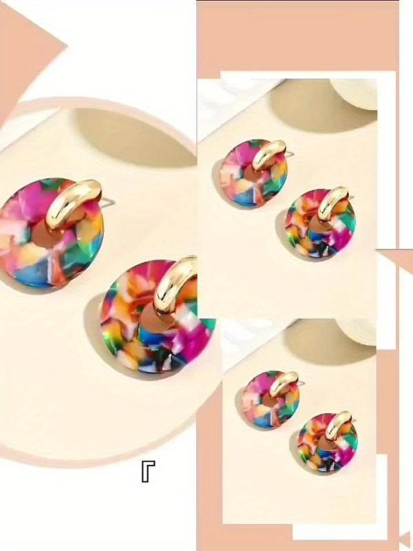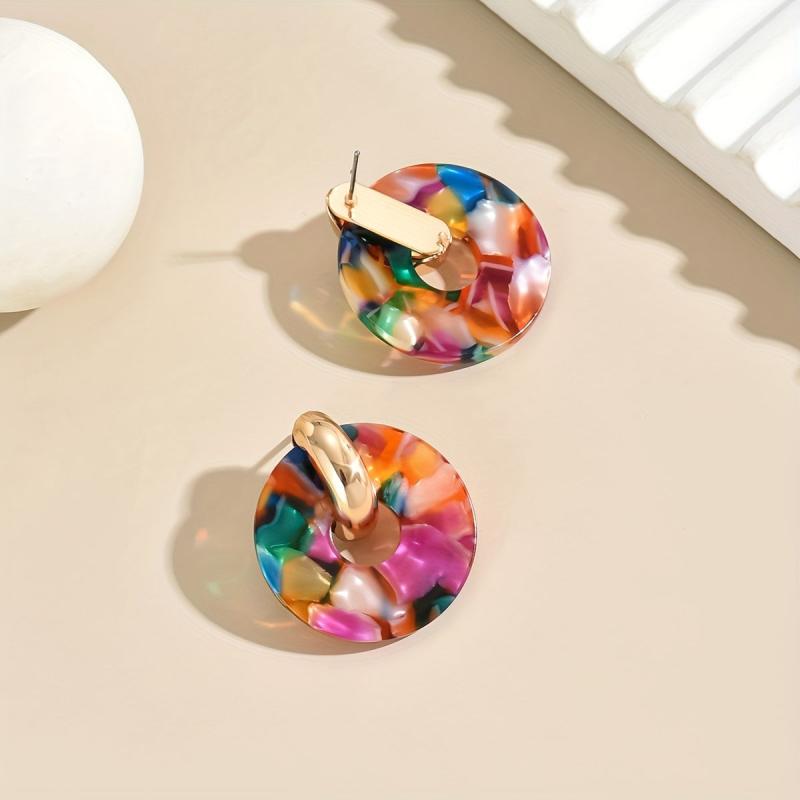 These stylish earrings feature multicolor acetate round drops with hypoallergenic ear needles. Made of iron material, suitable for ages 15 and above.