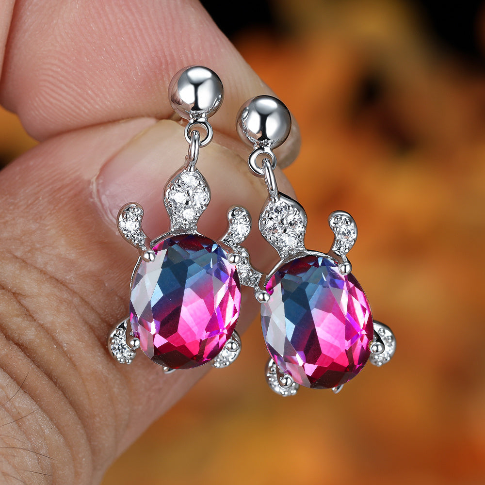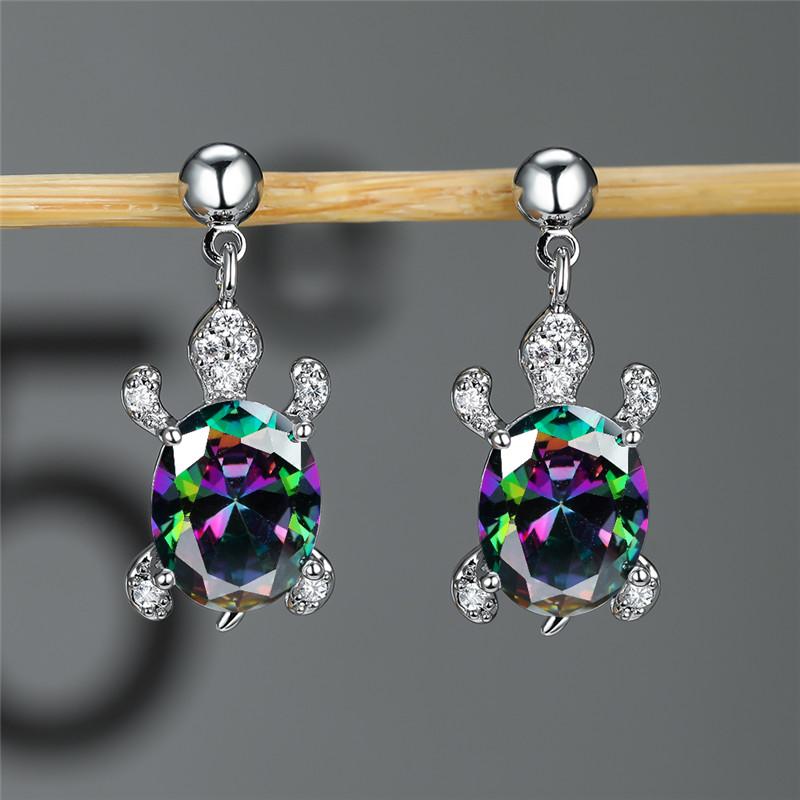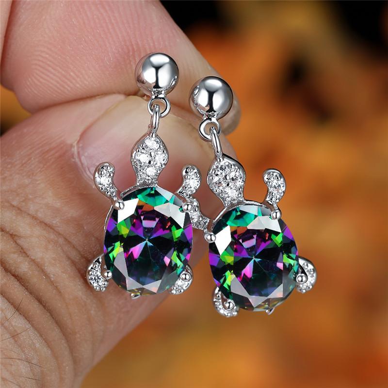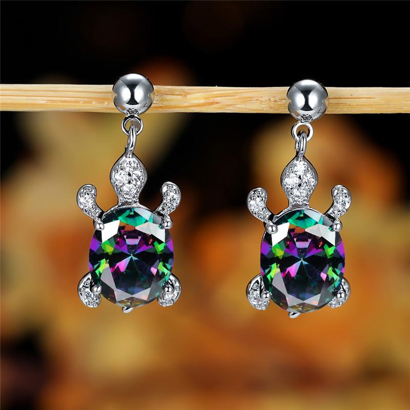 Adorn yourself with these vibrant multicolor animal drop earrings featuring oval cut gradient rainbow stones. Perfect for adding a pop of color to your attire.