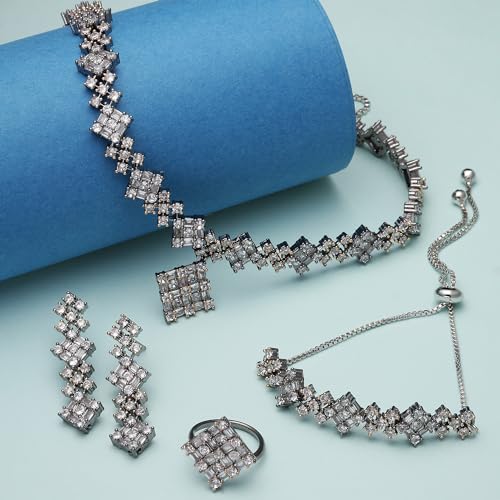 Stunning rhodium-plated silver-toned needle drop earrings featuring shimmering American diamond studs.