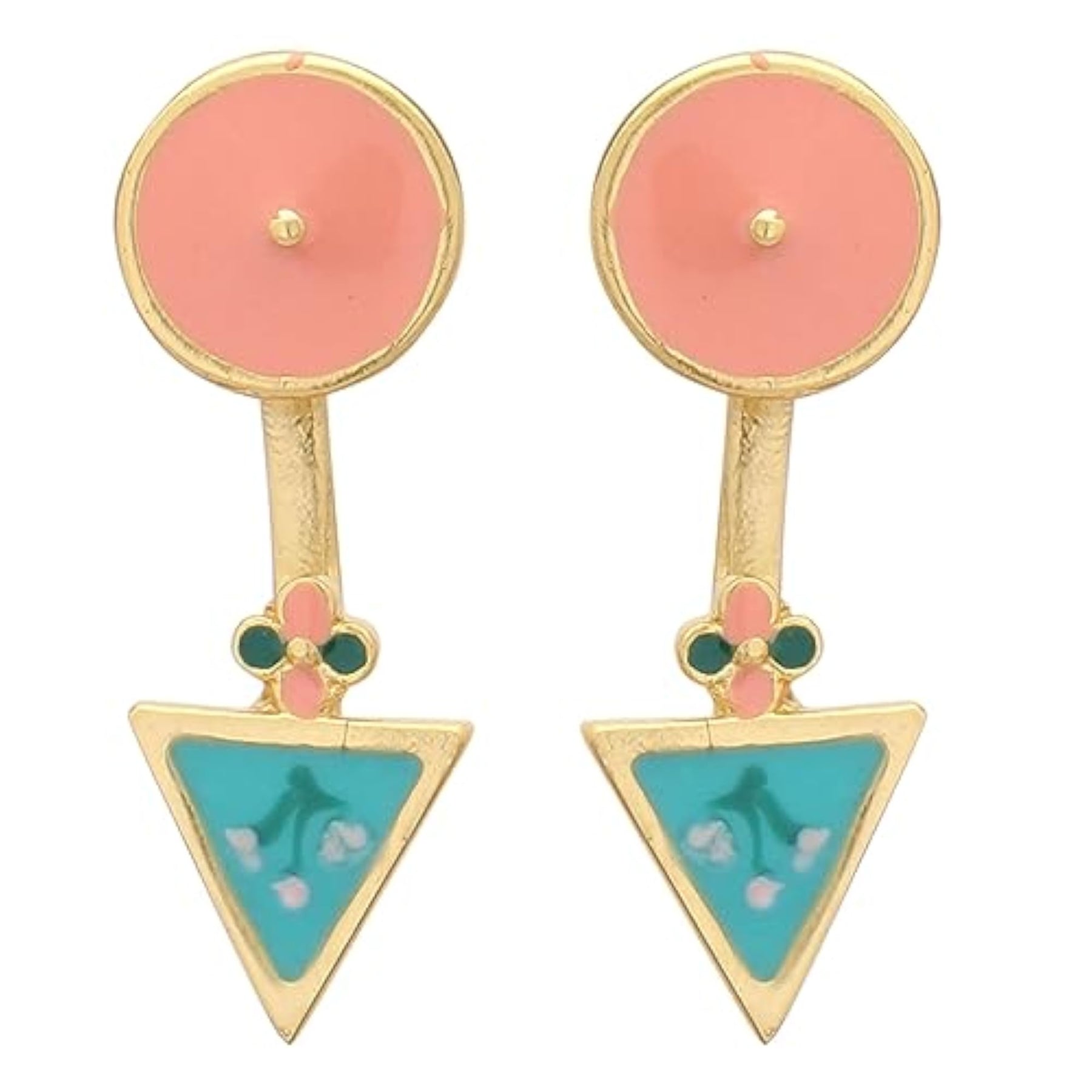 Elegant drop earrings featuring orange disc and turquoise triangle in oxidized plated zinc alloy.