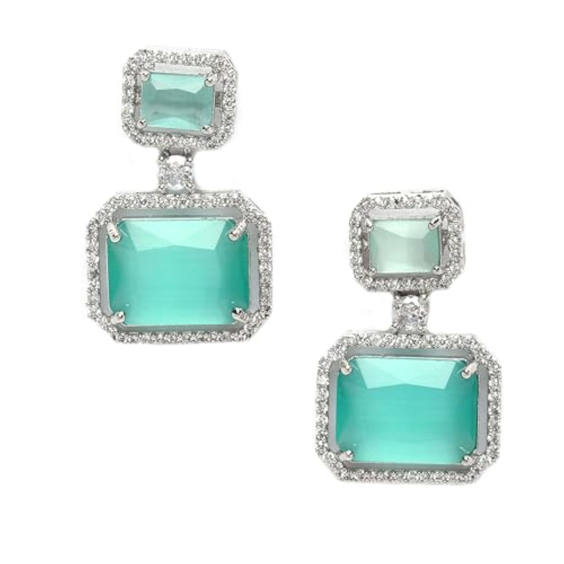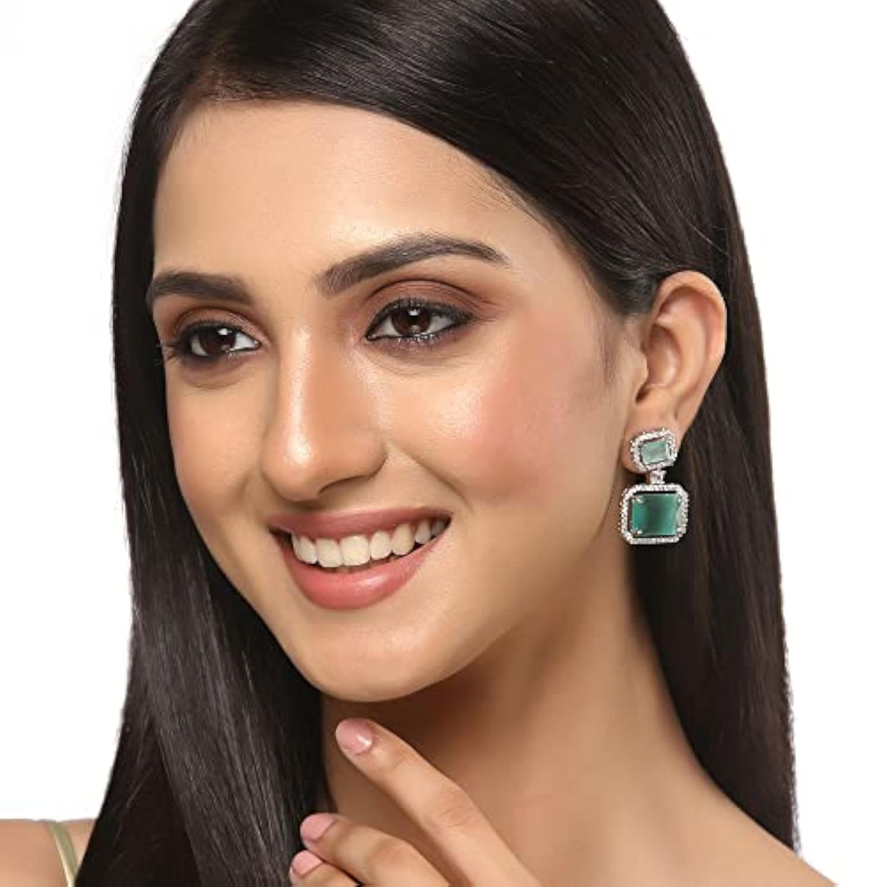 Stylish oxidised silver-plated earrings with American Diamond studded oval drop design.