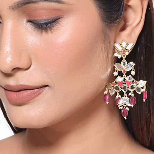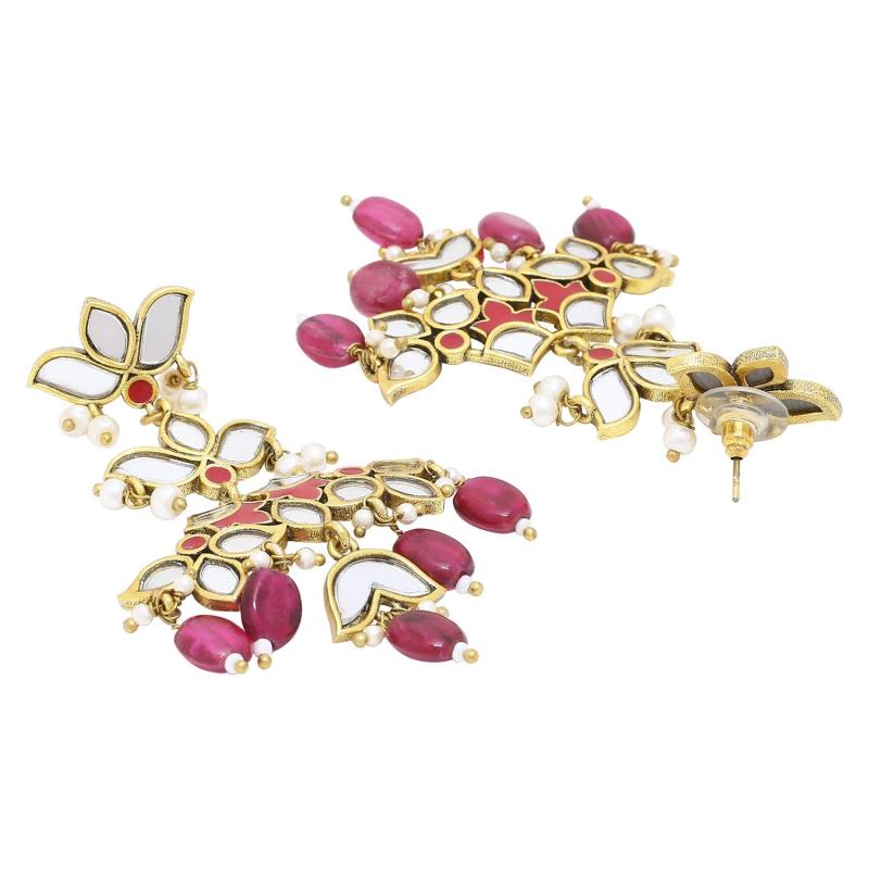 Elegant brass earrings with lotus motif and pearl beads, perfect for any occasion.