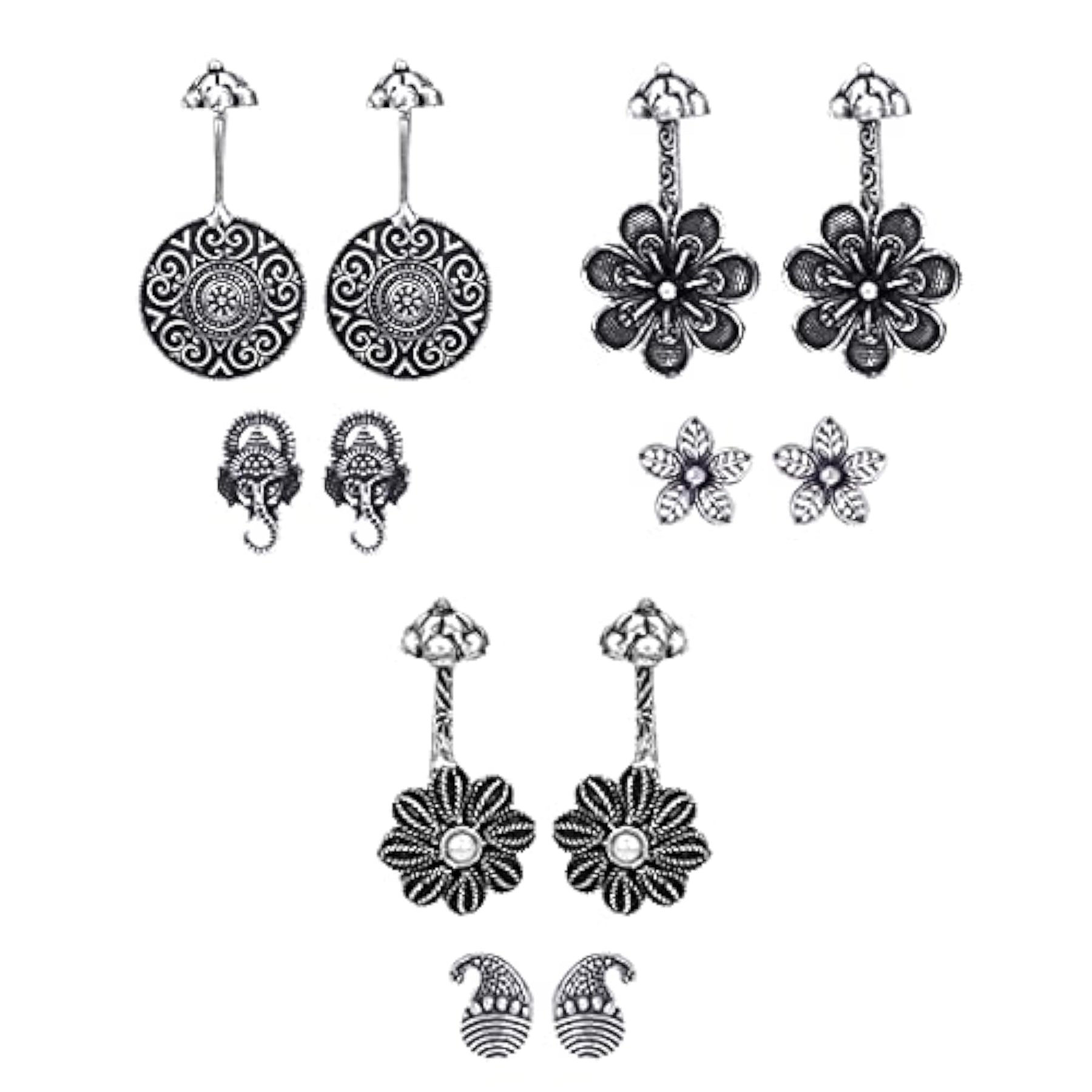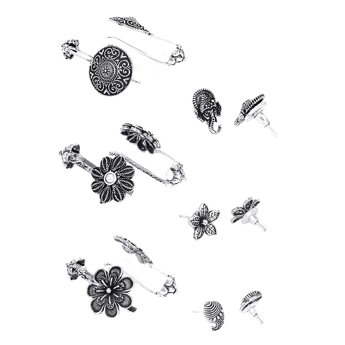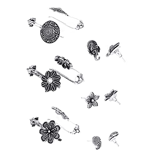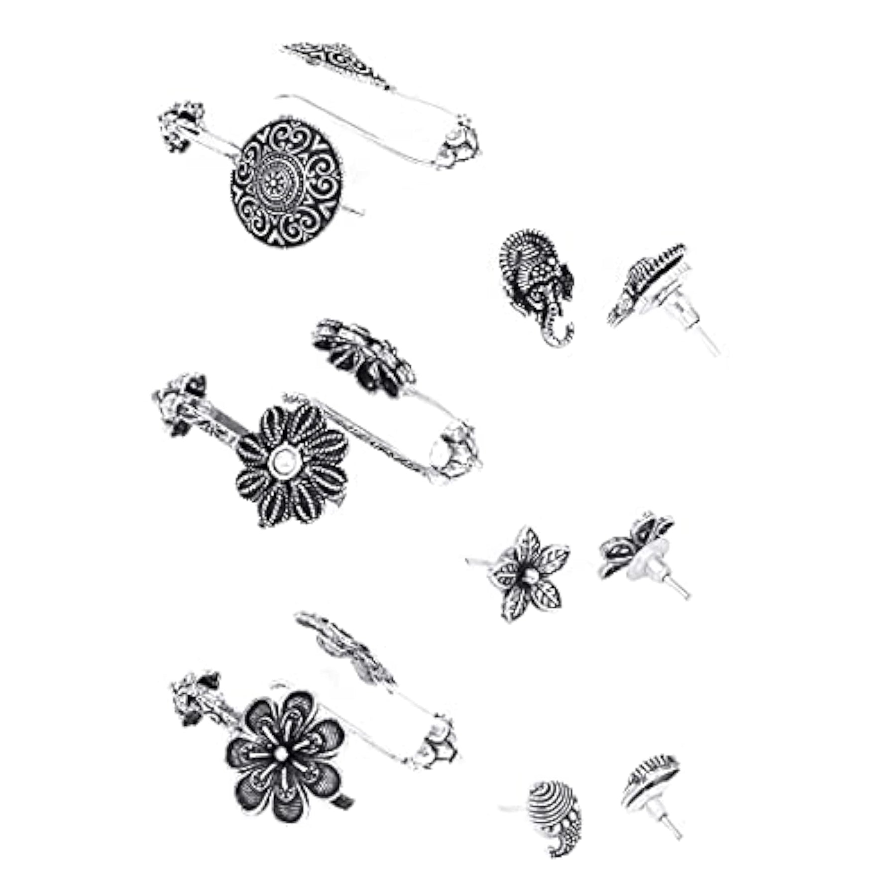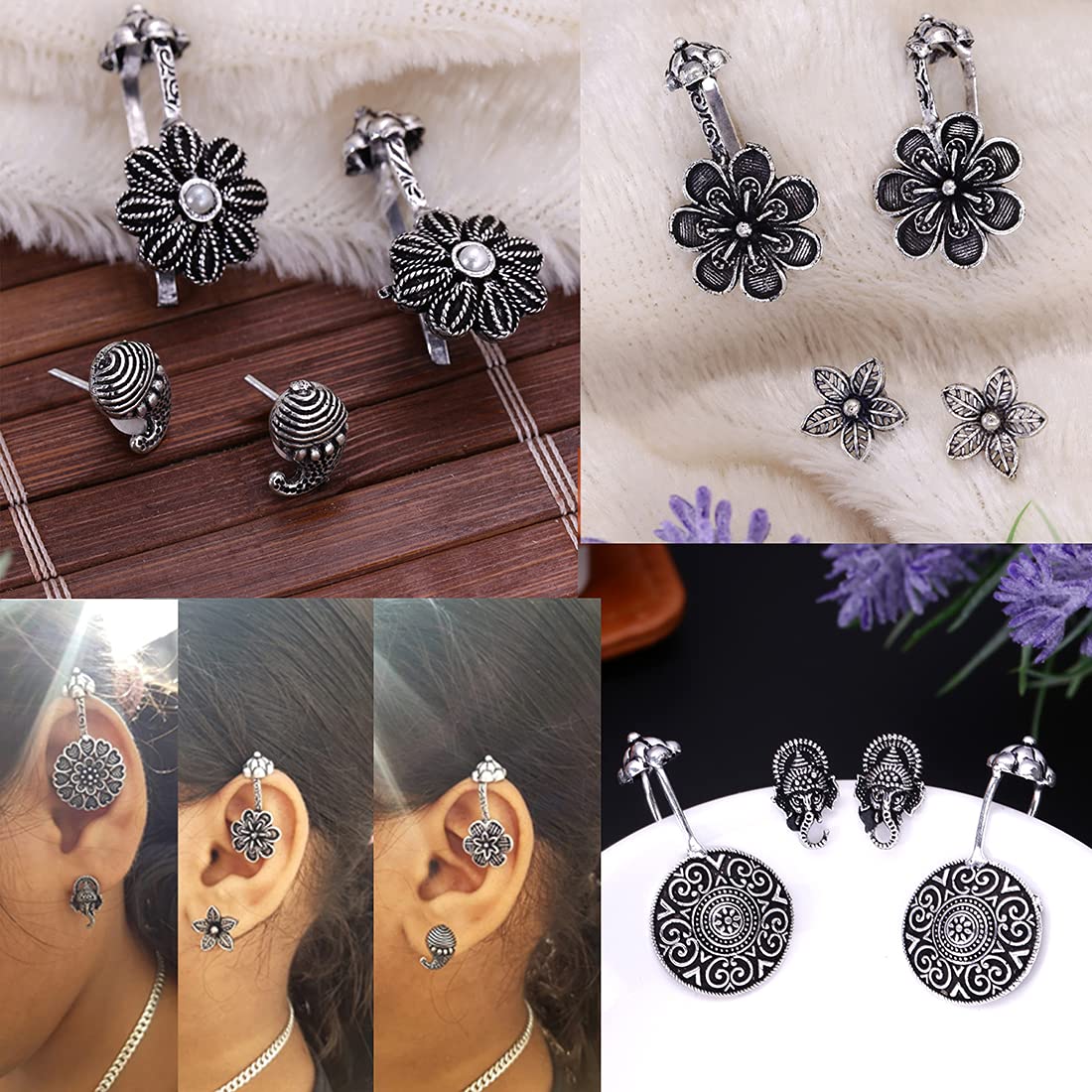 Elegant combo set includes oxidised ear cuffs and 3 pairs of floral traditional bugadi clip stud earrings for women and girls.