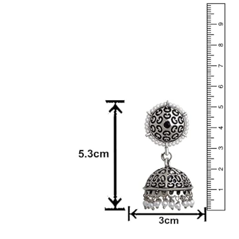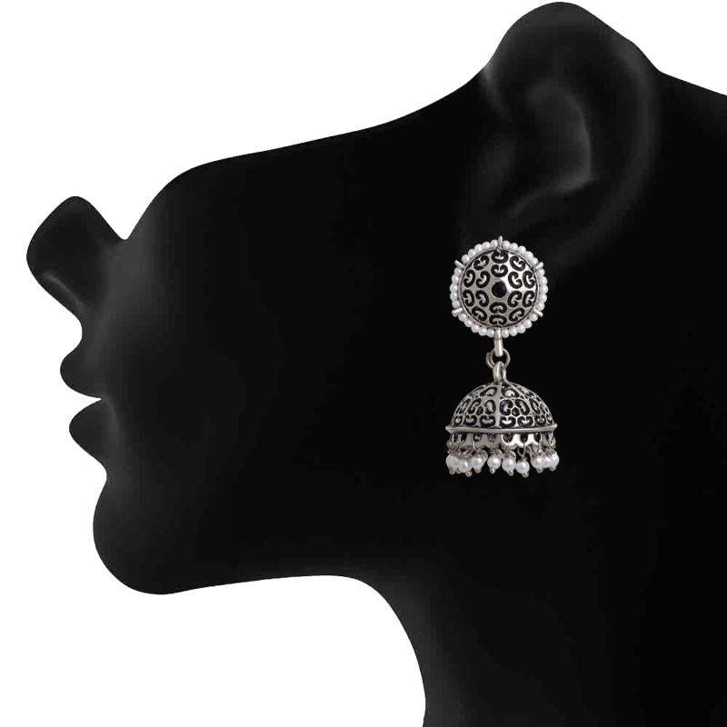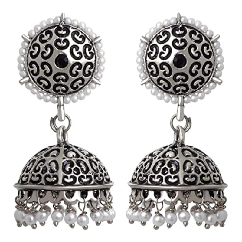 Beautiful jhumka earrings featuring traditional oxidised floral design and artificial pearls. Perfect for adding a touch of elegance to your look.