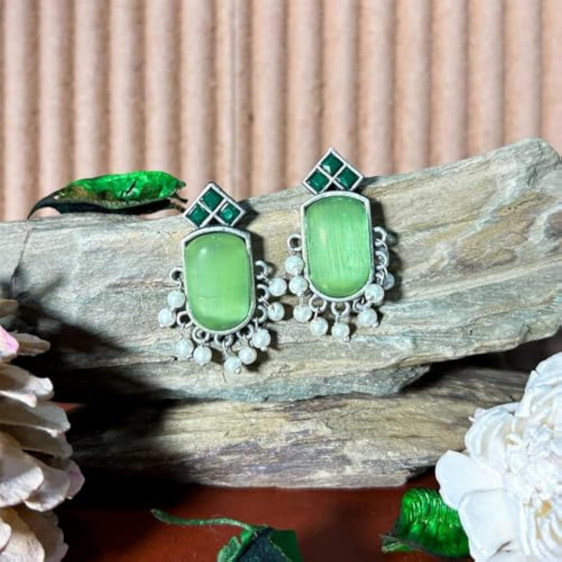 Elevate your style with these plated oxidised jade stone embossed earrings. Hypoallergenic design ensures comfort all day long.