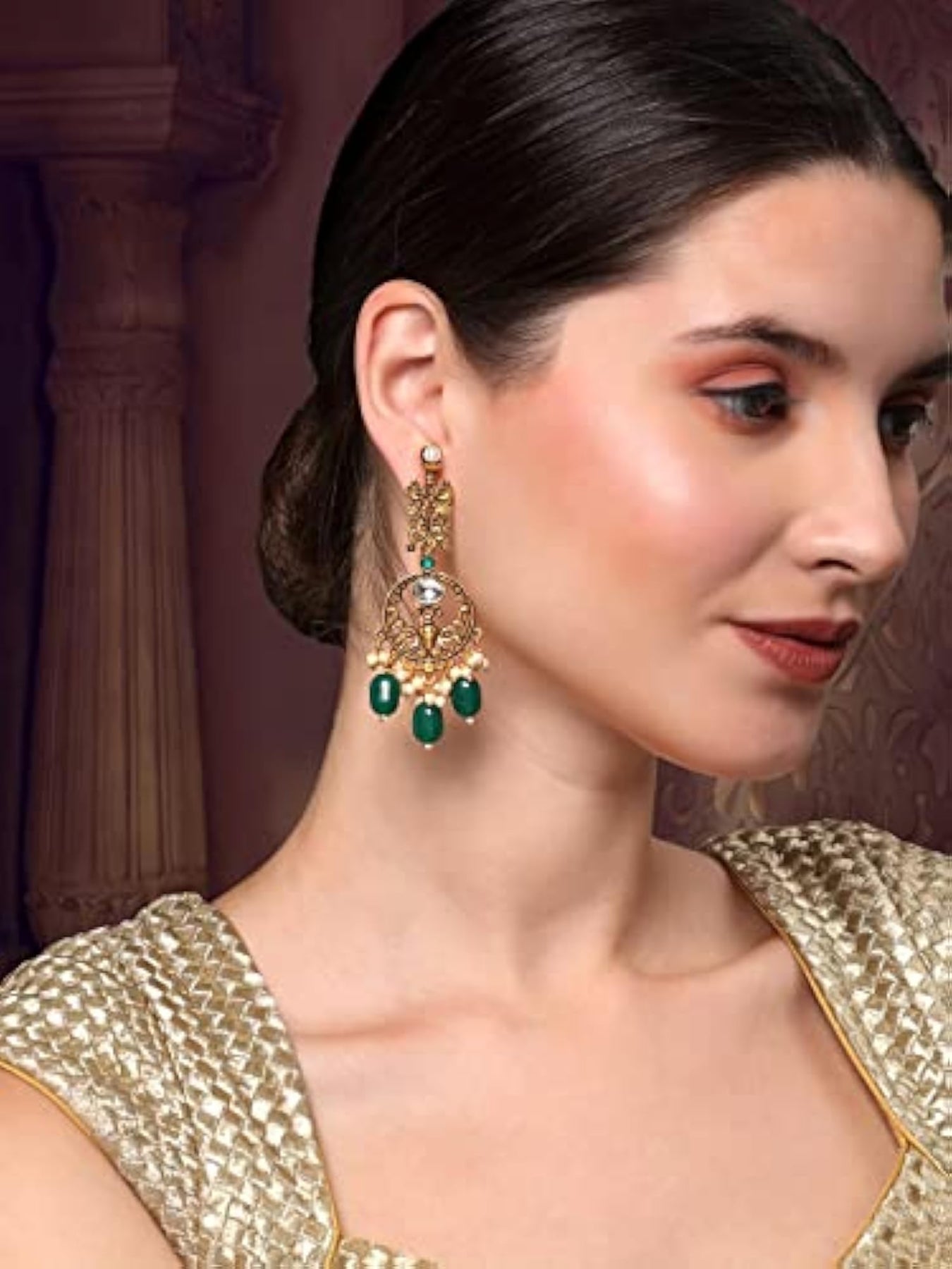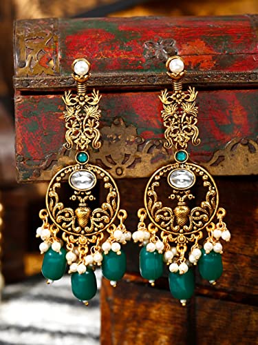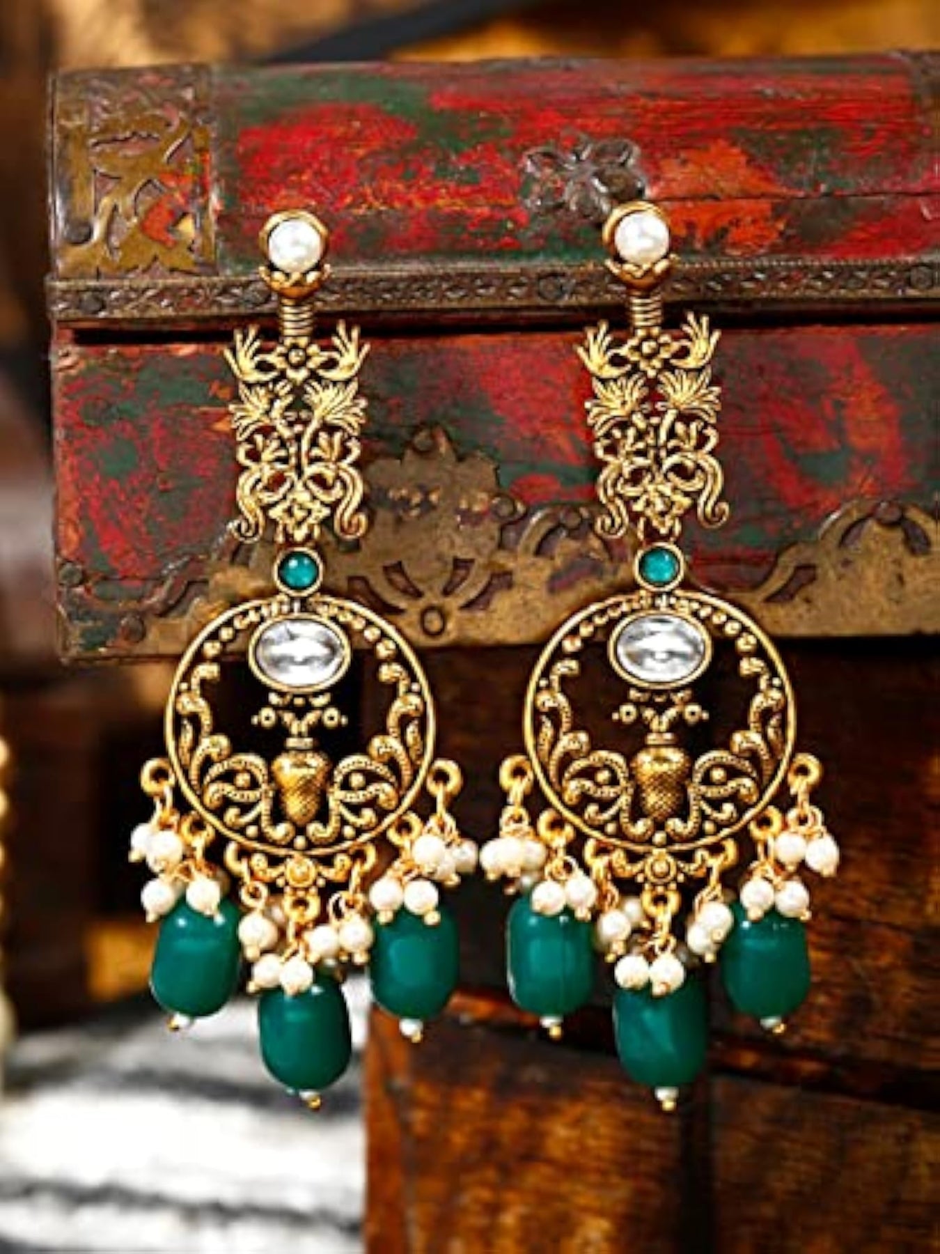 These elegant earrings feature a combination of pearls, crystals, and green beads in an oxidised setting.