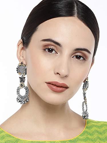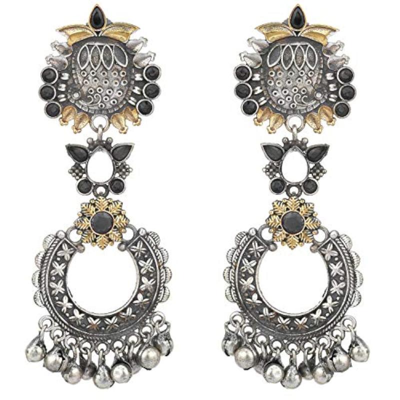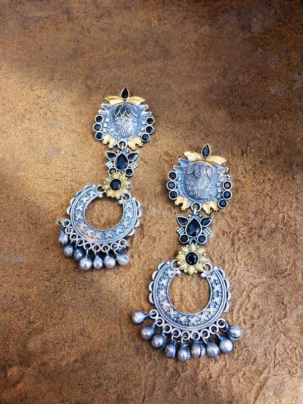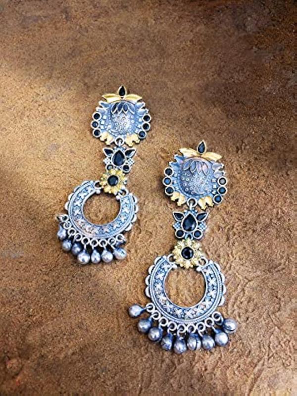 Add a touch of traditional Indian charm with these oxidised silver dangle earrings. Featuring intricate tribal design, these earrings are perfect for adding a statement to your look.