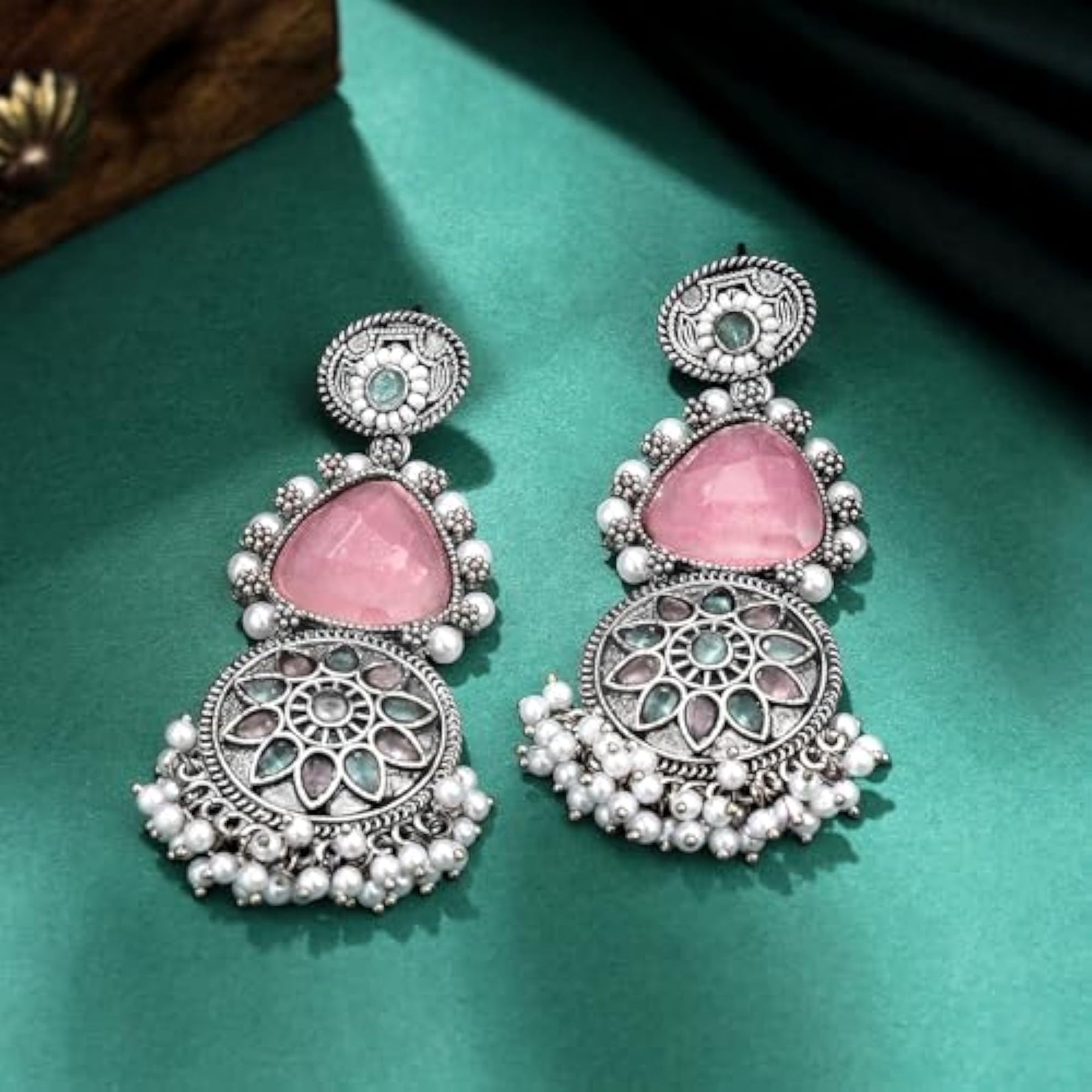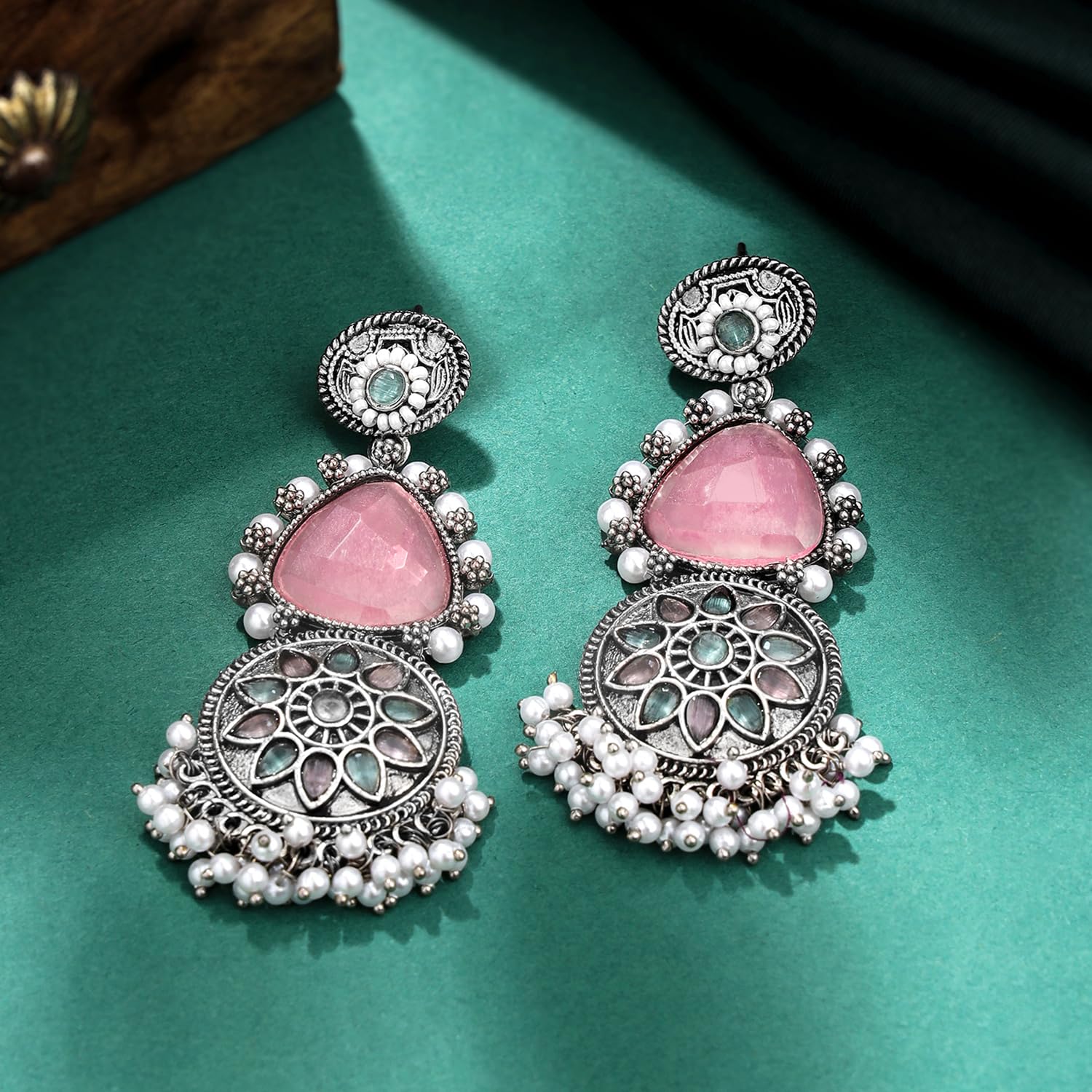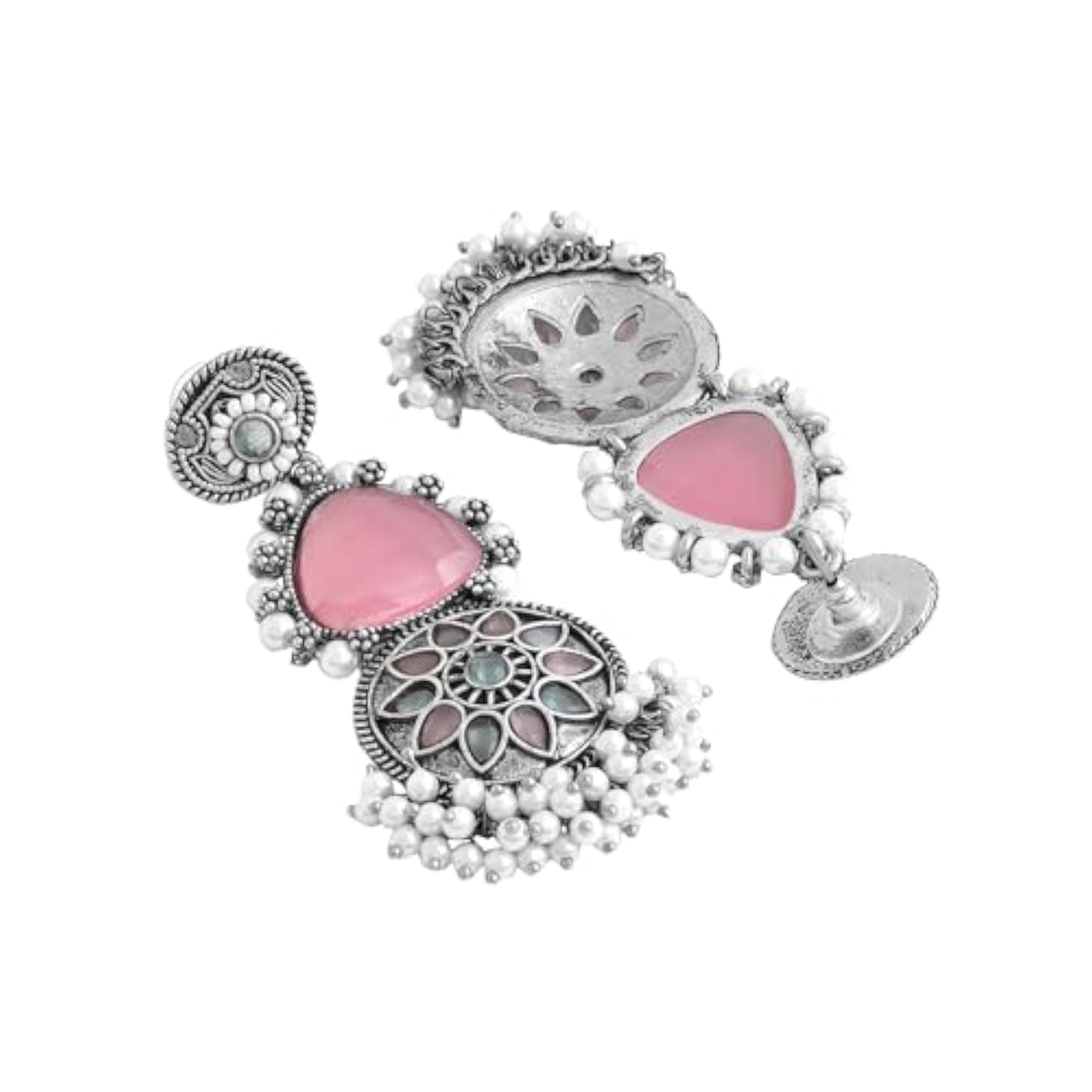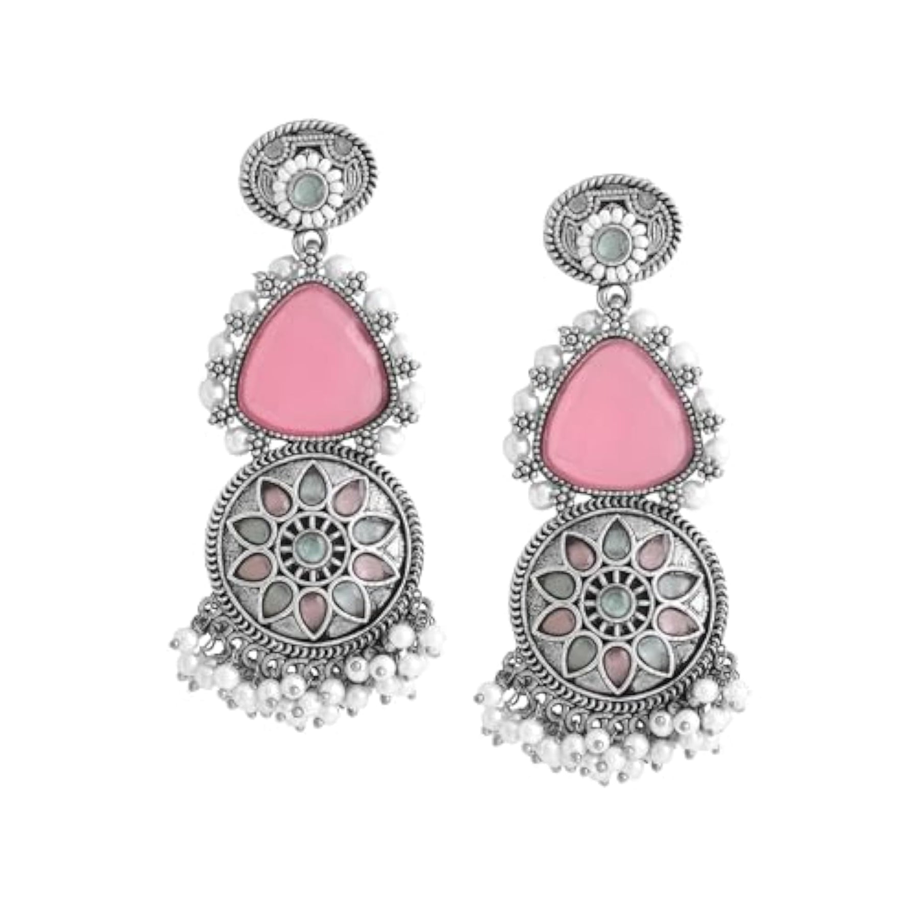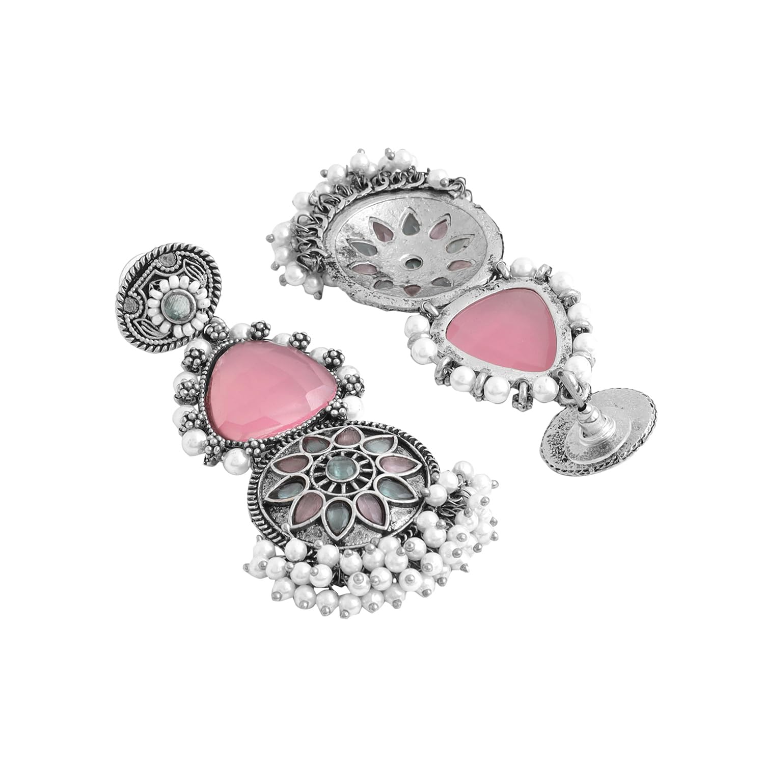 These traditional long dangler earrings are plated with oxidised silver and studded with pink stones. Perfect for birthdays and anniversaries.
