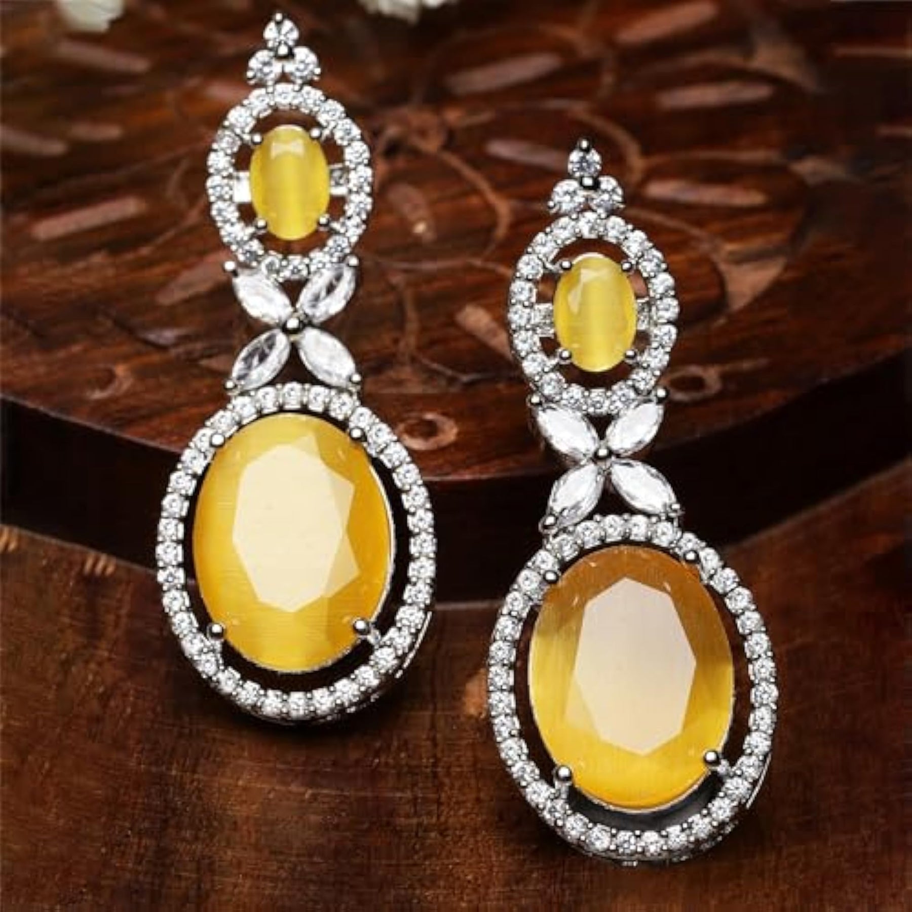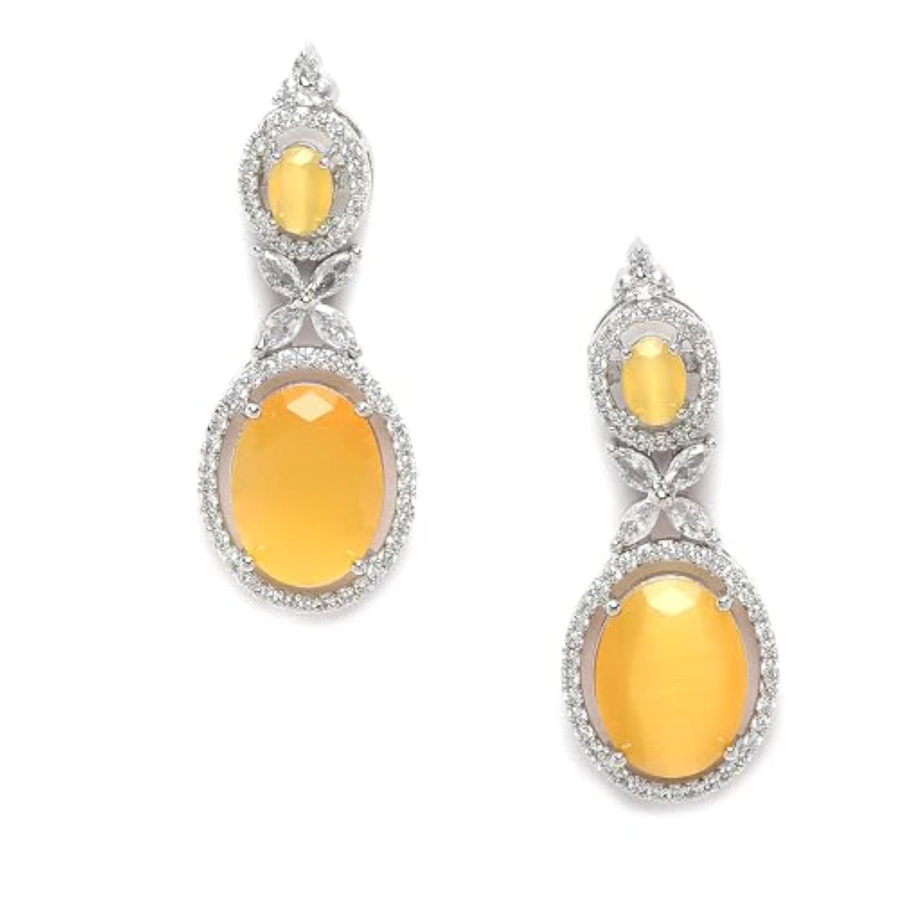 Add a touch of glamour to your look with these stunning oval shaped drop earrings featuring American Diamond studs. Perfect for any occasion!
