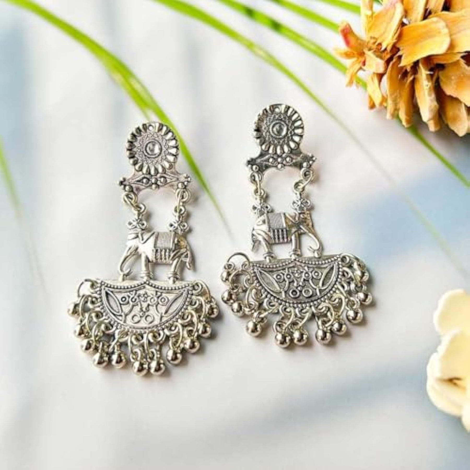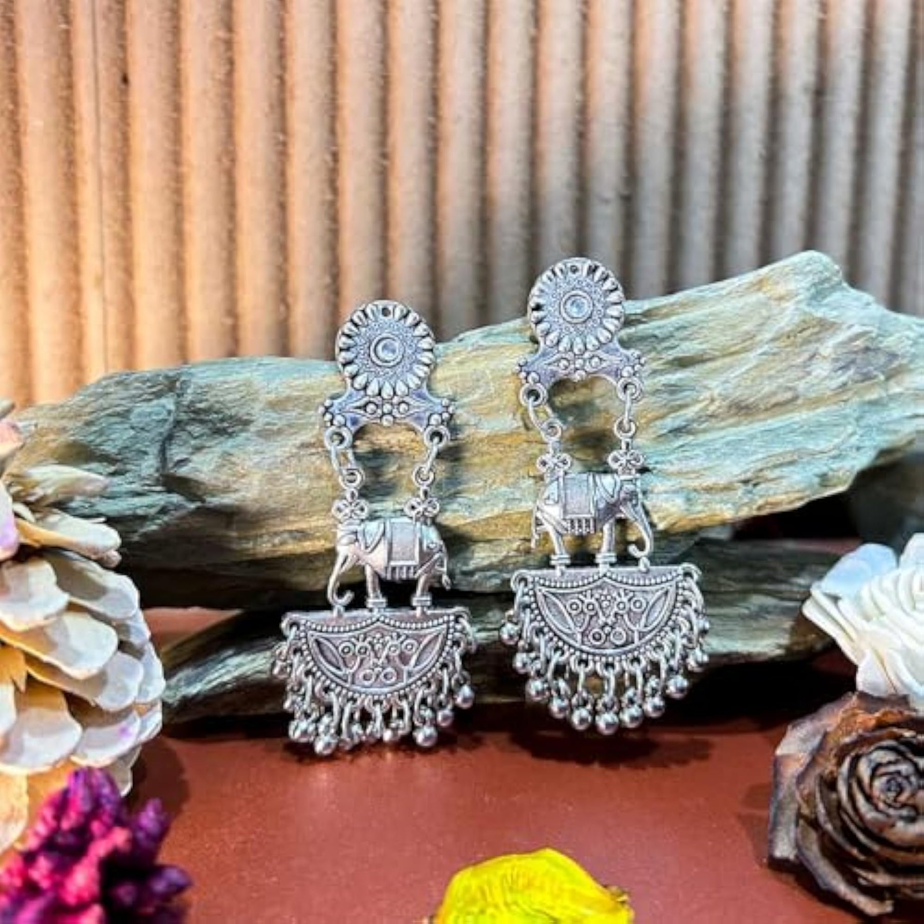 Elevate your traditional look with these plated oxidized elephant motif dangling earrings. They are a perfect addition to your stylish collections.
