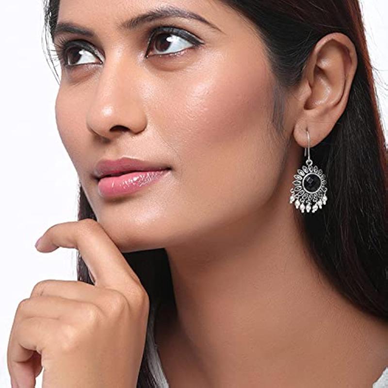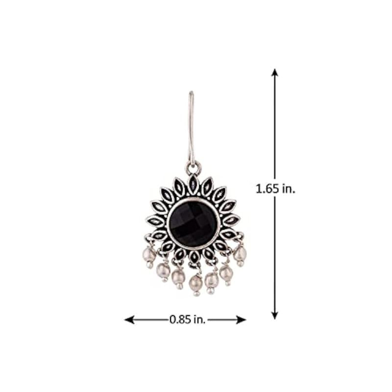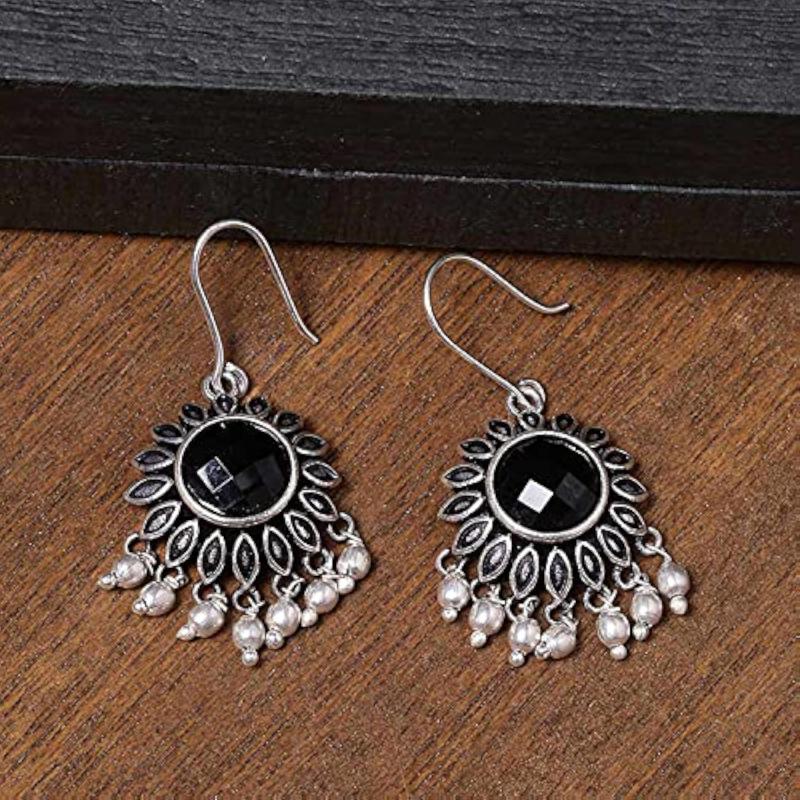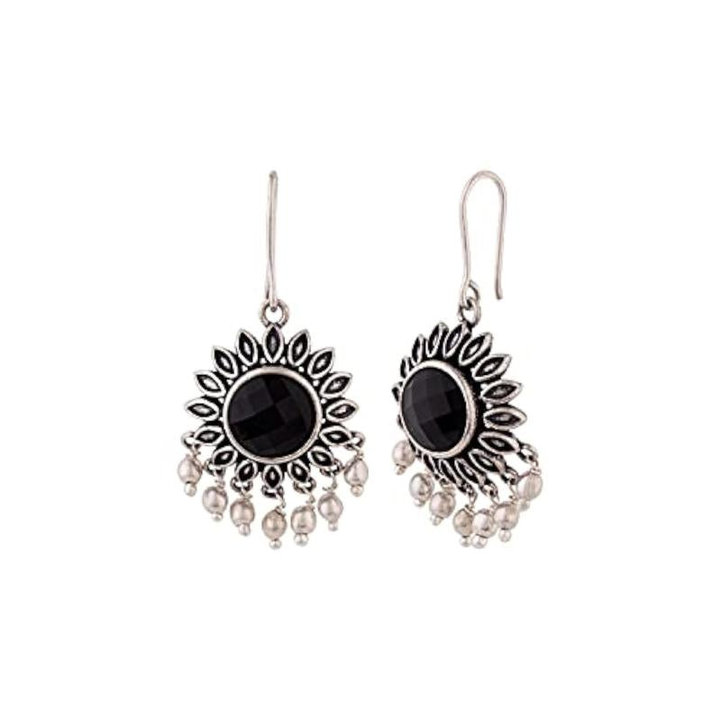 Elegant flower-shaped dangler earrings featuring brass oxidized silver plating and a beautiful stone. Perfect for adding a touch of style to any outfit.